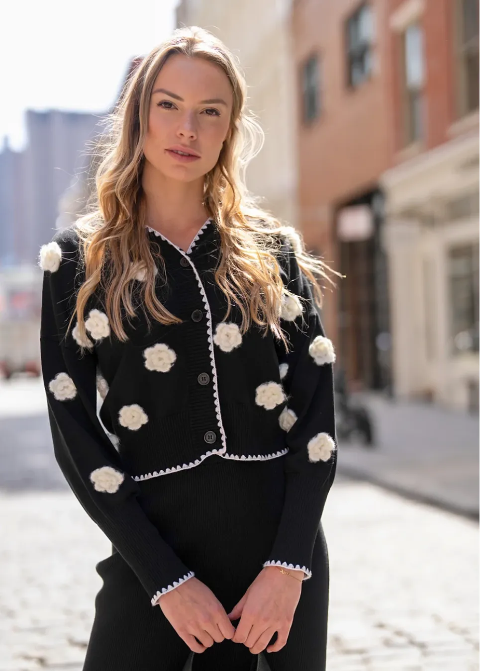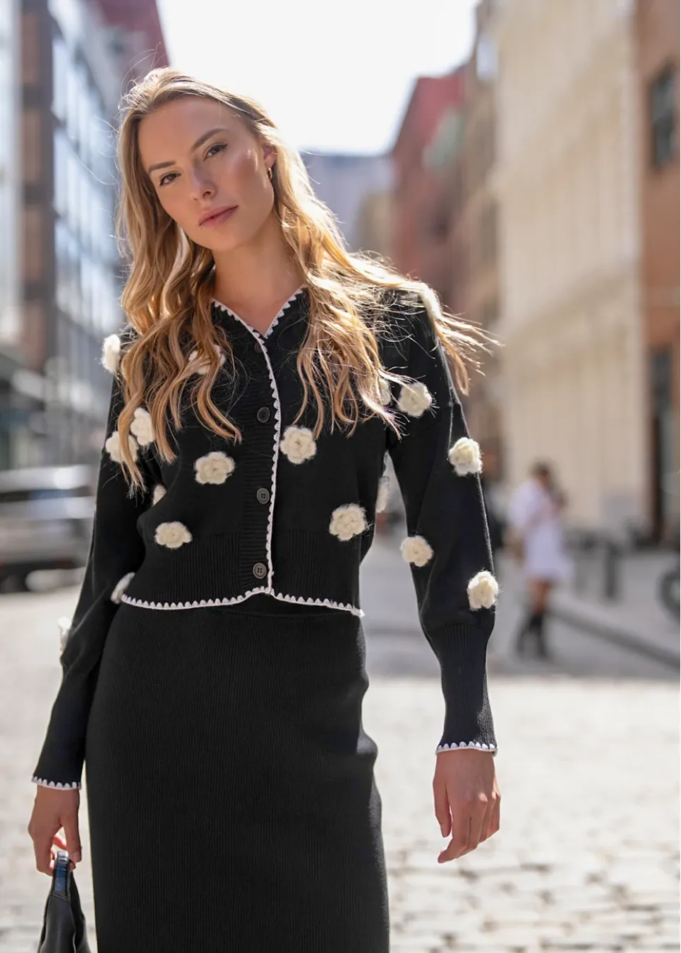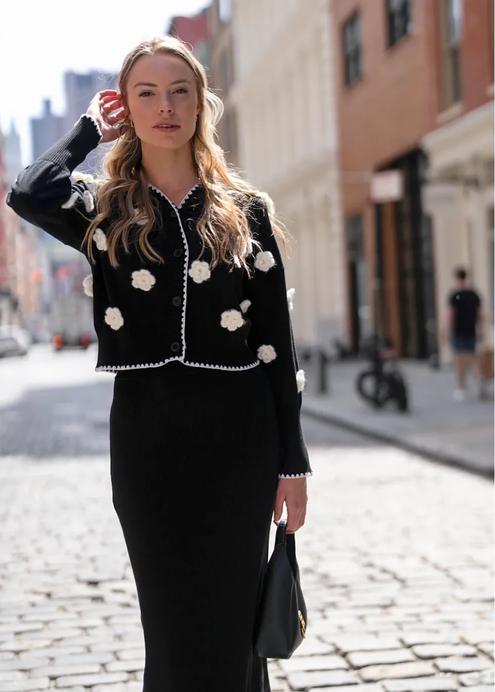 3D floral accents bring runway detail to an otherwise simple cardigan-and-skirt look. An outfit that makes everyday city dressing feel stylish and bold.