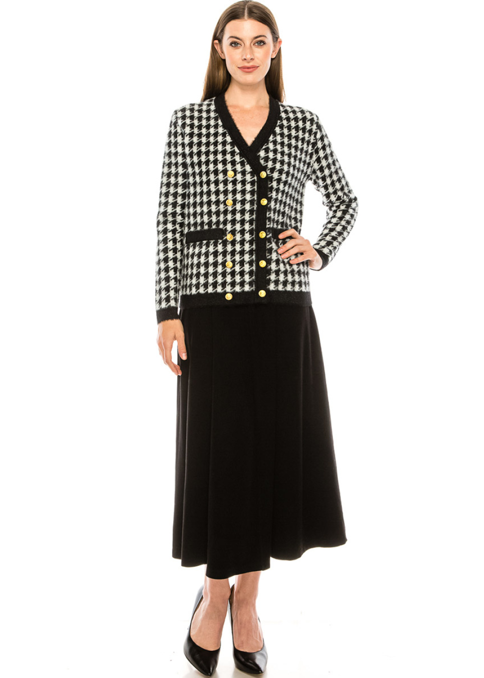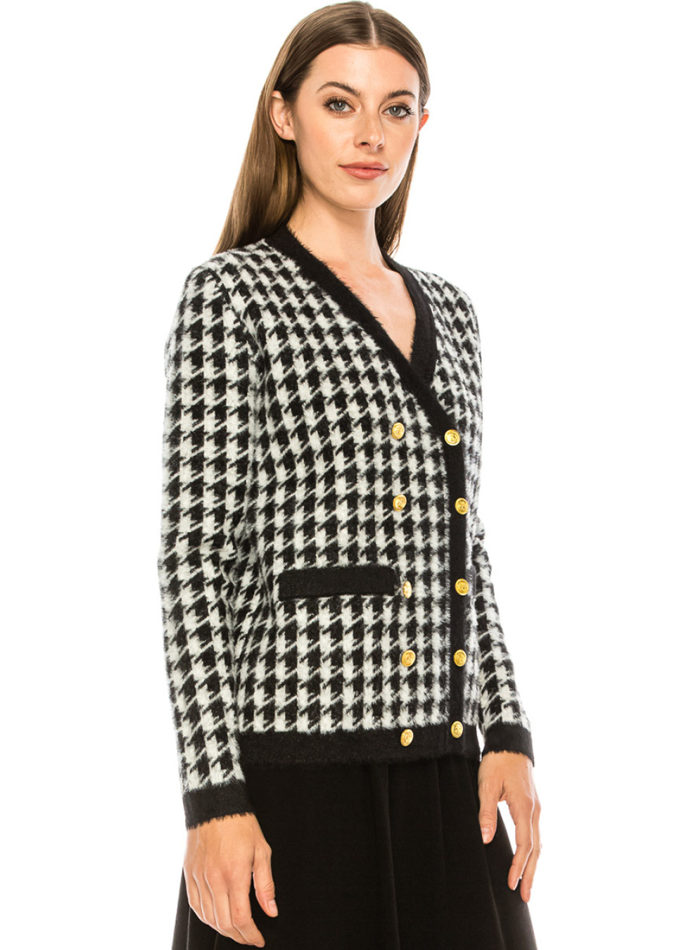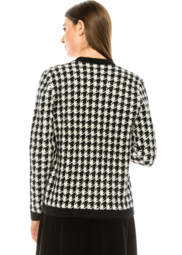 A houndstooth print cardigan with accent details