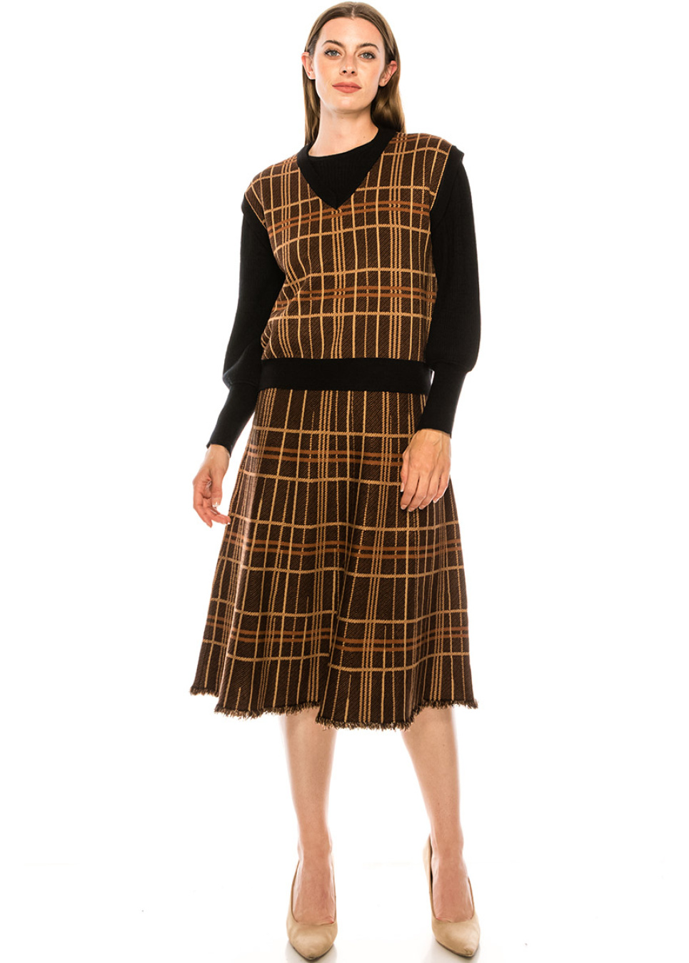 Take a look at this cozy skirt with a timeless checkered pattern. The garment is well-tailored, does not restrict movement, and is impressive in appearance and quality. Fringe edge adds a design its modern twist. The A-line silhouette is super comfy and flatters every body type.