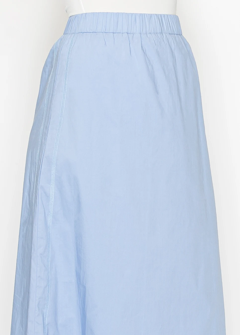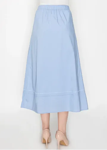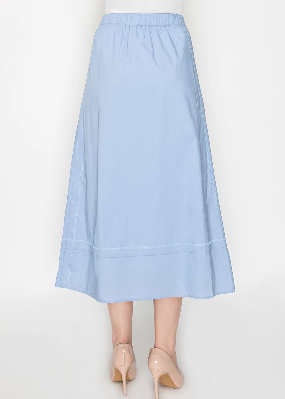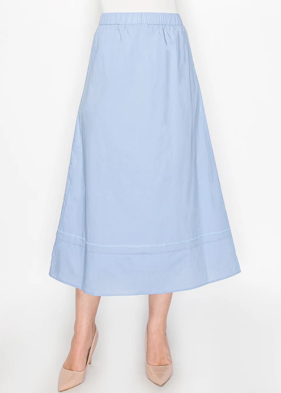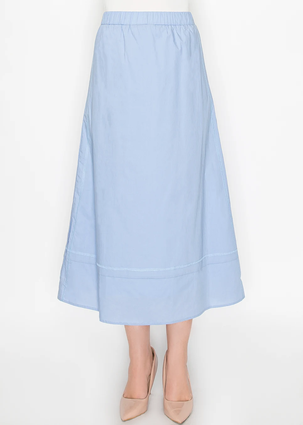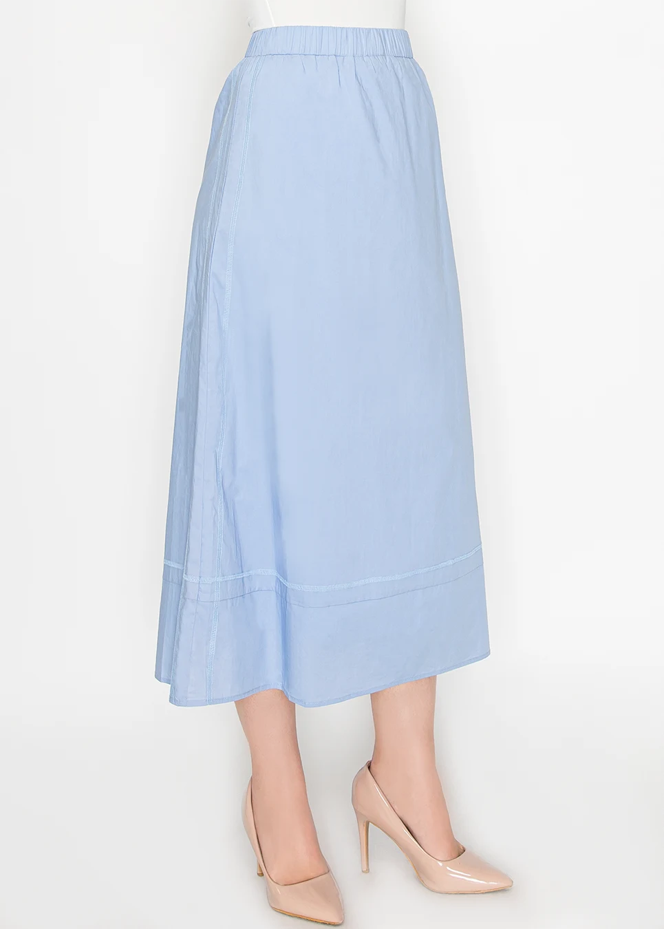 Some skirts need the right top, the right shoes, the right occasion. This one needs a top and that's about it. Light blue cotton A-line midi, elastic waist, stitched hem band. The color handles the rest.