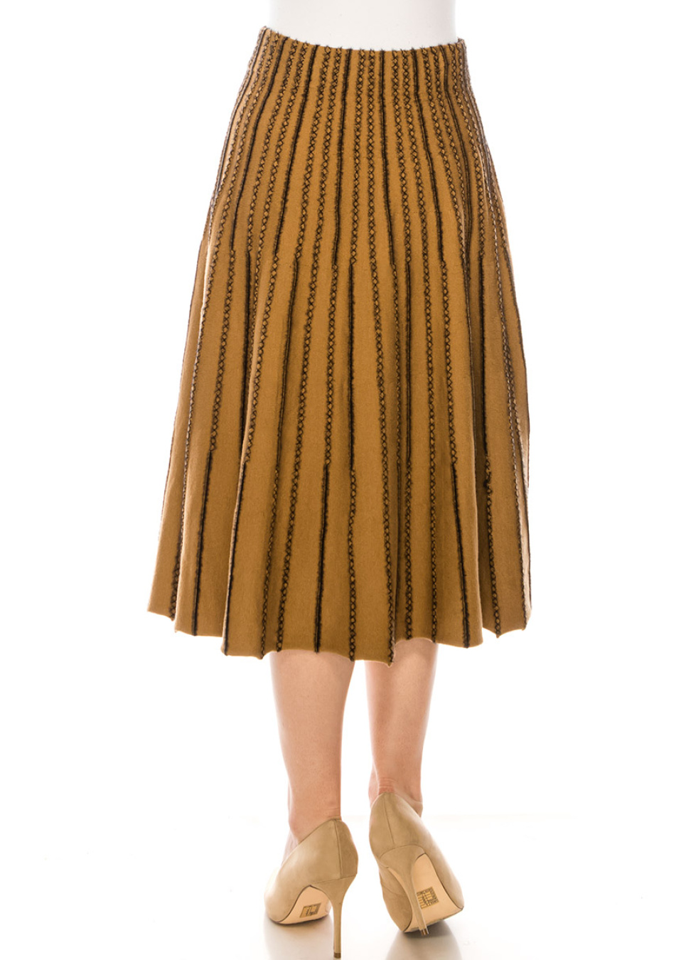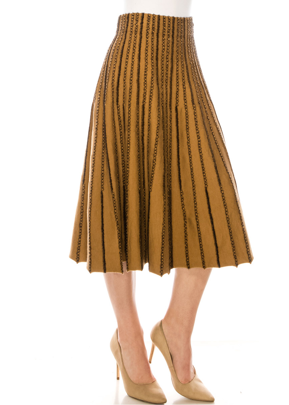 Wear this camel A-line skirt to show your refined, laid-back casual style. This midi skirt is skillfully stitched in a classic style from a soft, high-quality fabric. The embroidery provides a unique and trendy touch to your style.