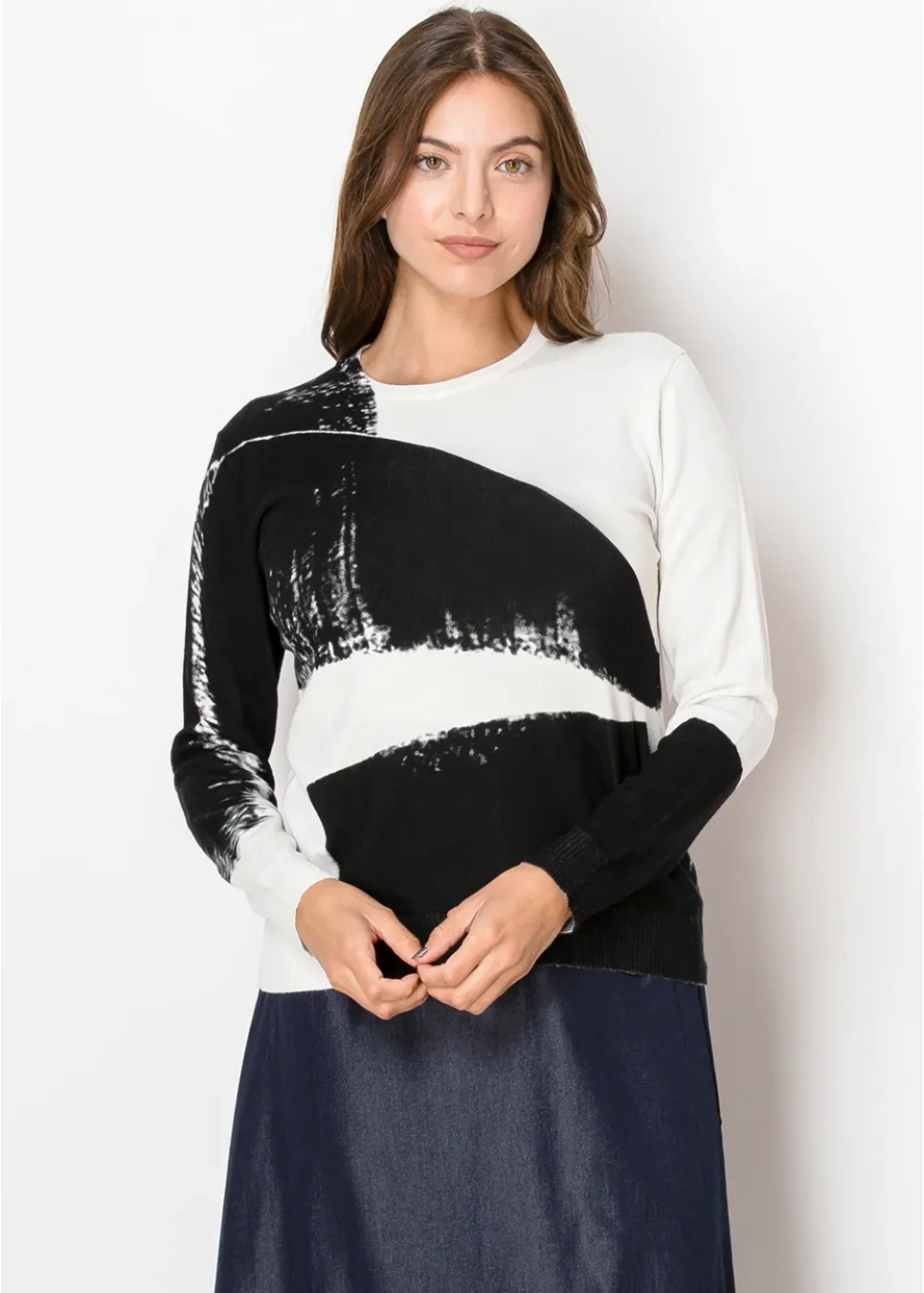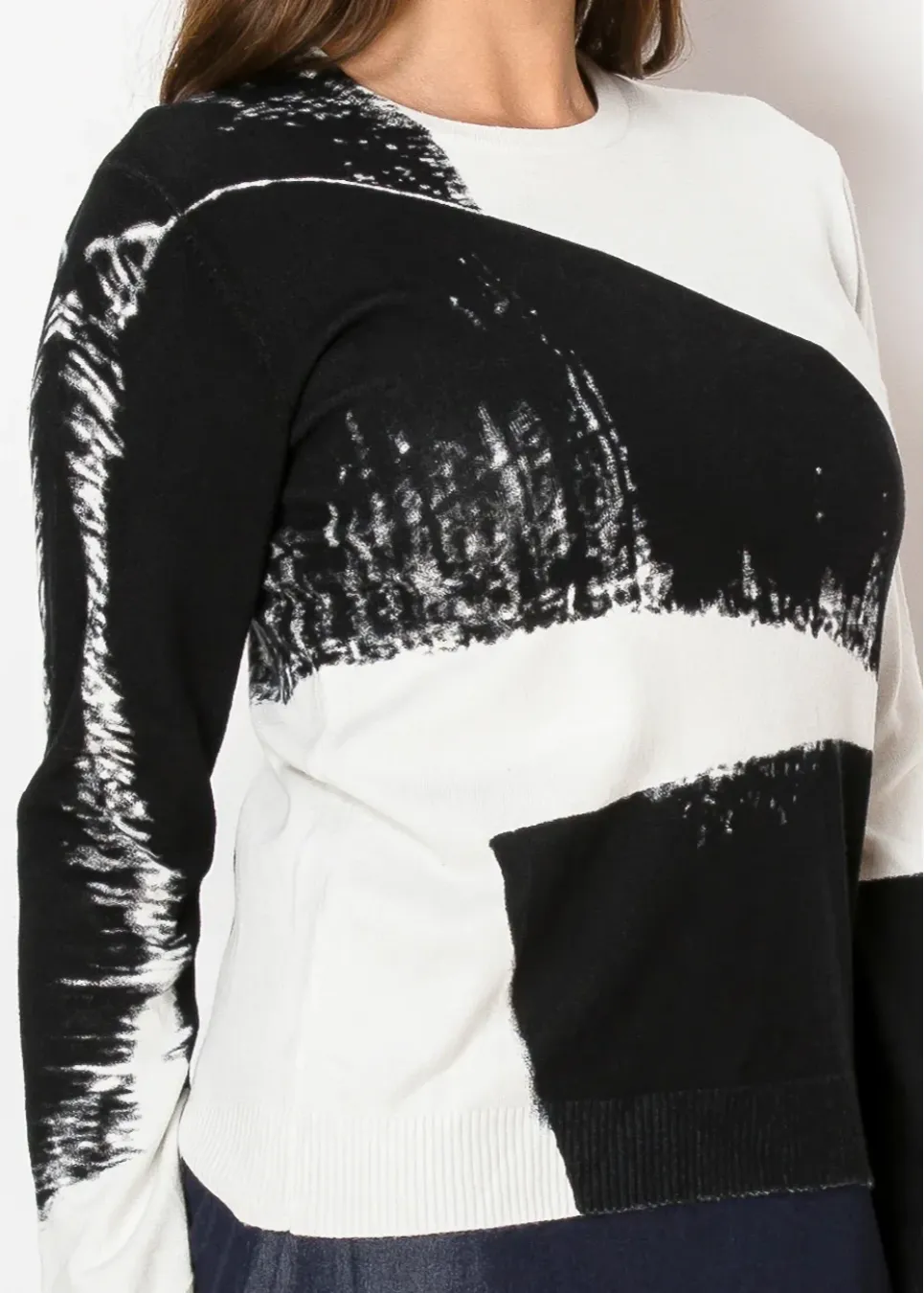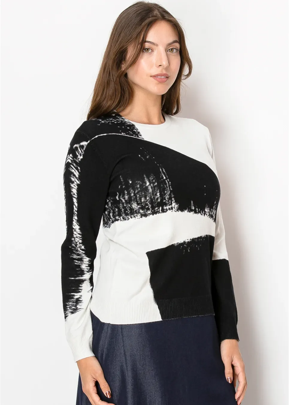 Channel an artistic vibe with this black and white pullover. The bold, sweeping pattern makes a statement, while the cozy knit and relaxed fit ensure all-day comfort.
