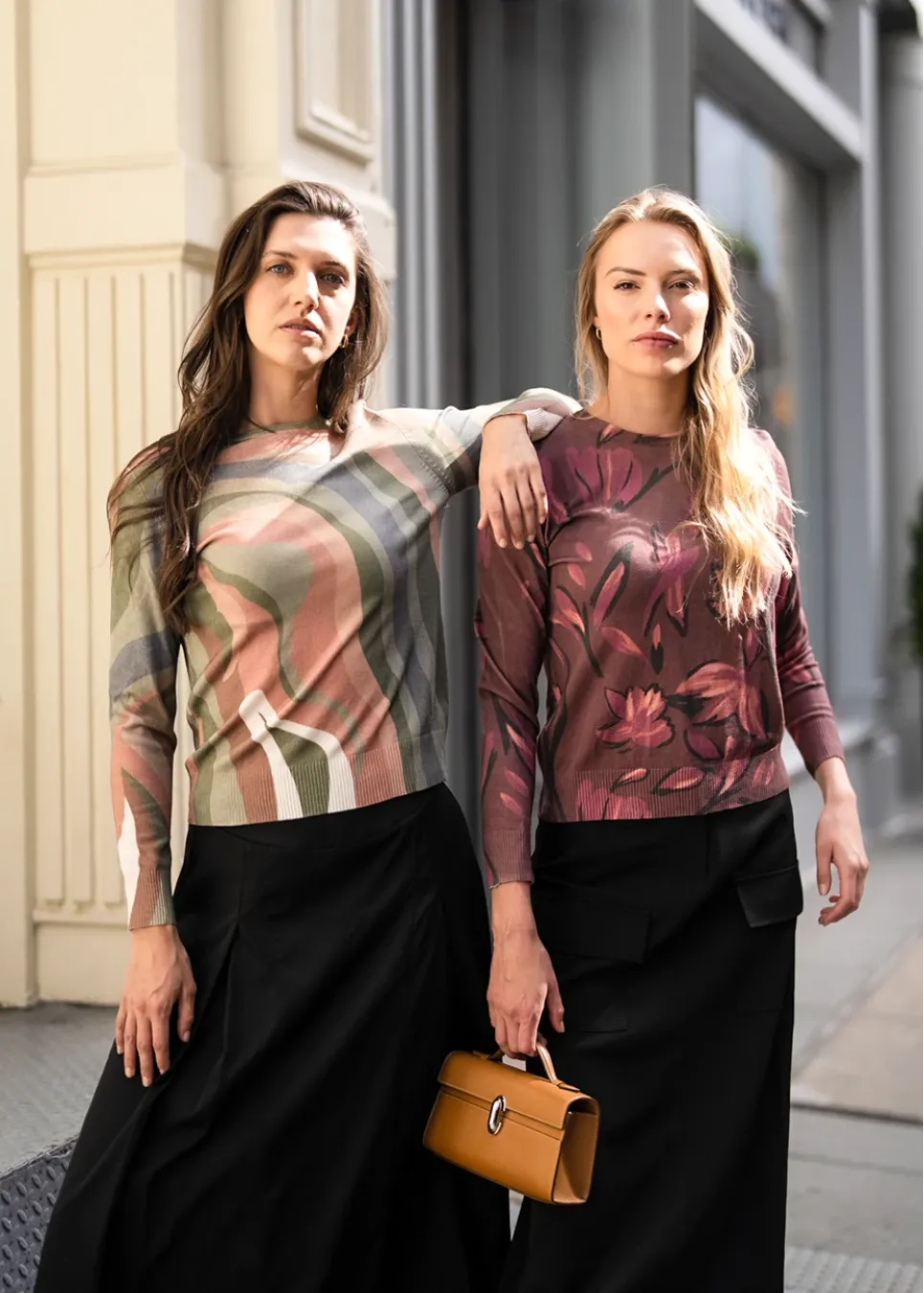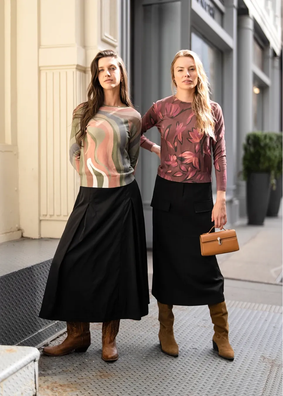 Fall’s easy elegance in one look. The swirled knit top adds color and depth to the clean black skirt, creating an effortless day-to-evening outfit.