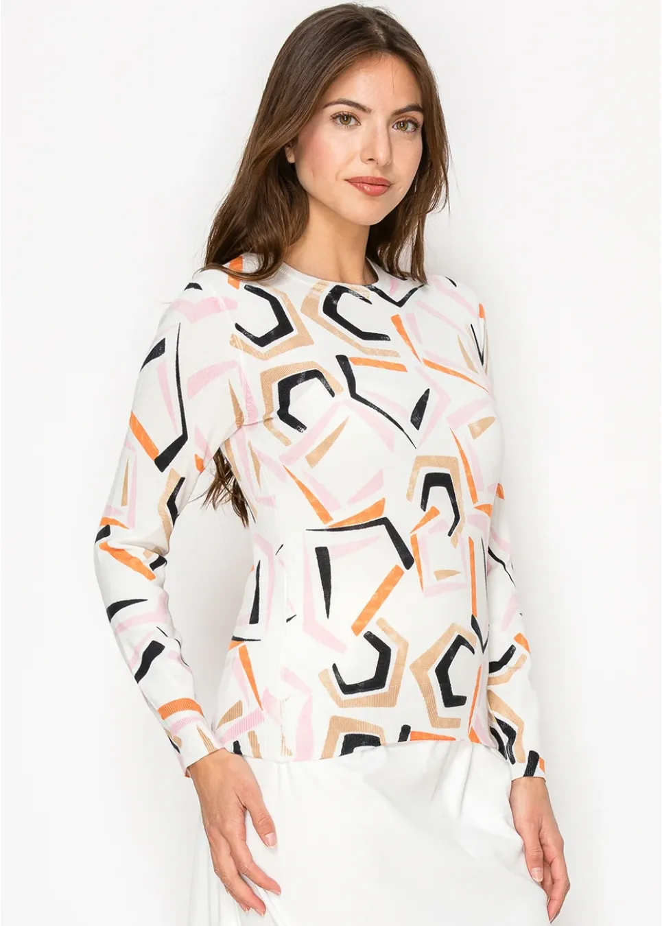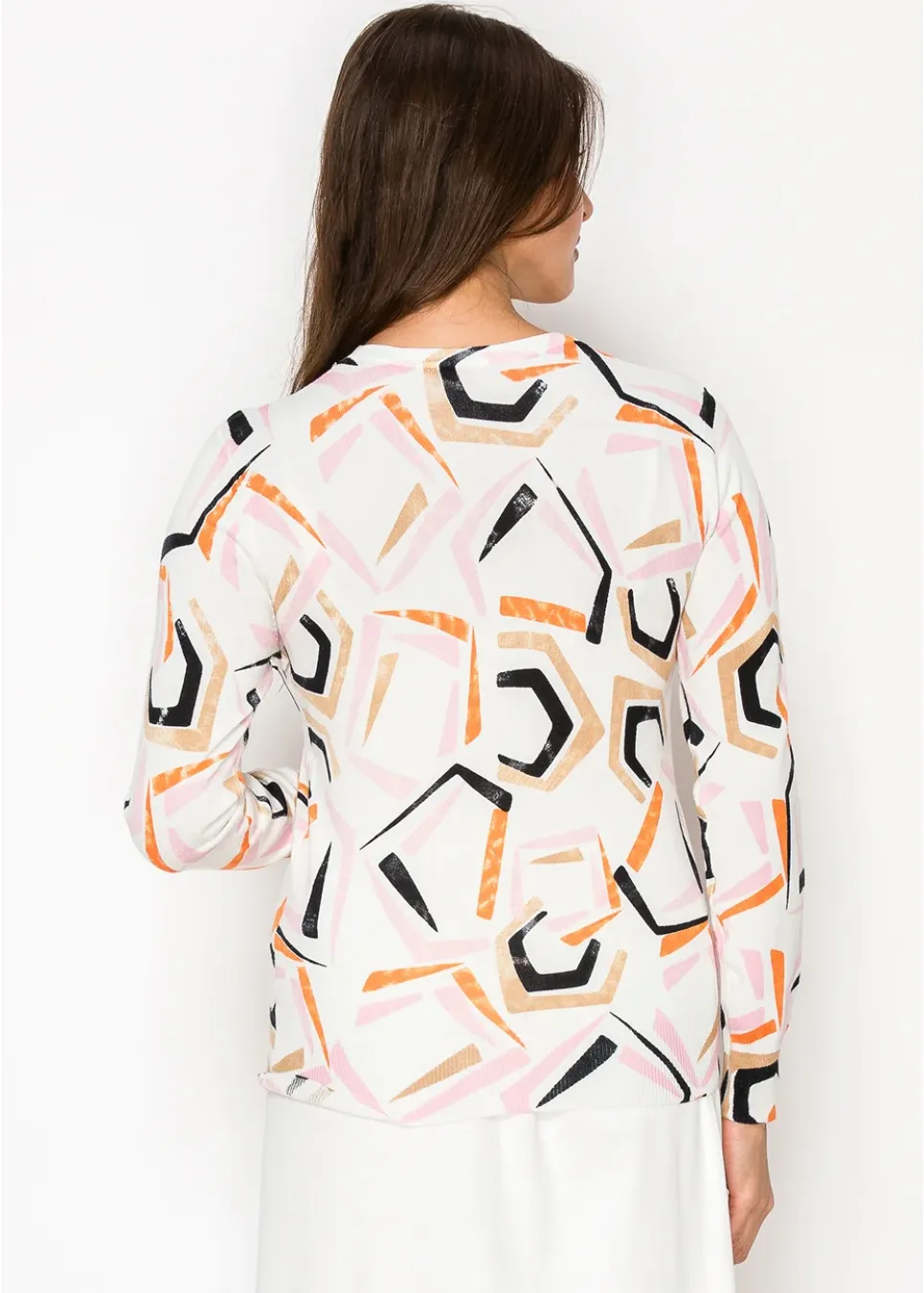This lightweight sweater brings a modern touch with its playful abstract print. The mix of warm and cool tones on a soft white base makes it an easy statement piece for any outfit.