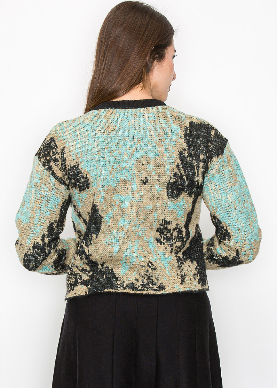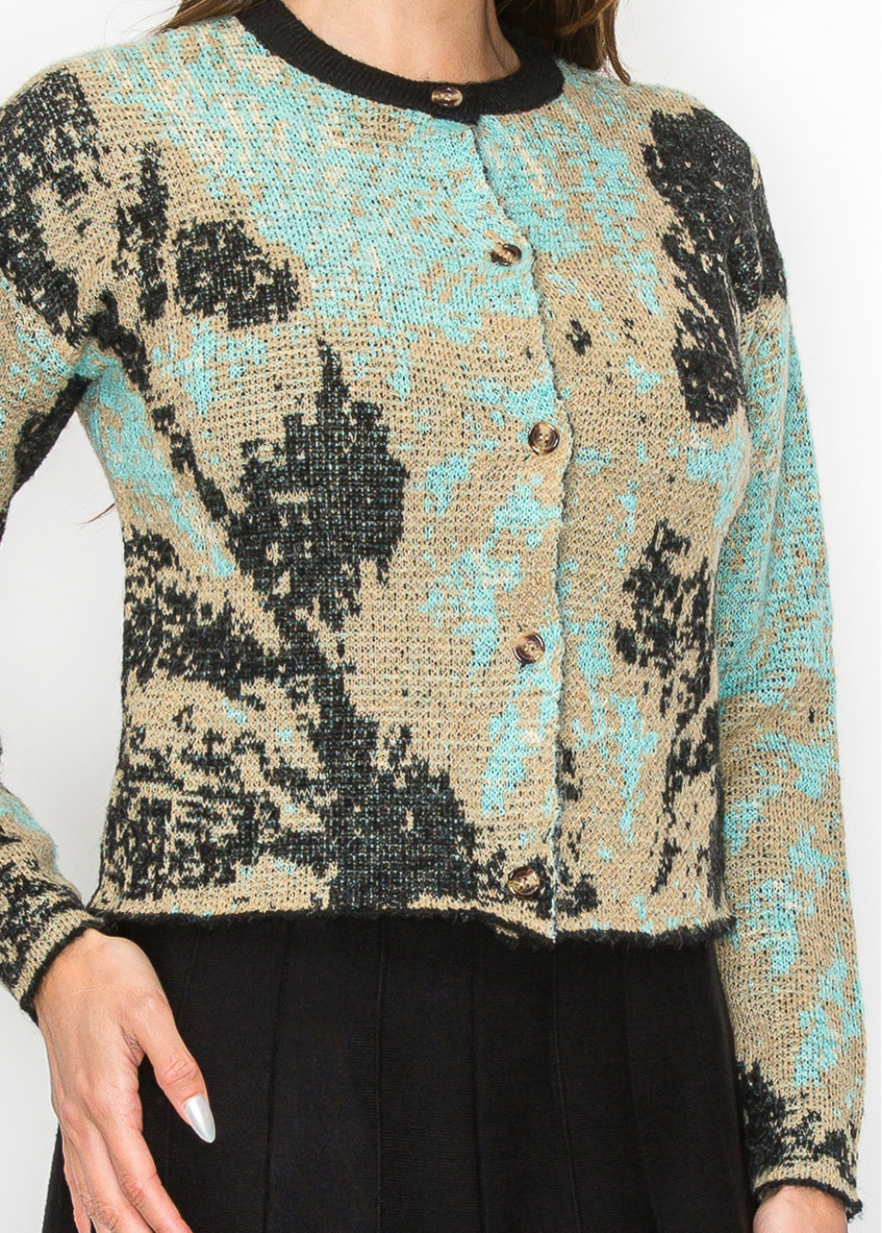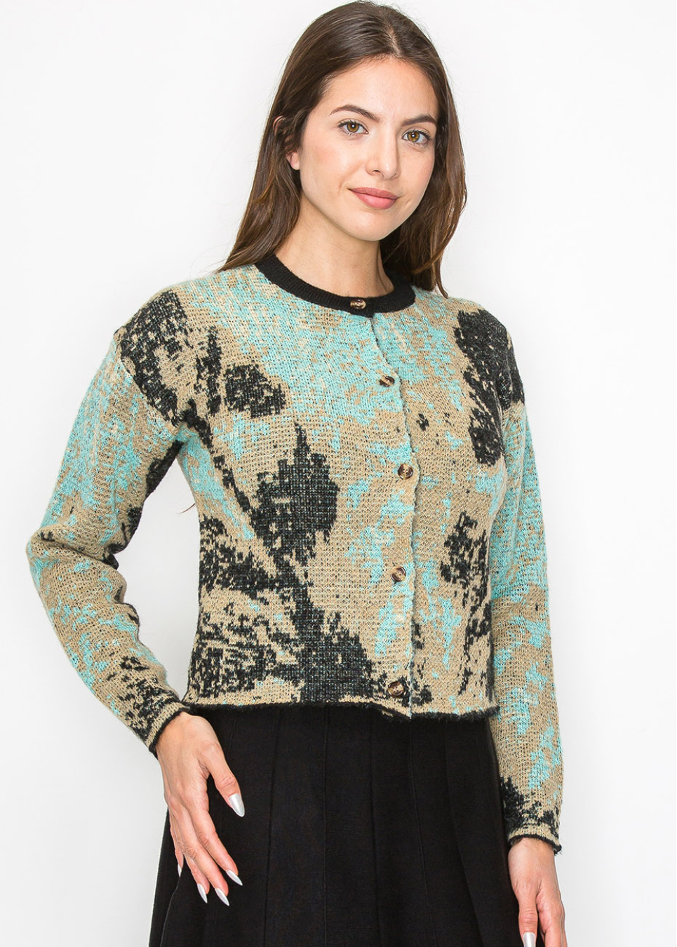 With a print reminiscent of nature’s unpredictable beauty, this beige cardigan accented with turquoise and black offers a fresh take on knitwear. The button-front design keeps things simple, while the bold pattern elevates any modest outfit, making it both stylish and comfortable.