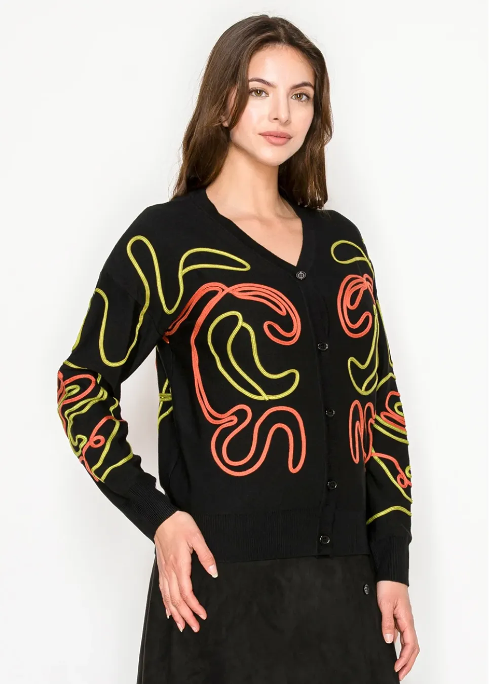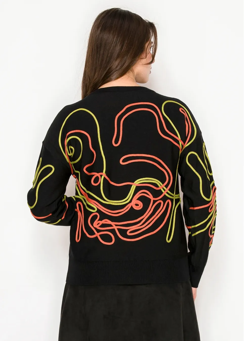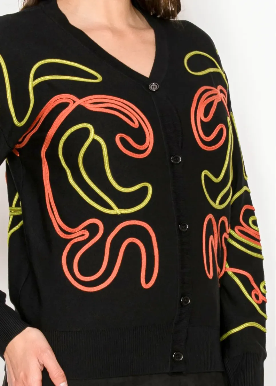A striking mix of black knit and neon embroidery gives this cardigan a gallery-worthy look. Sophisticated in cut, yet daring in detail.