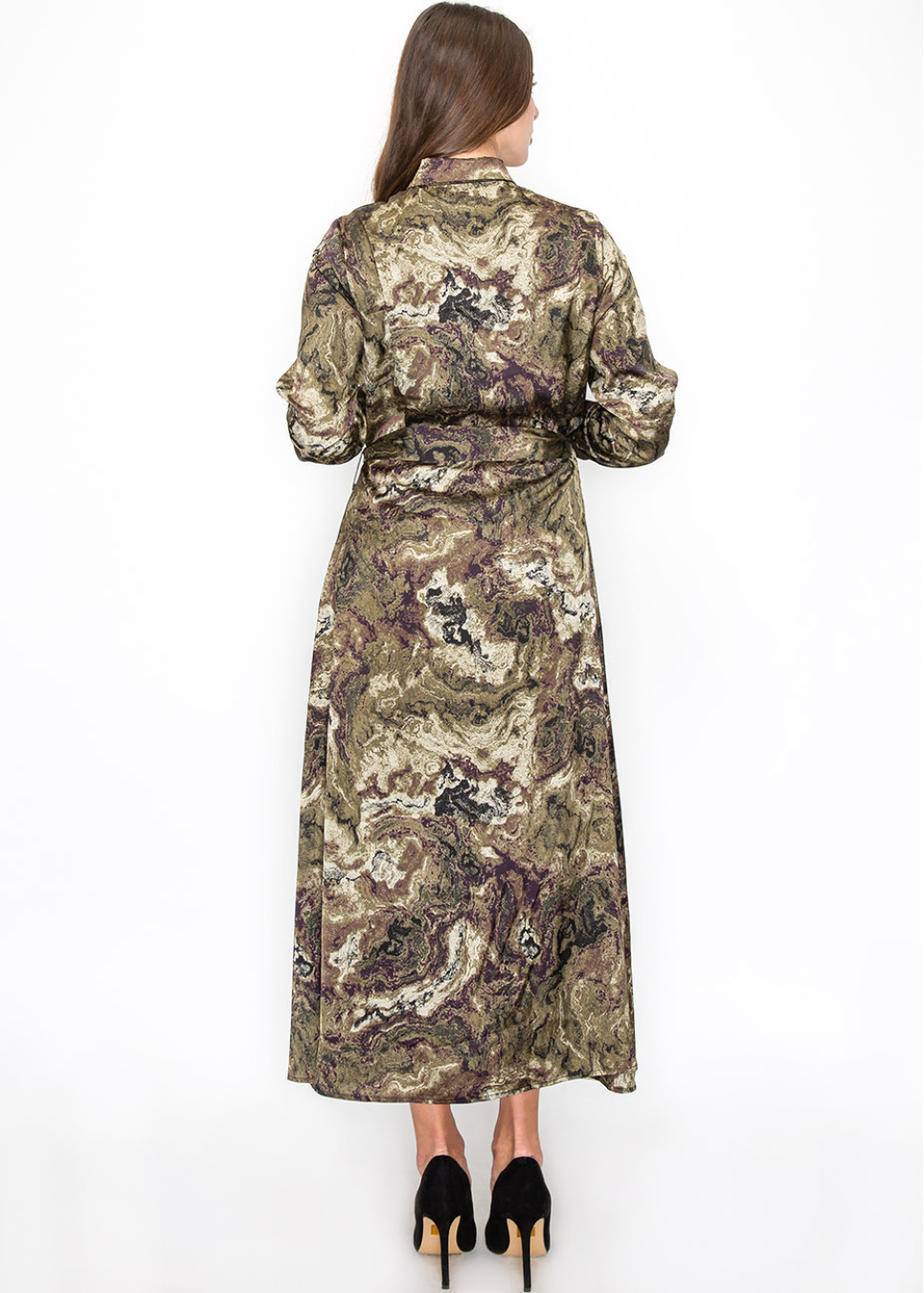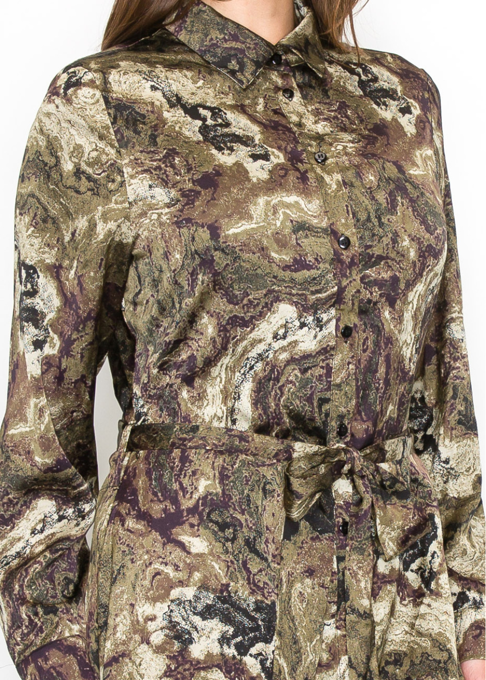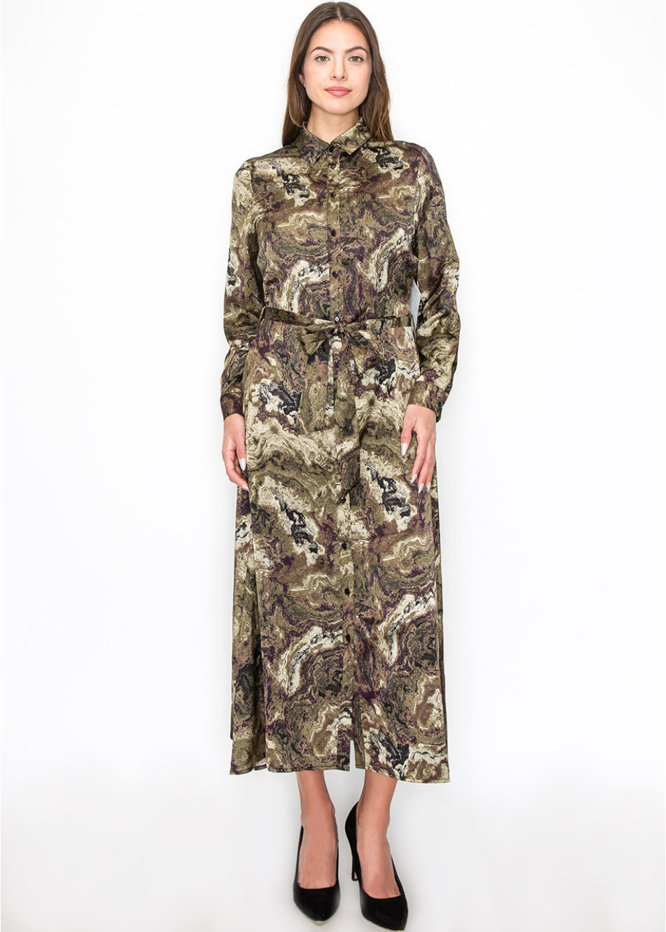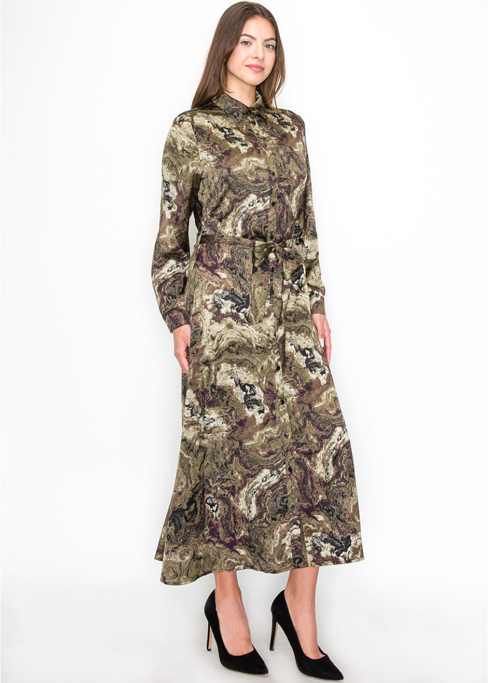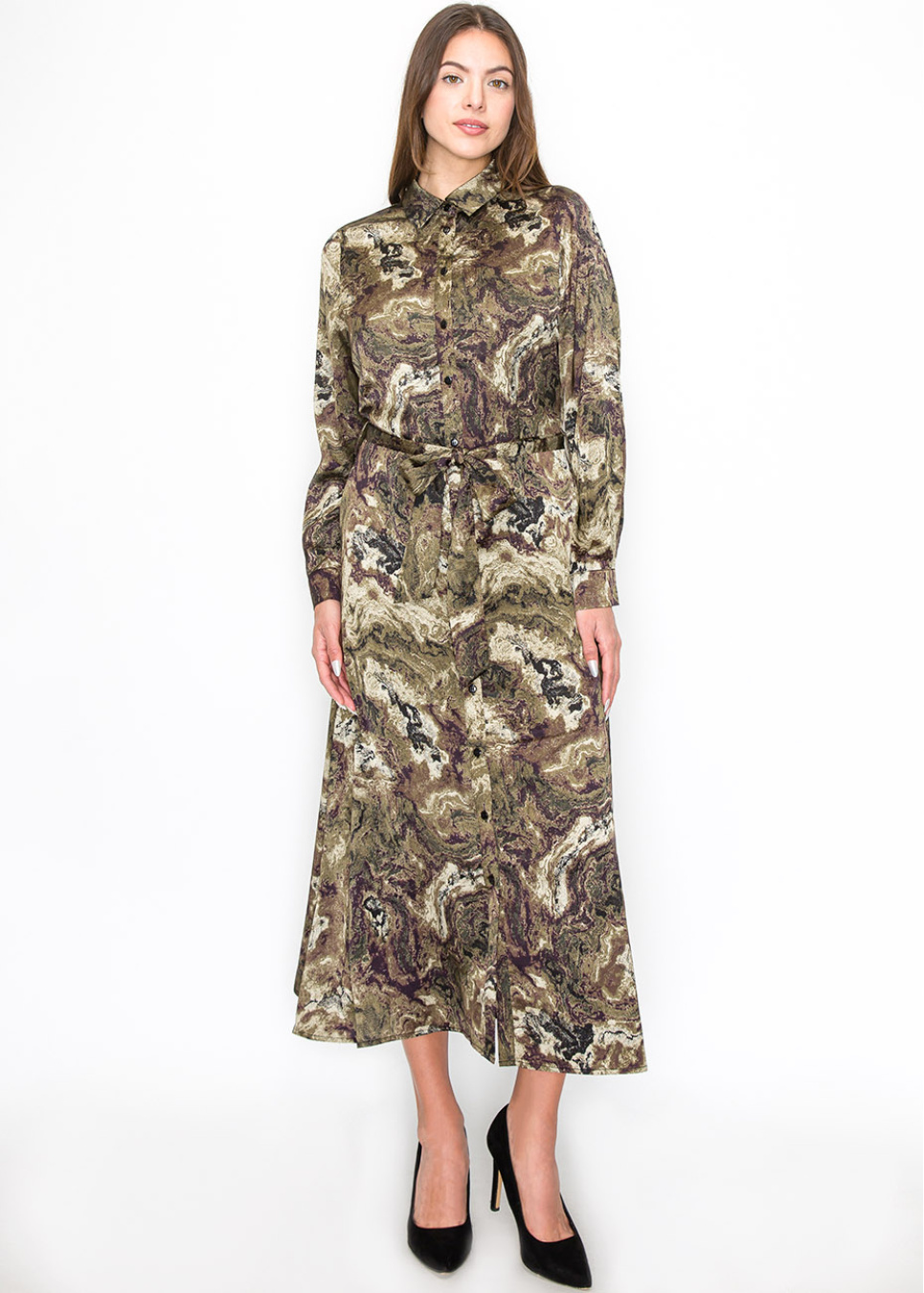 Designed with an abstract swirl of olive and brown, this dress offers an eye-catching yet modest option. The belted waist creates a classic silhouette, while the button-down front and long sleeves make it practical and appropriate for any occasion. A great choice for women who want a unique, natural-inspired look.