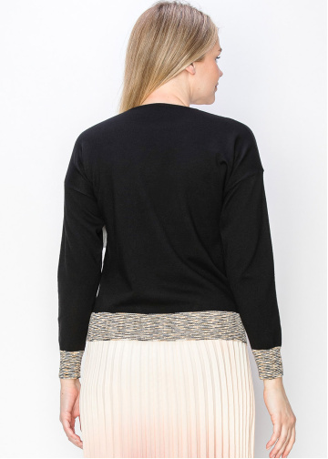 Embrace a bit of artistic flair with this pullover. The abstract patches create a modern look against the black backdrop. The textured trim adds a stylish finish, making this sweater perfect for adding a unique touch to your outfit.