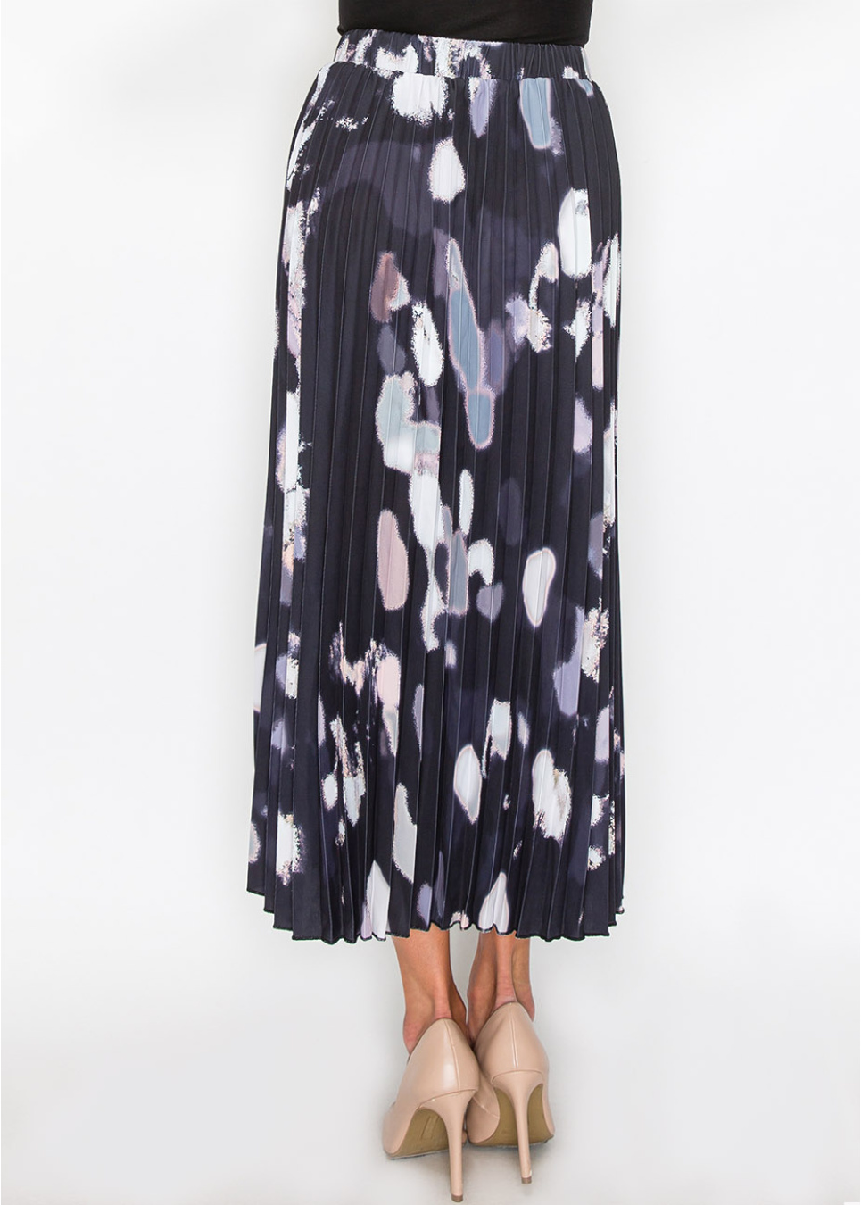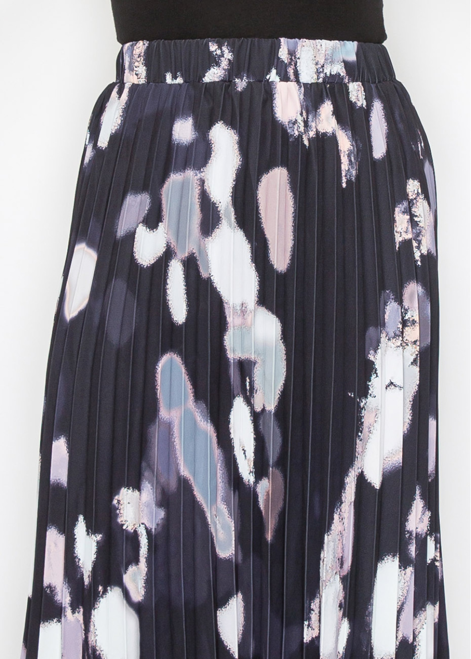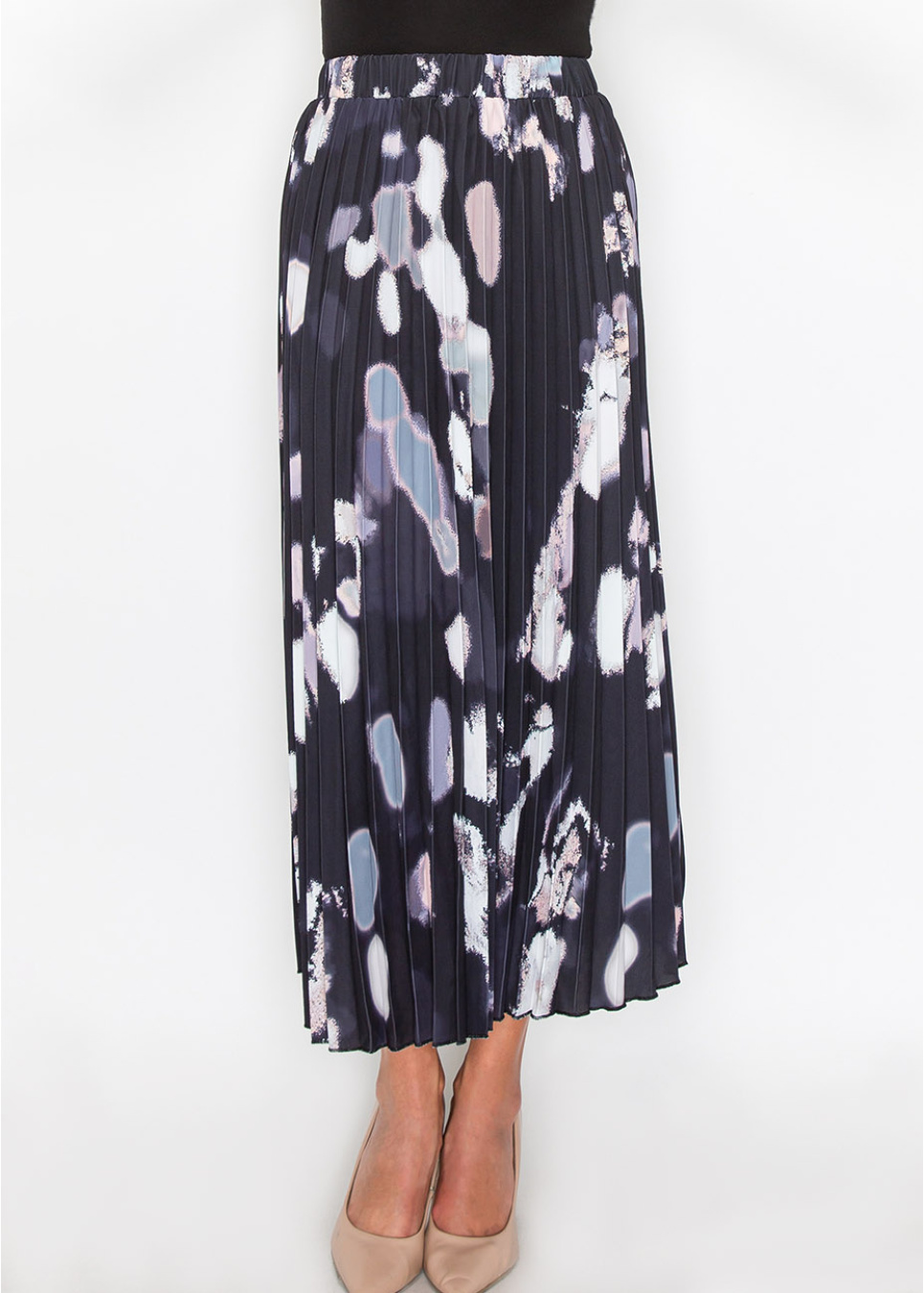 Step into style with this black midi skirt, featuring soft pleats and a unique abstract pattern in muted tones. The elastic waistband ensures comfort, while the eye-catching design adds a bold twist to your modest wardrobe.