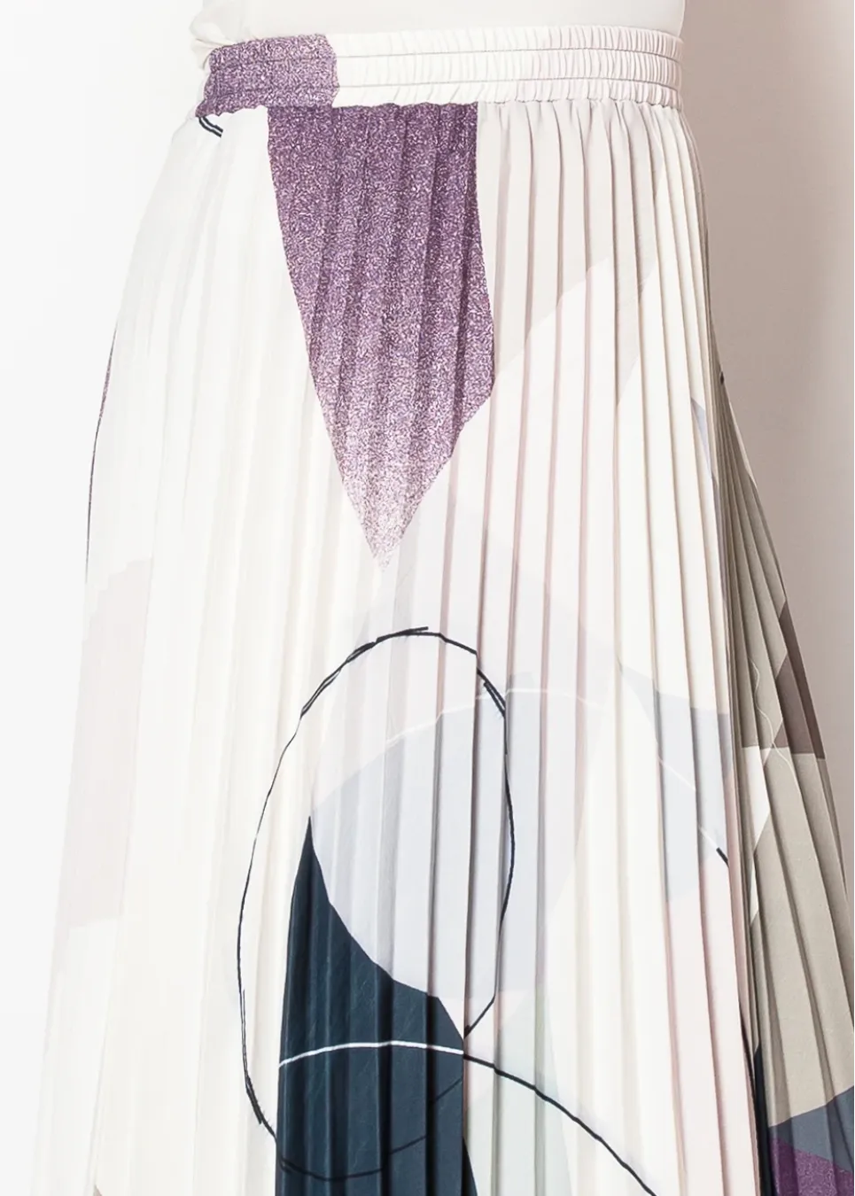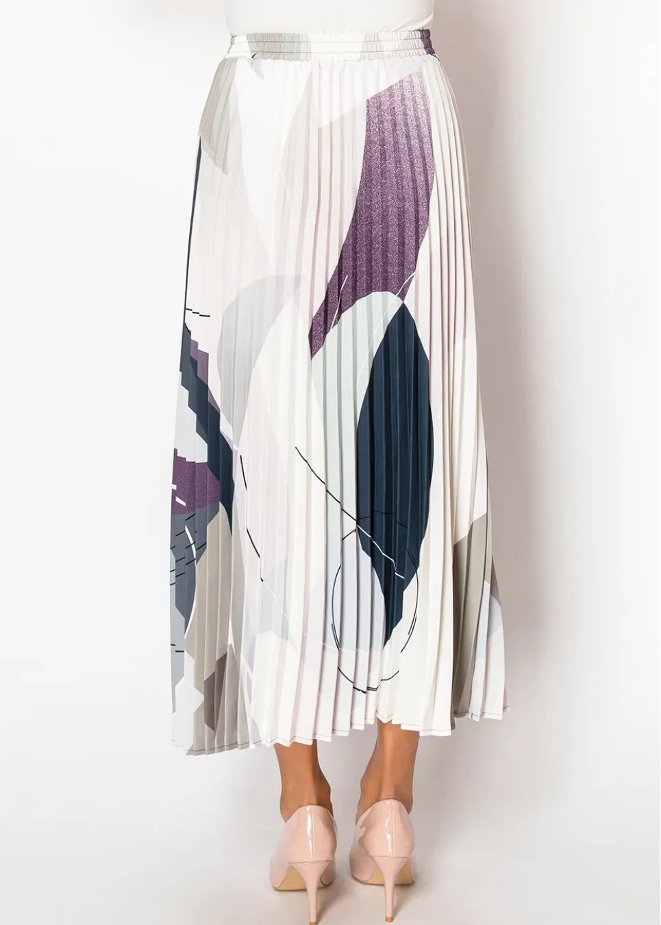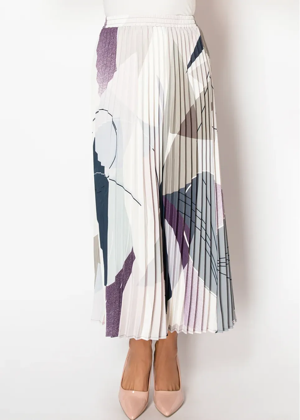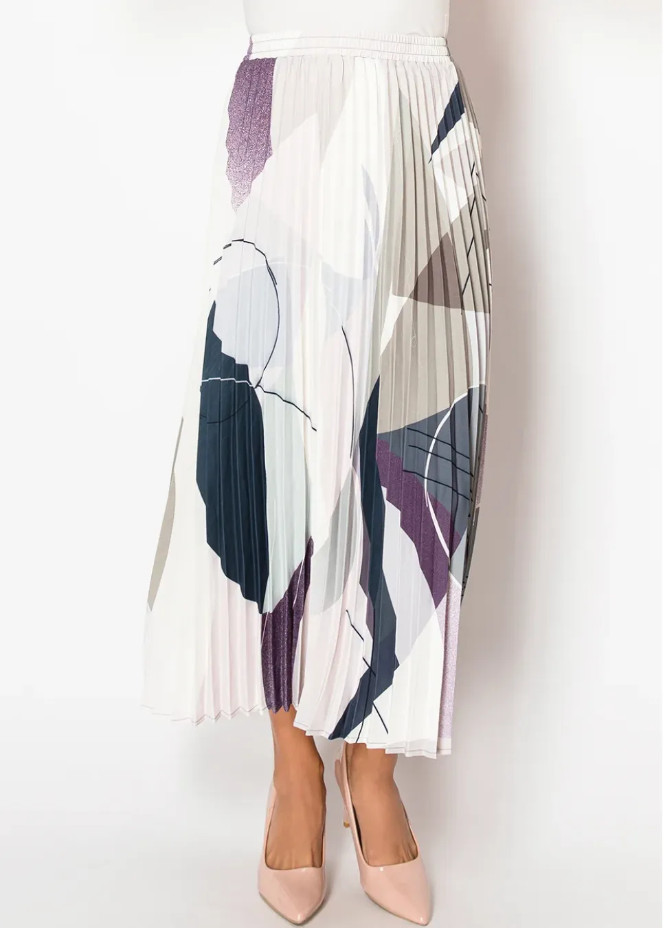 Elevate your outfit with this stunning pleated midi skirt. Featuring a blend of soft purple and neutral shades, it’s the perfect statement piece for any occasion. The flowy fabric and comfortable waistband make it as practical as it is beautiful.