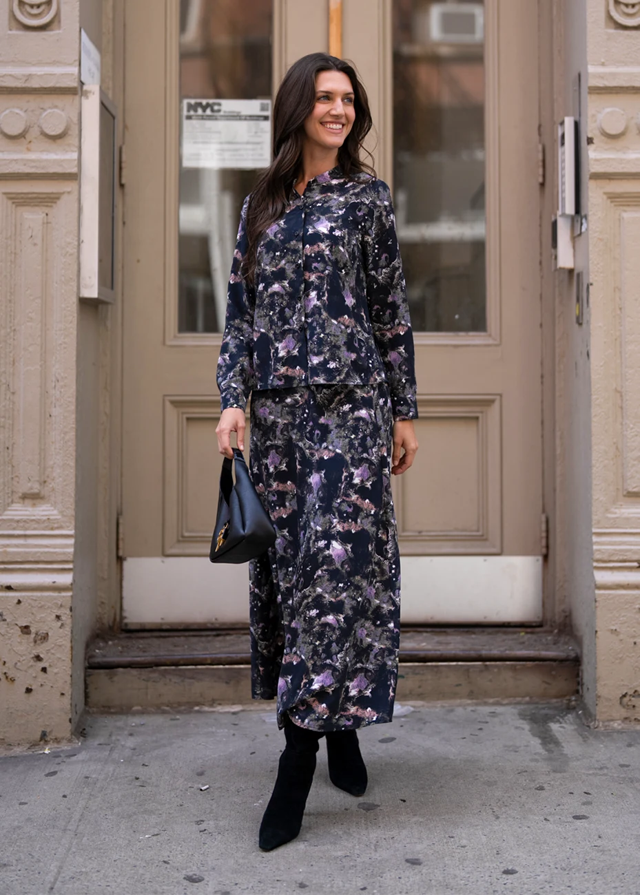 Like a brushstroke painting you can wear, this blouse mixes moody greens with soft lilacs. It’s flowy, relaxed, and instantly makes your outfit feel more creative.