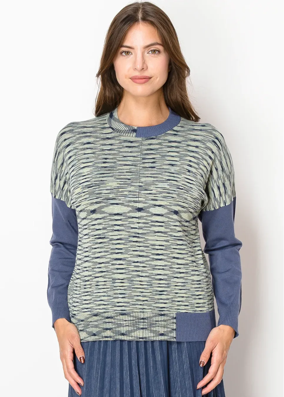 Designed with an abstract stripe detail, this sweater brings a modern touch to classic modest style. The soft colors and ribbed accents make it both chic and wearable for any casual occasion.
