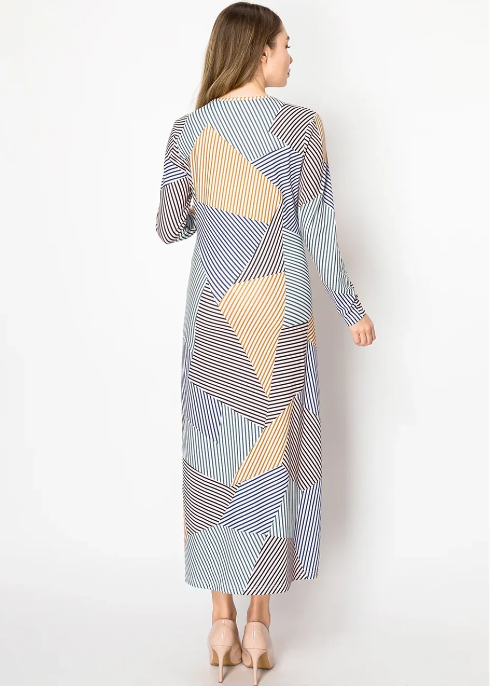 Stripes, but make them interesting. This dress plays with different stripe directions, creating a unique geometric look without being overwhelming. The tie at the waist gives it a bit of structure while keeping the fit relaxed. Long sleeves, a flowing shape, and breathable fabric make it a great go-to for effortless style.