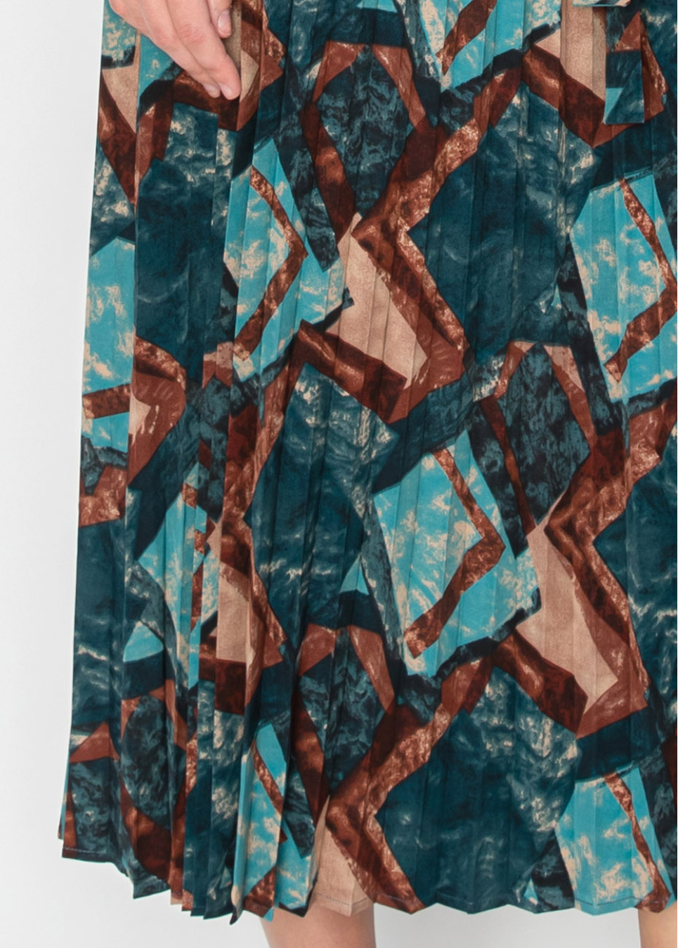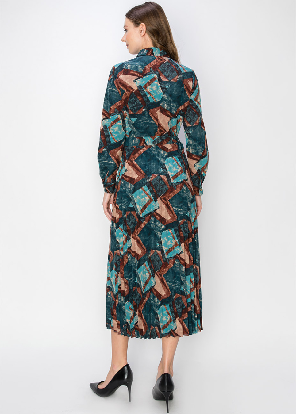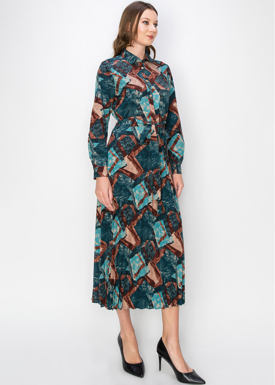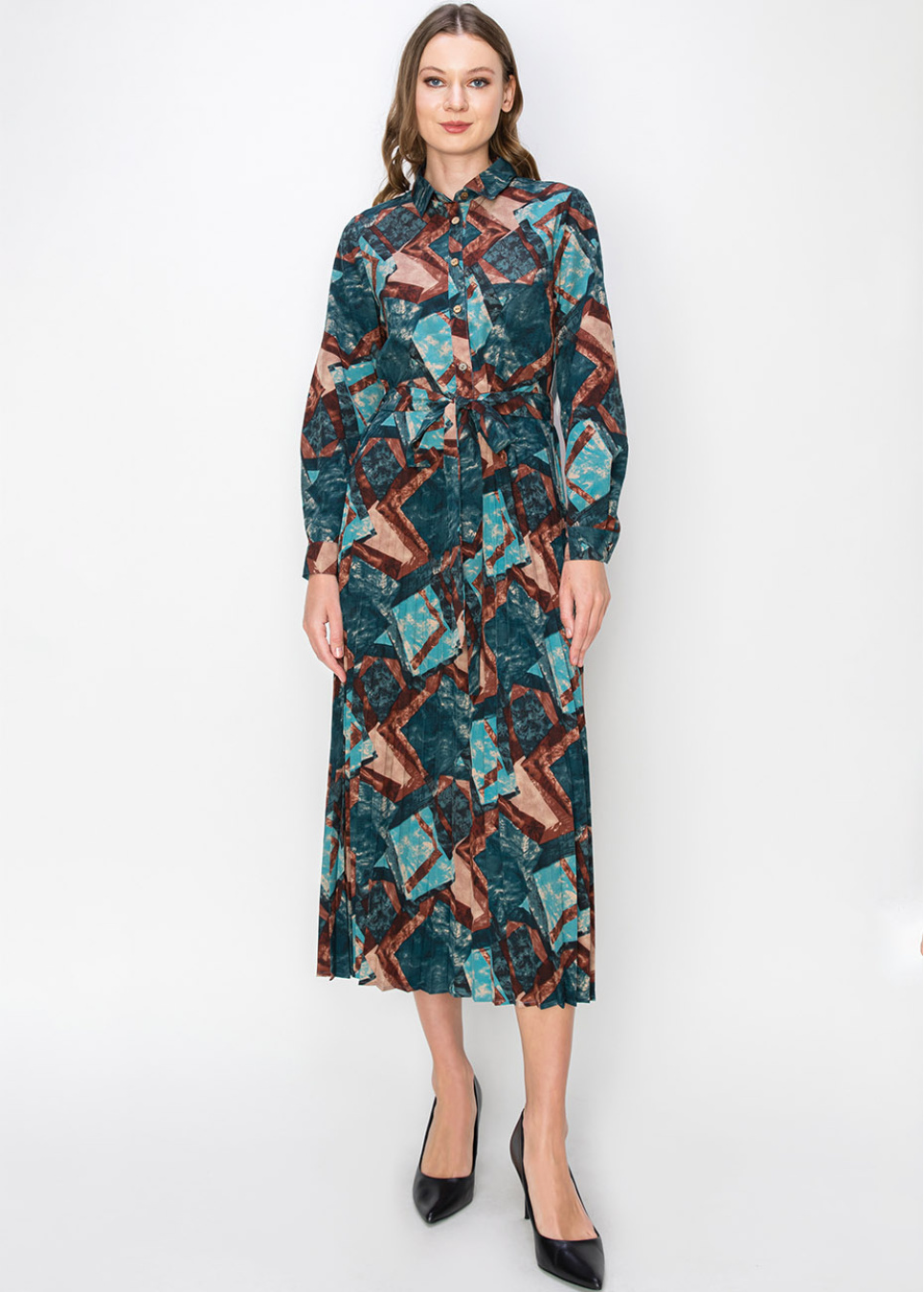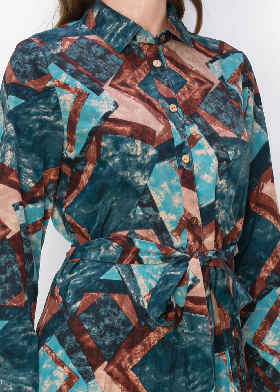 Add a splash of color to your wardrobe with this abstract-print midi dress. The turquoise, brown, and cream tones blend beautifully in a pleated skirt, offering a playful yet modest style. The button-front and waist tie allow for an adjustable fit, making it both practical and stylish.