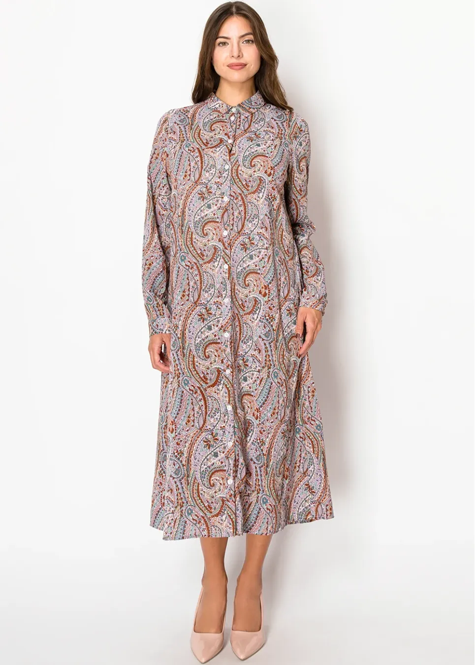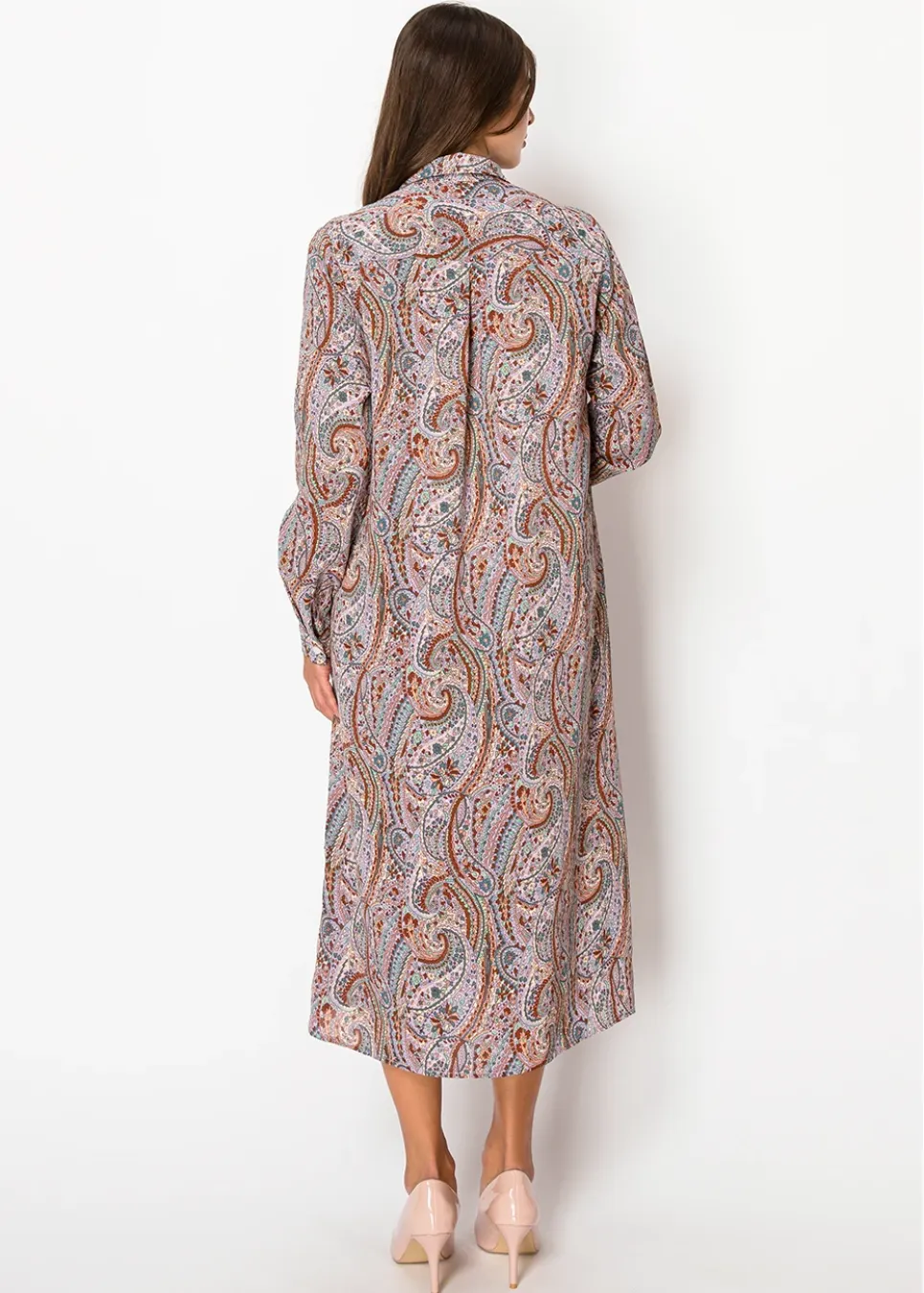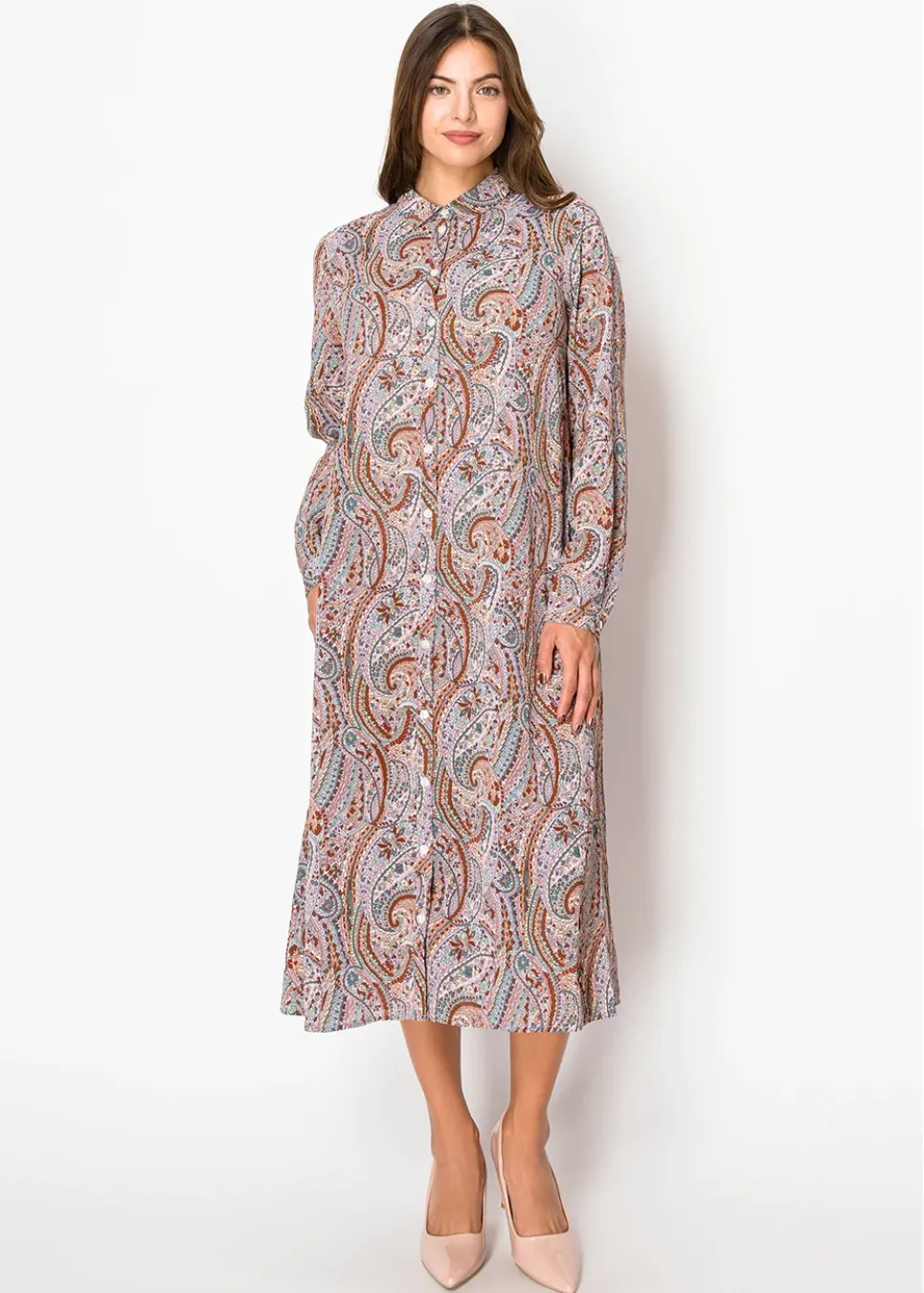 Made from a soft, breathable material, this dress feels luxurious yet easy to wear. The paisley print in warm, muted tones gives it a vintage charm, while the button-down design and relaxed fit make it endlessly versatile.