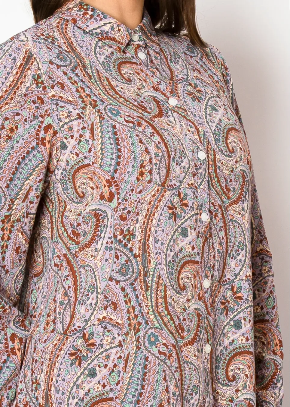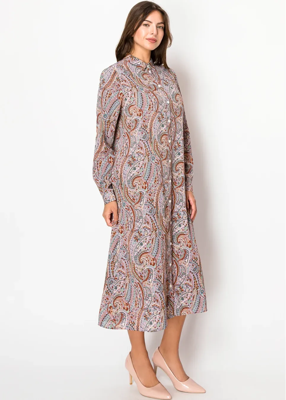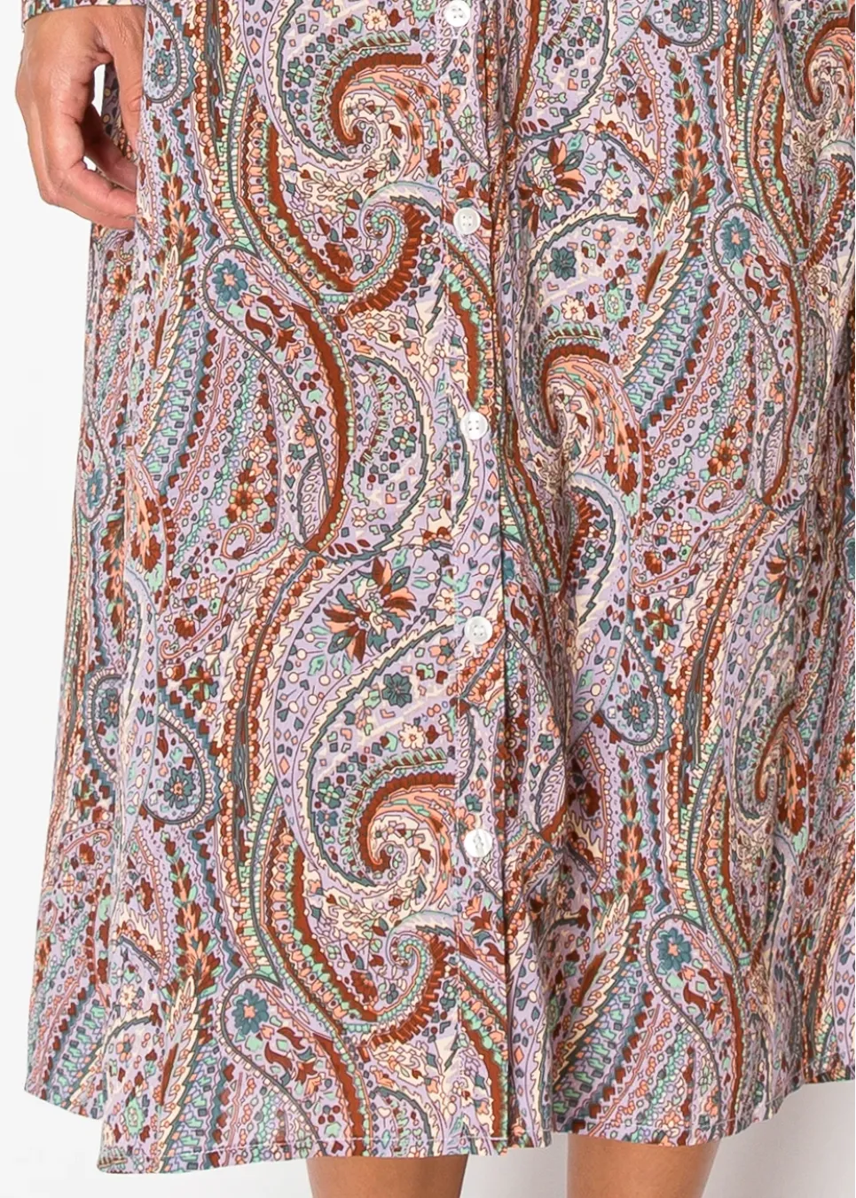 Made from a soft, breathable material, this dress feels luxurious yet easy to wear. The paisley print in warm, muted tones gives it a vintage charm, while the button-down design and relaxed fit make it endlessly versatile.
