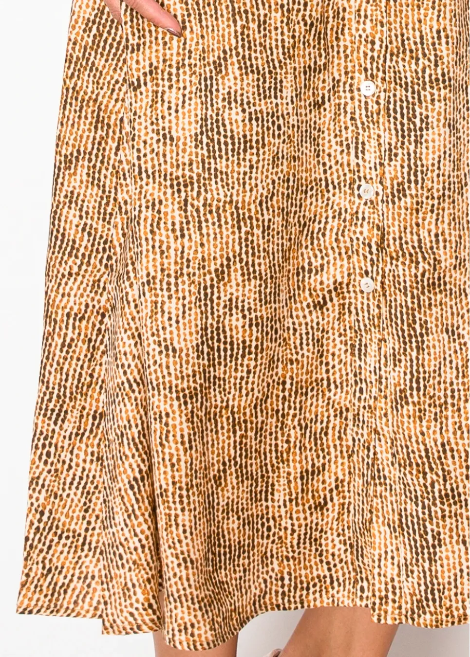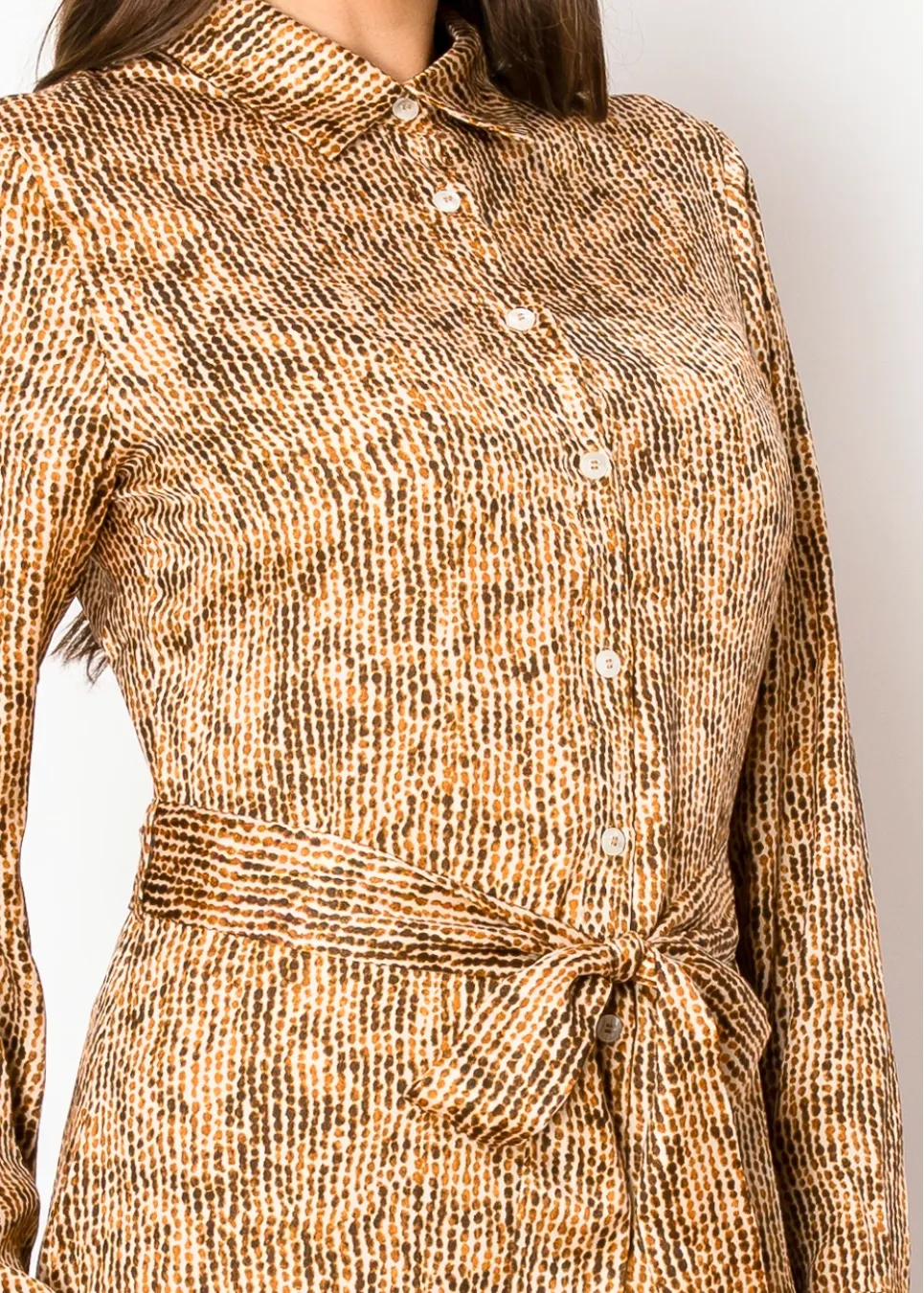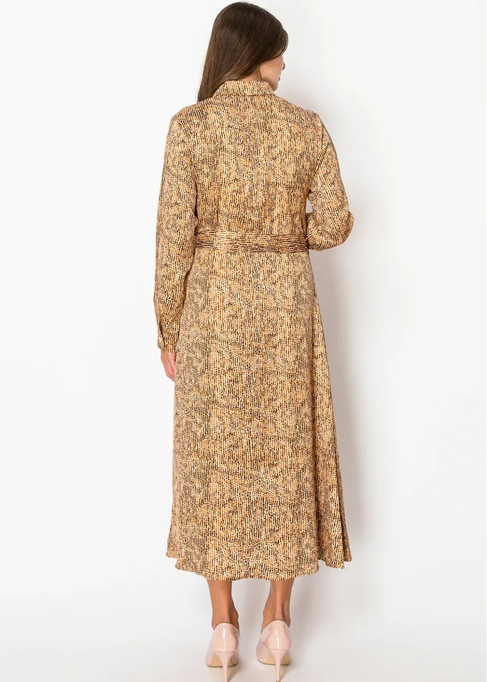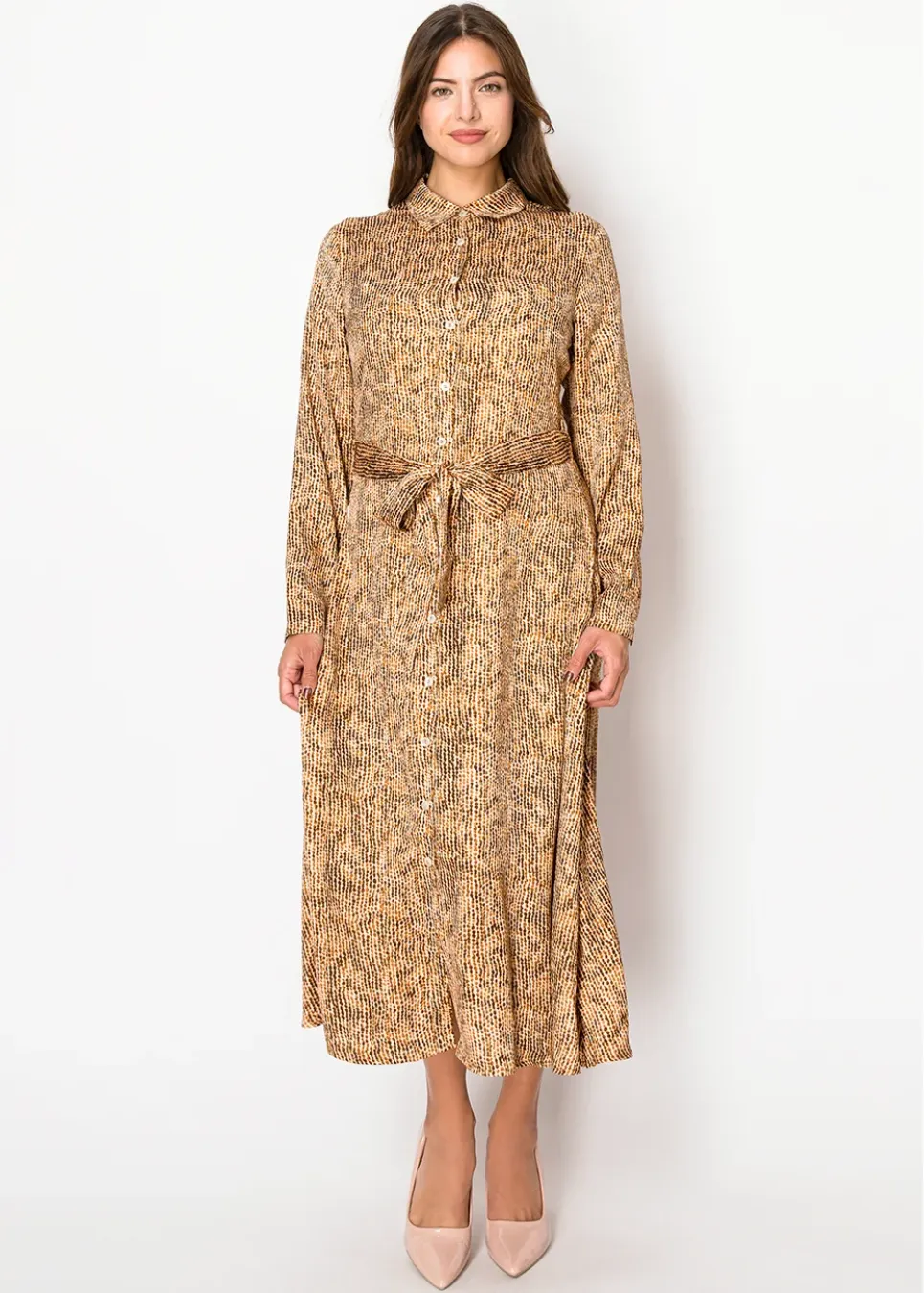 A print that feels both timeless and modern, this dress plays with rich rust and golden hues in a subtly textured design. The belted waist gives it shape, while the long sleeves and button-up front make it perfect for effortless modest dressing.