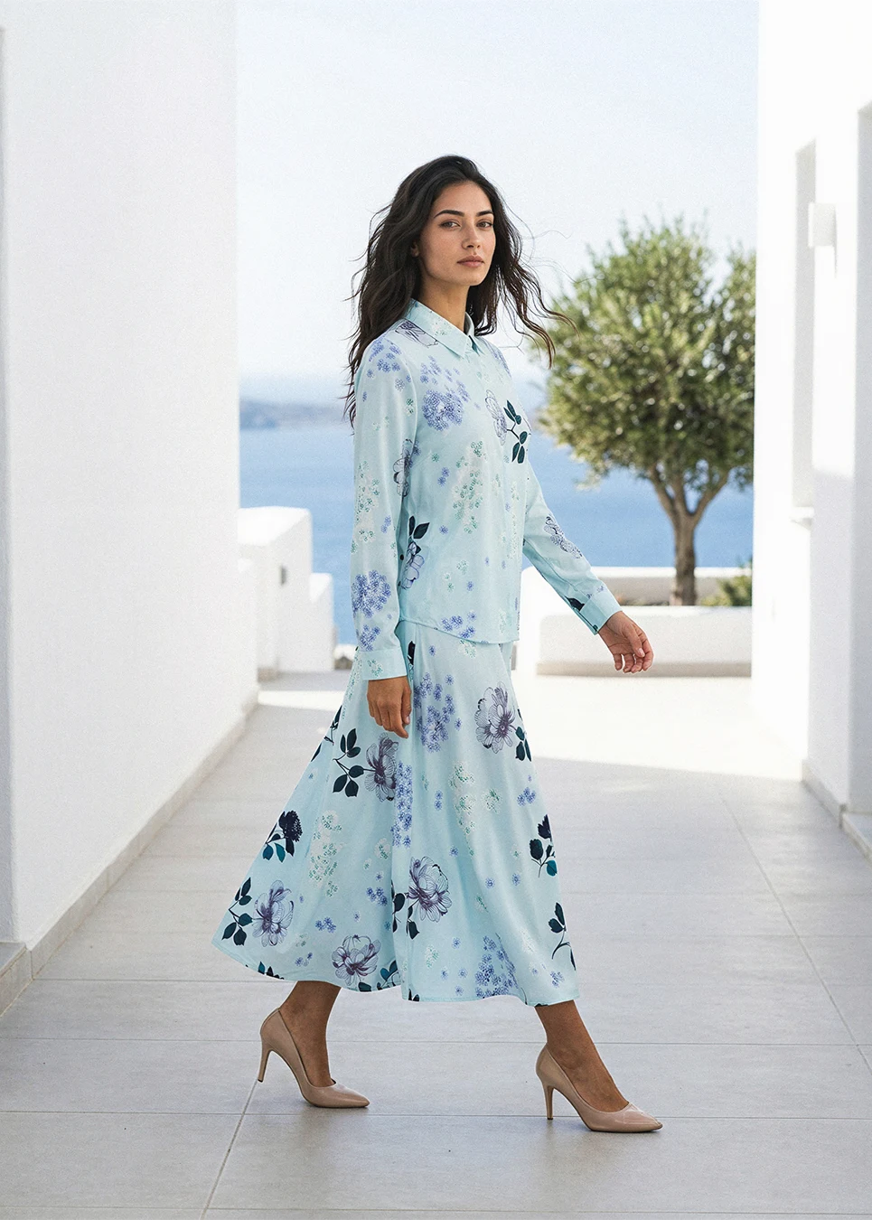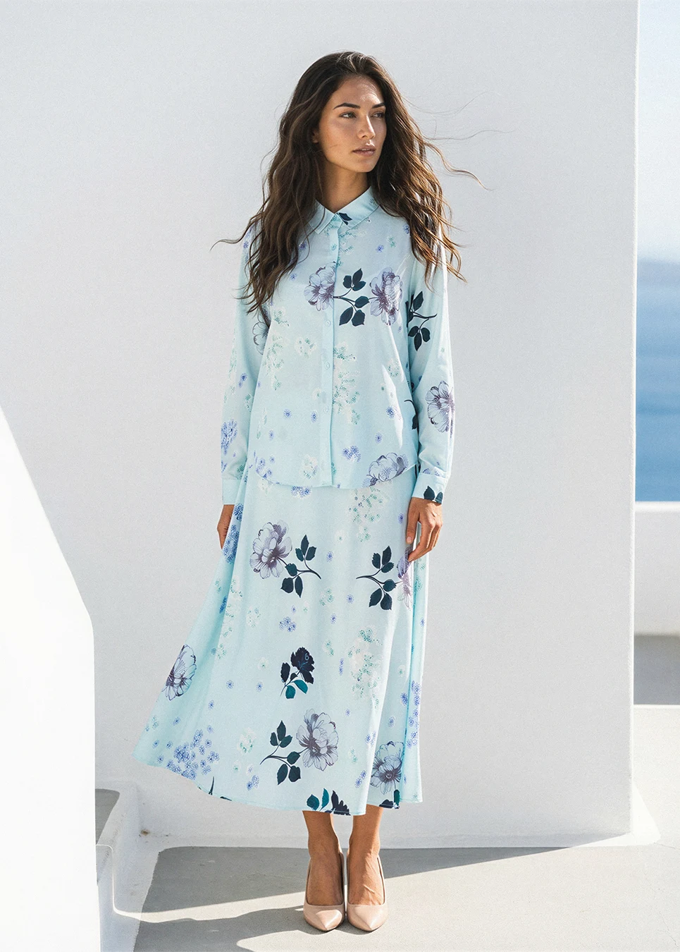 This is what a spring set should feel like. The mint-aqua ground keeps it light; the mixed florals — some bold, some scattered, some barely there — give it depth. Button blouse on top, full A-line skirt below, and the same print running through both without interruption.