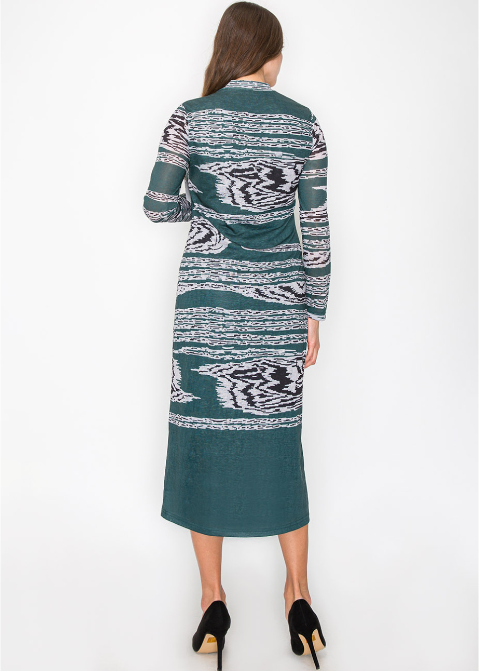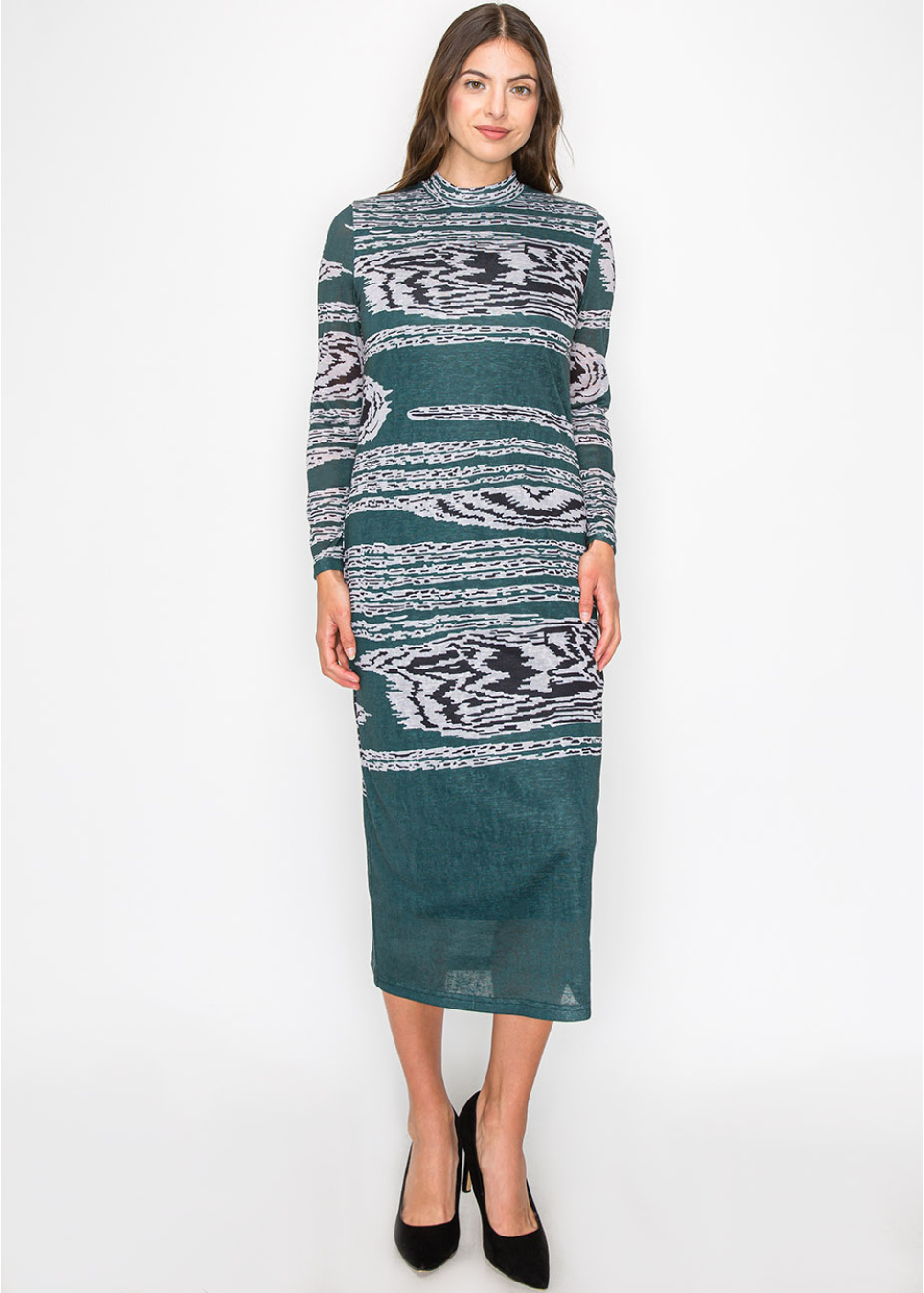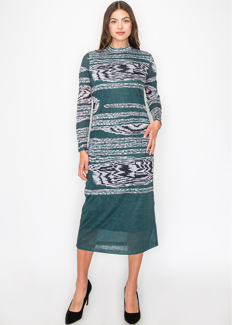 Step into contemporary style with this graphic-print green dress. The abstract design creates a bold yet sophisticated look, while the long sleeves and mock neck keep the overall silhouette modest. It’s an easy choice for days when you want to stand out without sacrificing comfort.