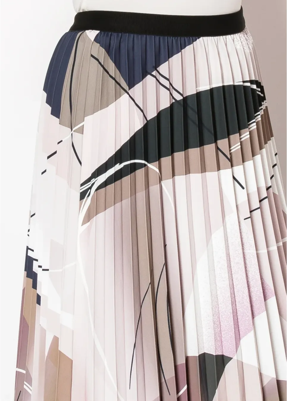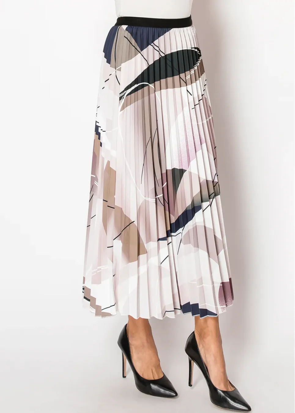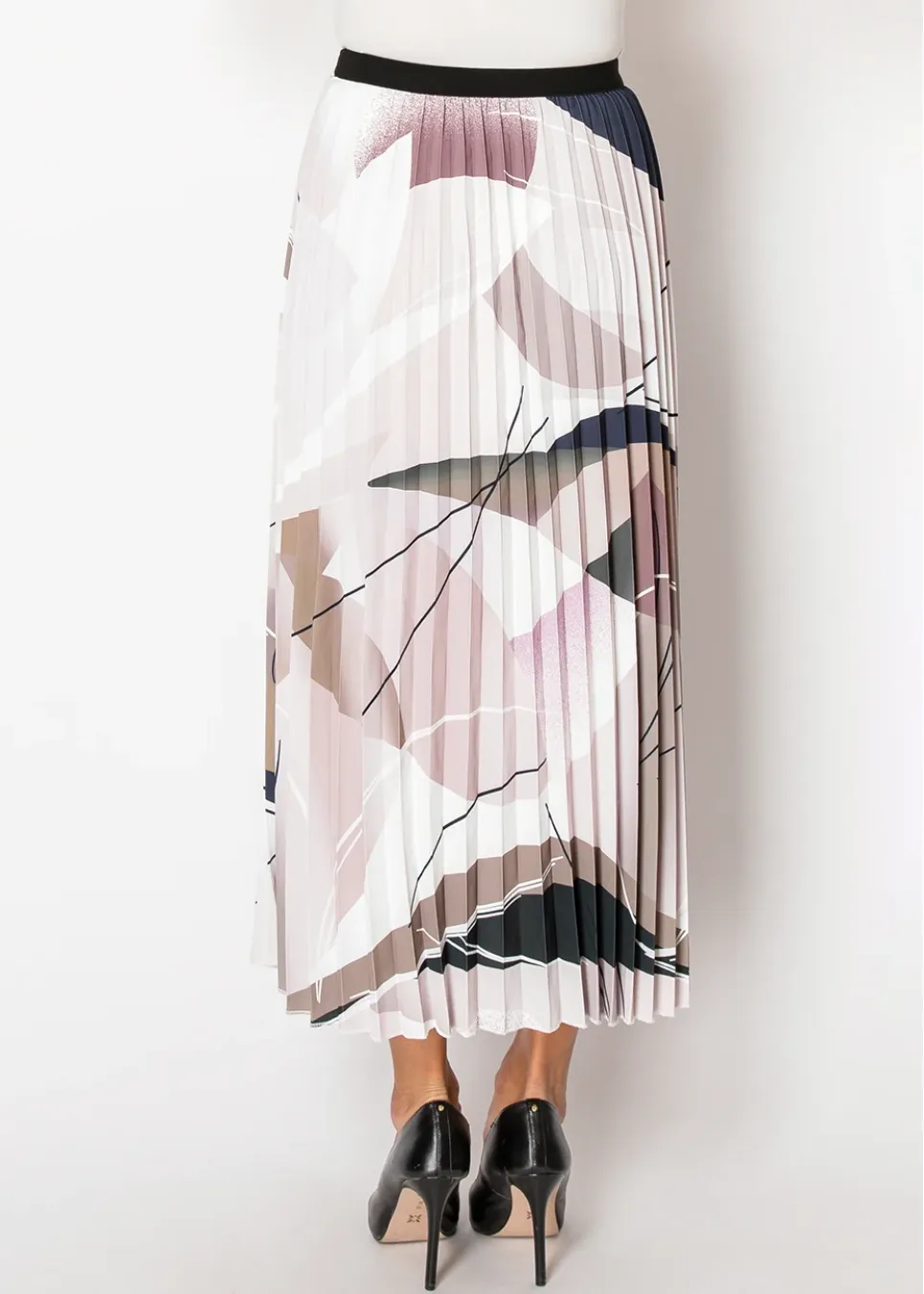 Designed with an artistic flair, this skirt features a beautiful blend of purple shades, beige, and black in an abstract print. The lightweight fabric and pleated texture create an effortlessly chic silhouette. Perfect for pairing with a simple blouse or sweater for an elegant, modest style.