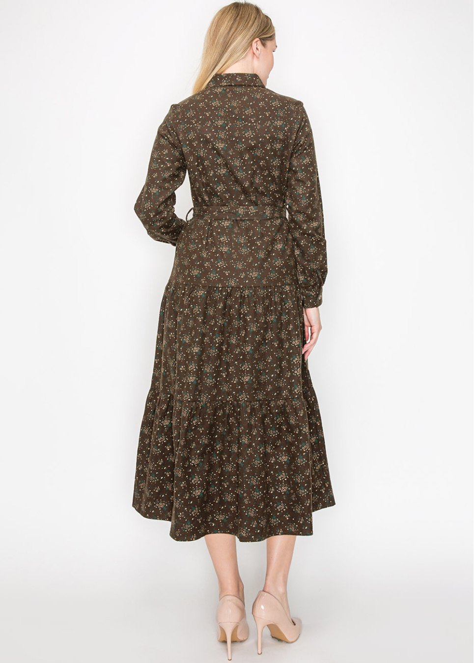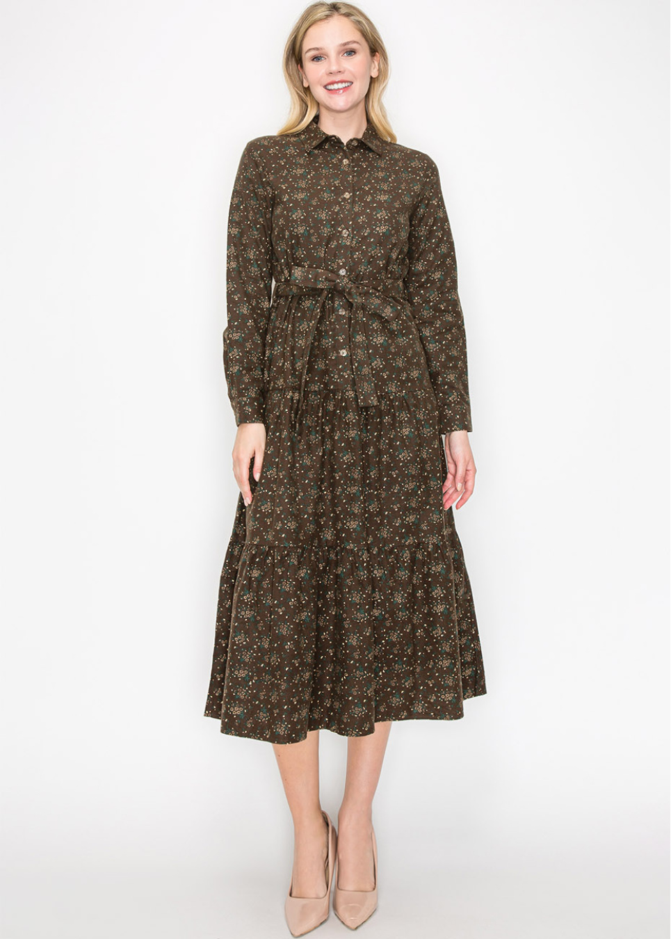Welcome fall in this lovely brown midi dress, complete with a sweet floral pattern. Long sleeves and a button-down front give it that timeless feel, while the matching belt cinches your waist just right. With its modest silhouette, this dress is perfect for anything on your agenda, making it a go-to piece for your wardrobe.