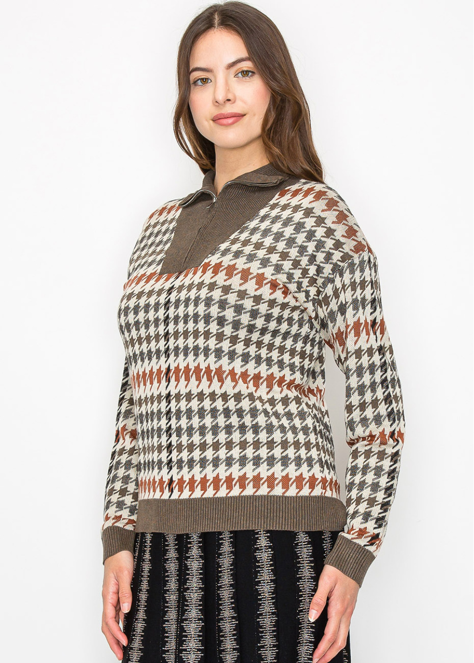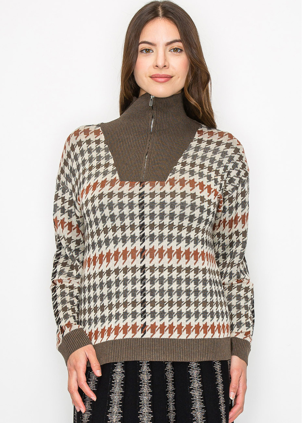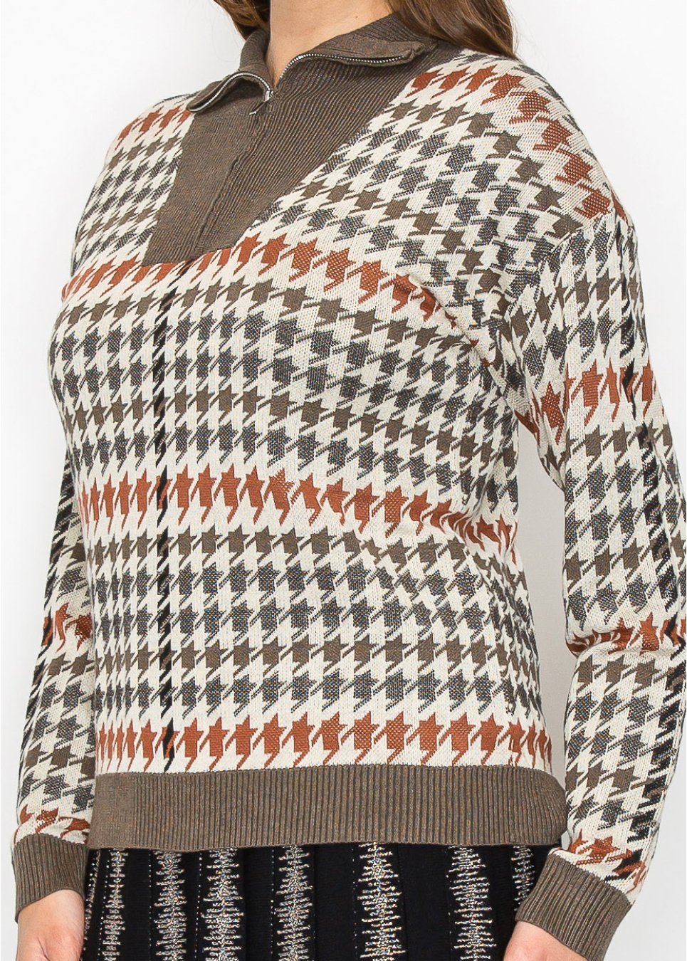 Get cozy this fall with the Autumn Houndstooth Knit Sweater. Warm shades of brown, beige, and rust come together in a classic houndstooth pattern, with a half-zip collar that gives it a modern twist. Whether you layer it or wear it solo, this sweater blends comfort with style—just right for your everyday looks.