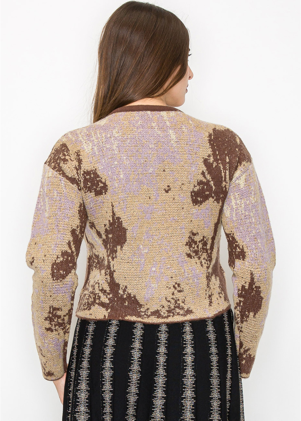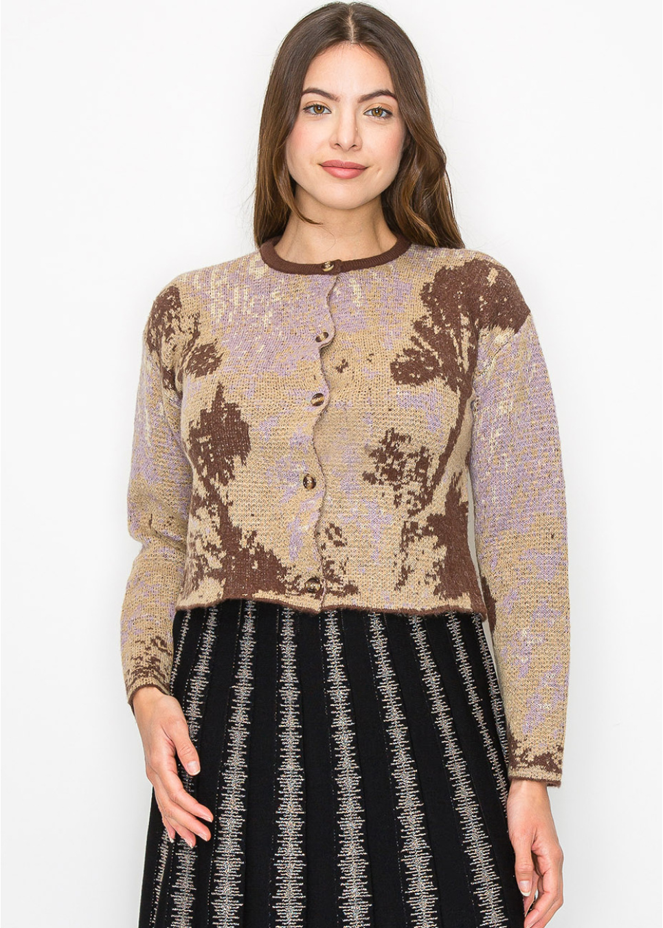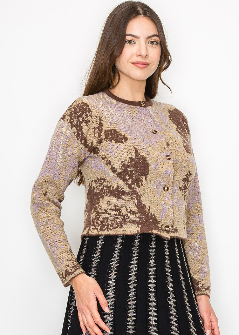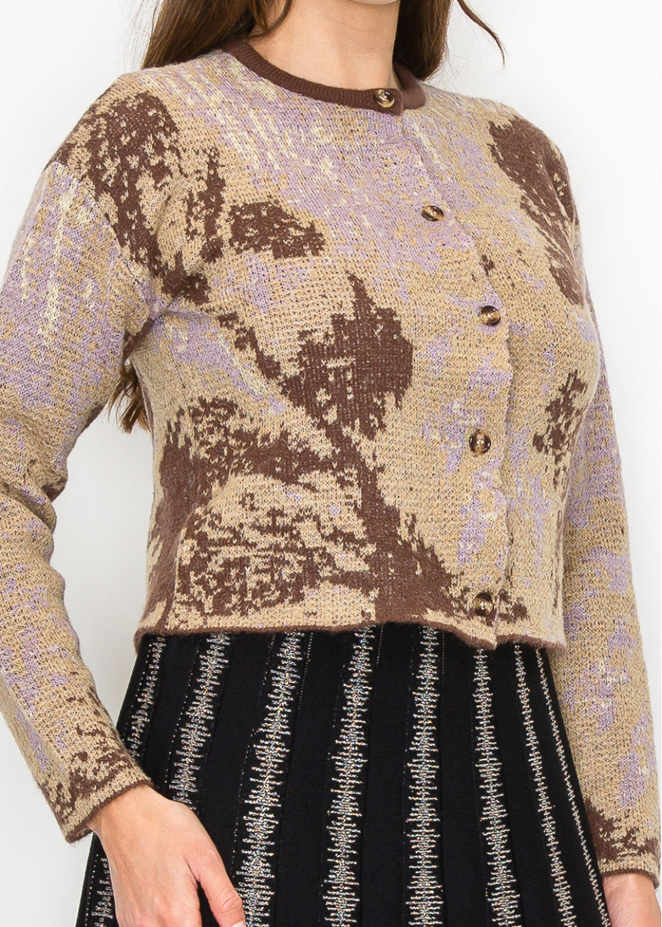 Warm shades of brown and beige meet soft lavender accents in this cozy buttoned cardigan. The abstract design gives a fresh, artistic feel, while the modest fit ensures comfort and versatility. Perfect for layering over your favorite outfits for a subtle pop of color.