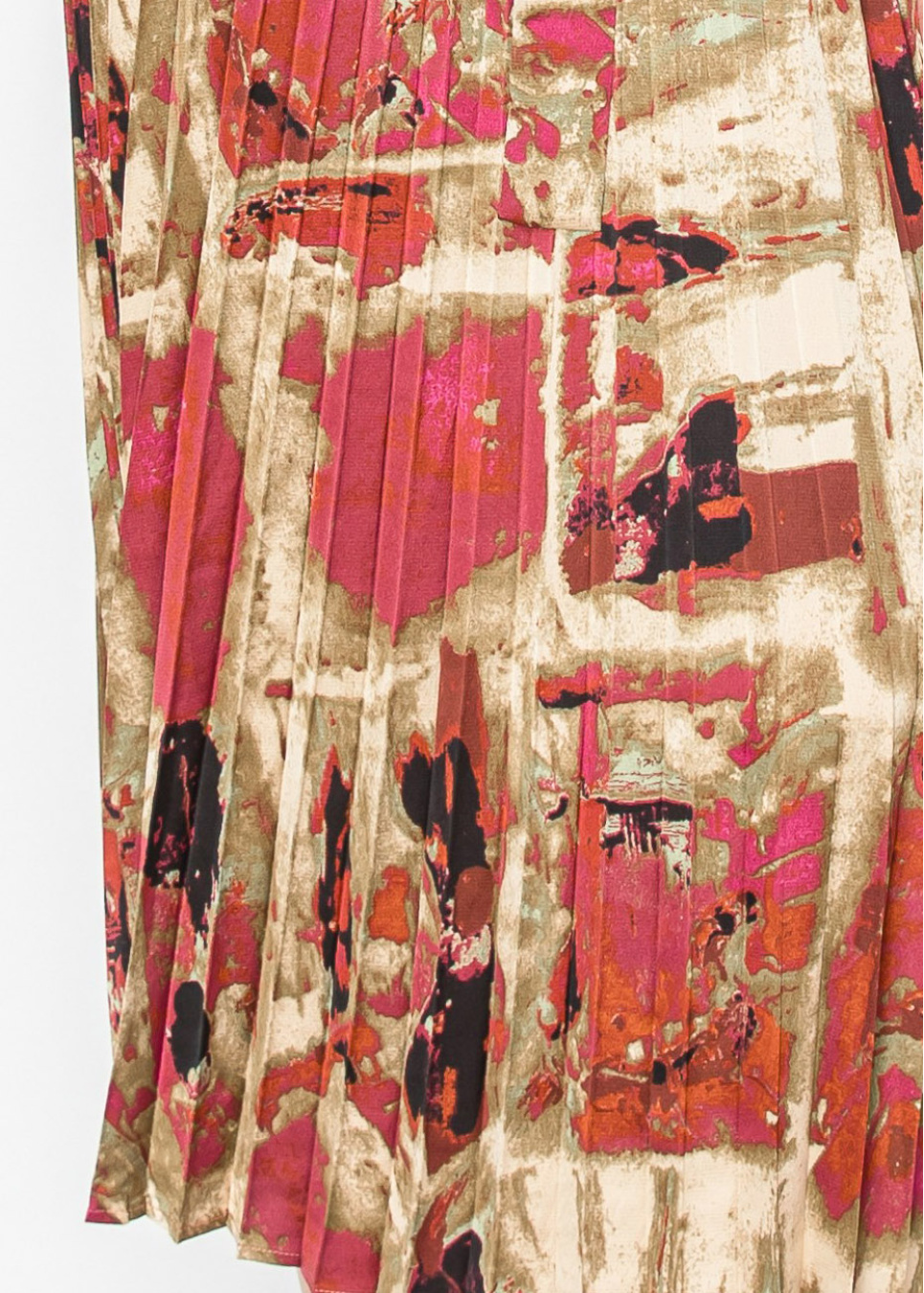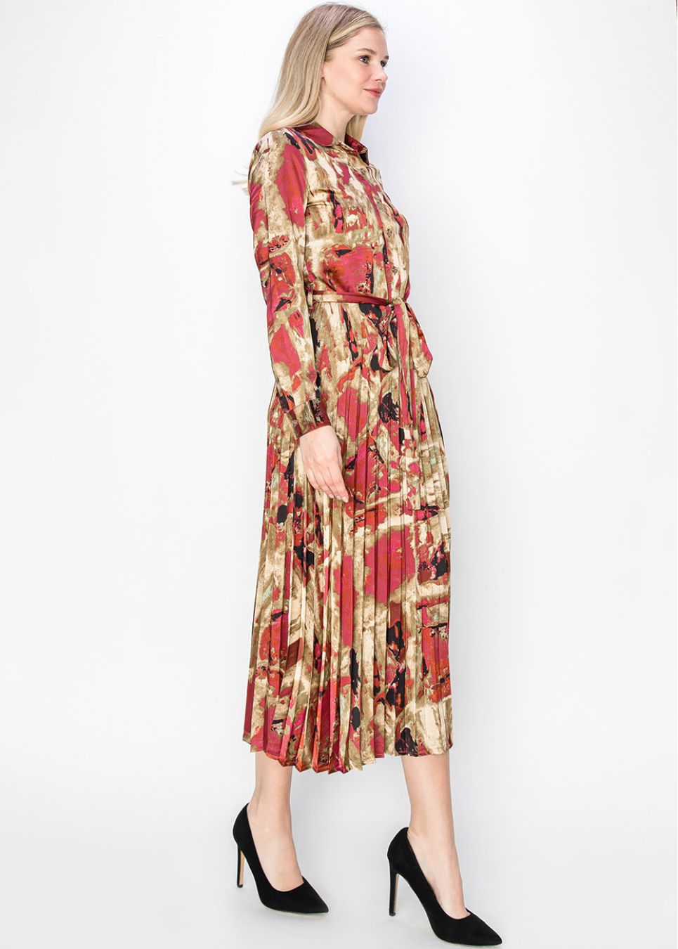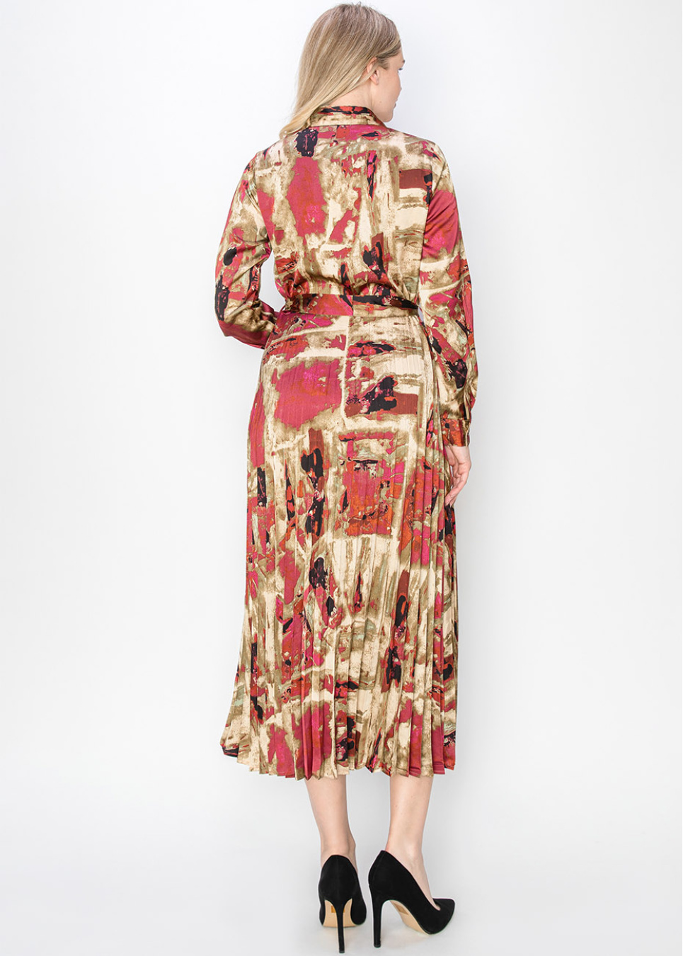 This dress showcases an eye-catching combination of autumn hues in a striking abstract design. A tie belt at the waist lets you customize the fit, and the pleated skirt adds graceful movement. The modest cut is complemented by a buttoned collar and long sleeves, perfect for cooler weather.