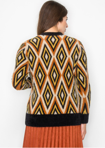 Step into warmth and comfort with this bold cardigan that brings autumn tones to life. The eye-catching diamond pattern in rich hues of rust, mustard, and black instantly brightens up any outfit. With its fuzzy texture and cozy feel, it’s perfect for layering over your favorite tops when the temperature drops. The front pockets and buttons give it a functional twist while maintaining a modest and polished look.