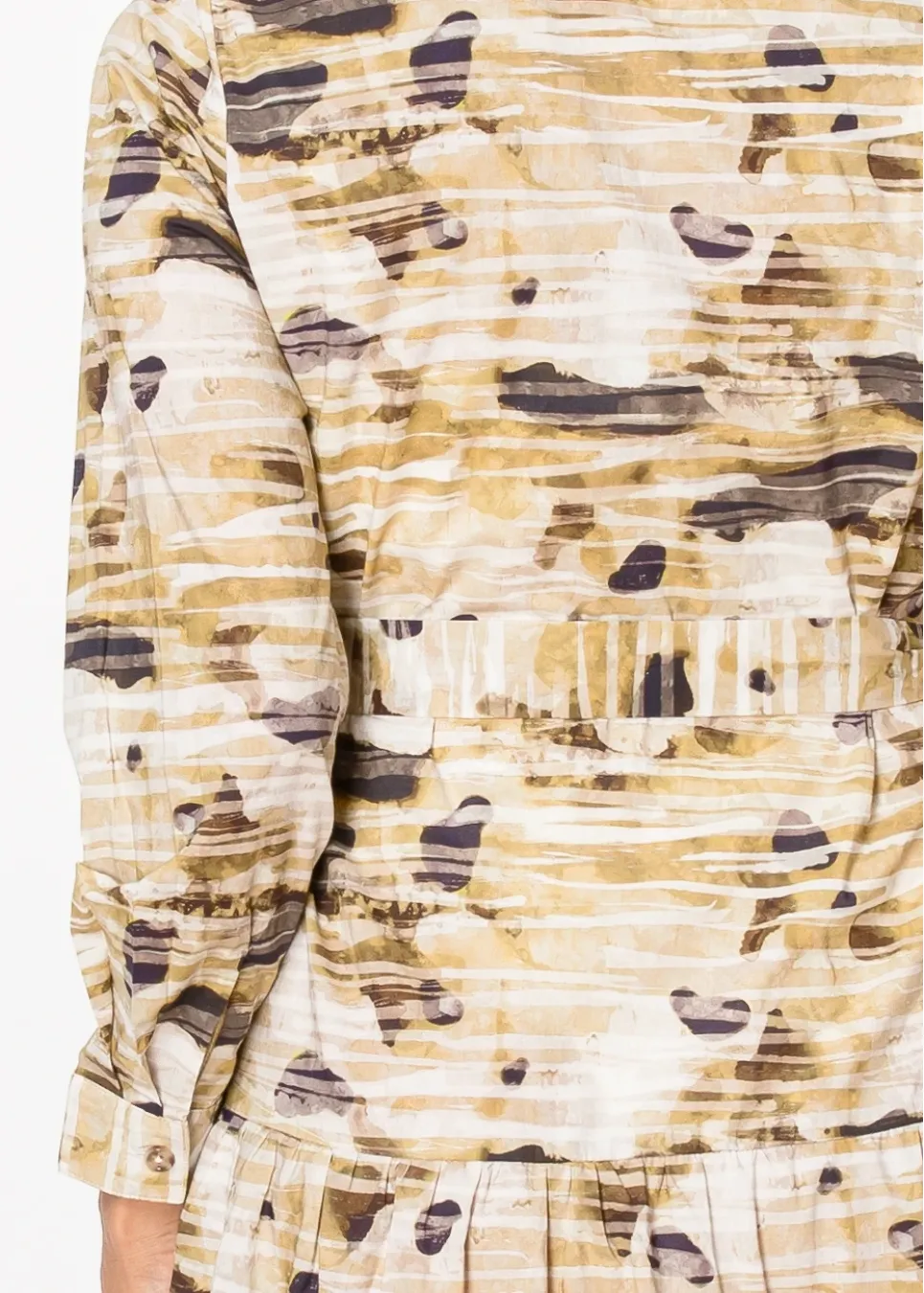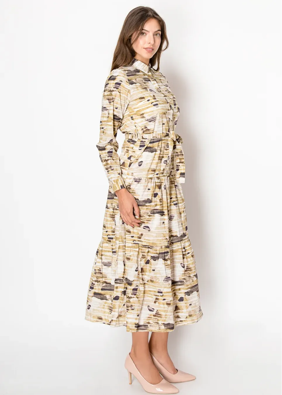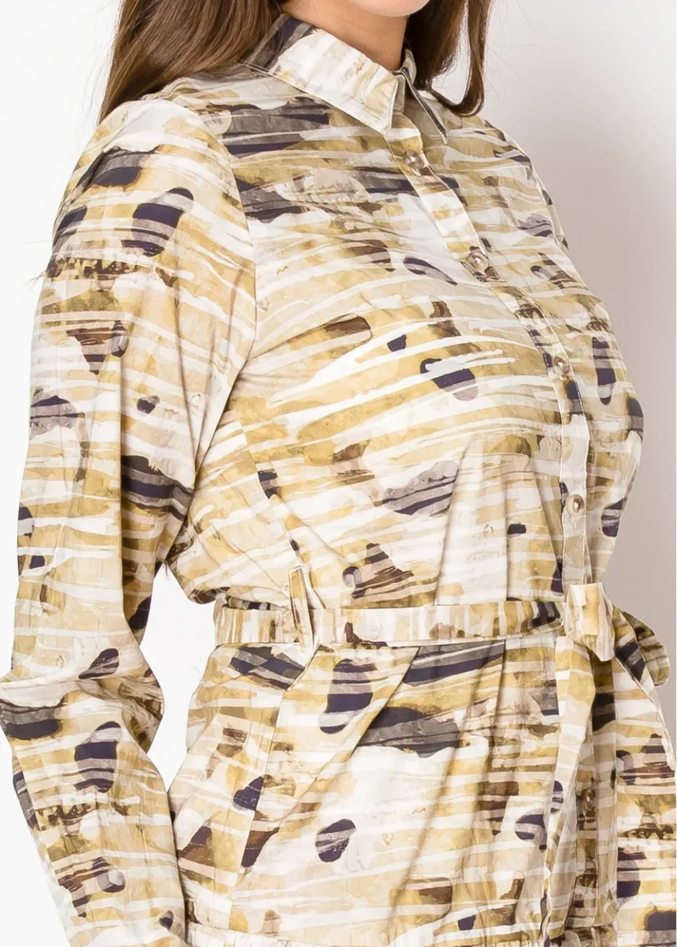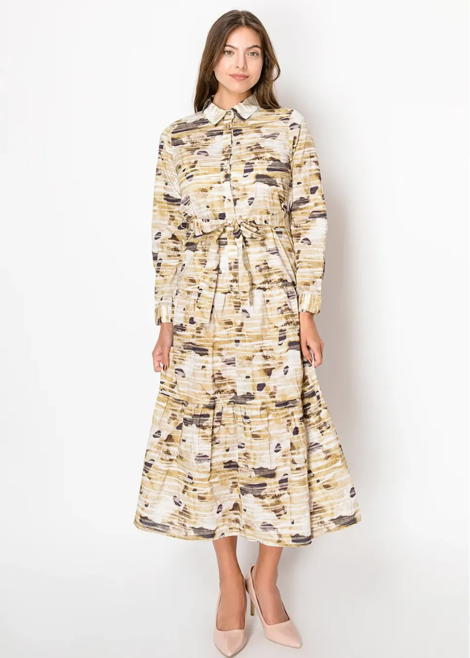 A button-front midi dress in a unique beige abstract print, designed with a matching belt to define the waist. The lightweight fabric and classic shirt collar make it an easy choice for workdays or weekends.