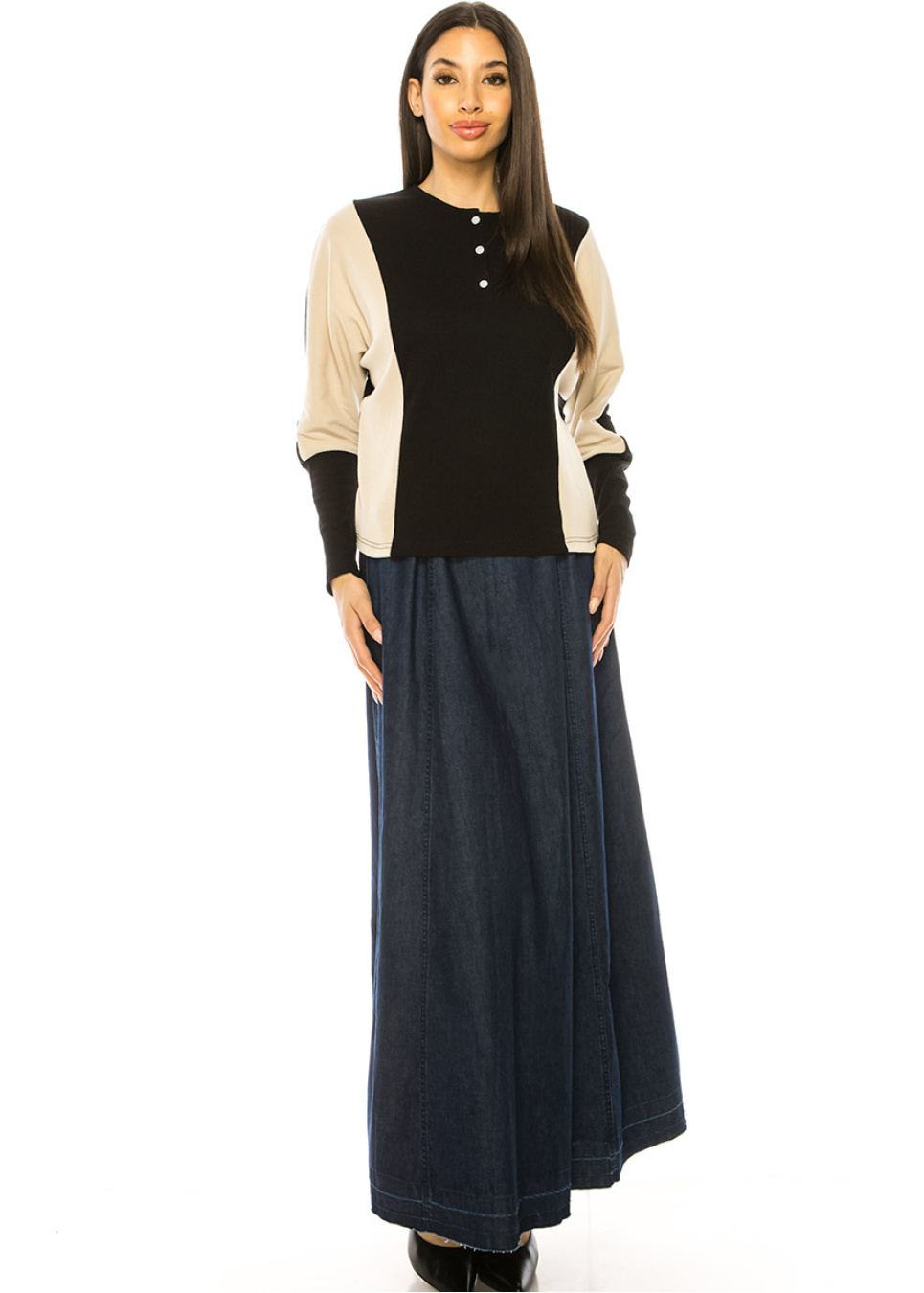 Simplicity meets style with this minimalist and modern YAL New York long sleeve t-shirt. The beige and black color block design is a subtle yet striking addition to any outfit, while the quarter button adds a touch of charm. Wear it with your favorite accessories for a sleek and sophisticated look.