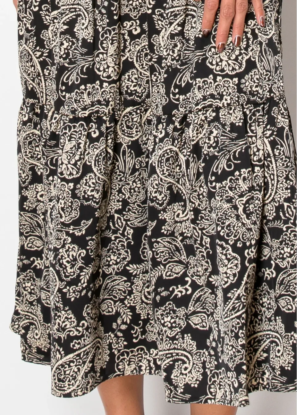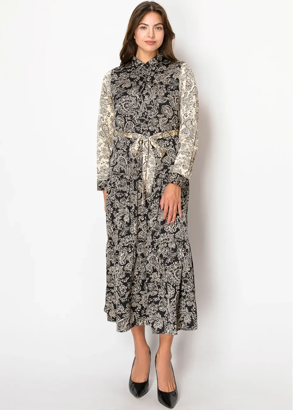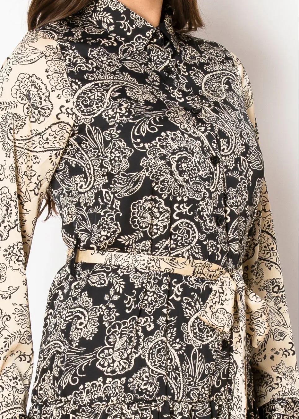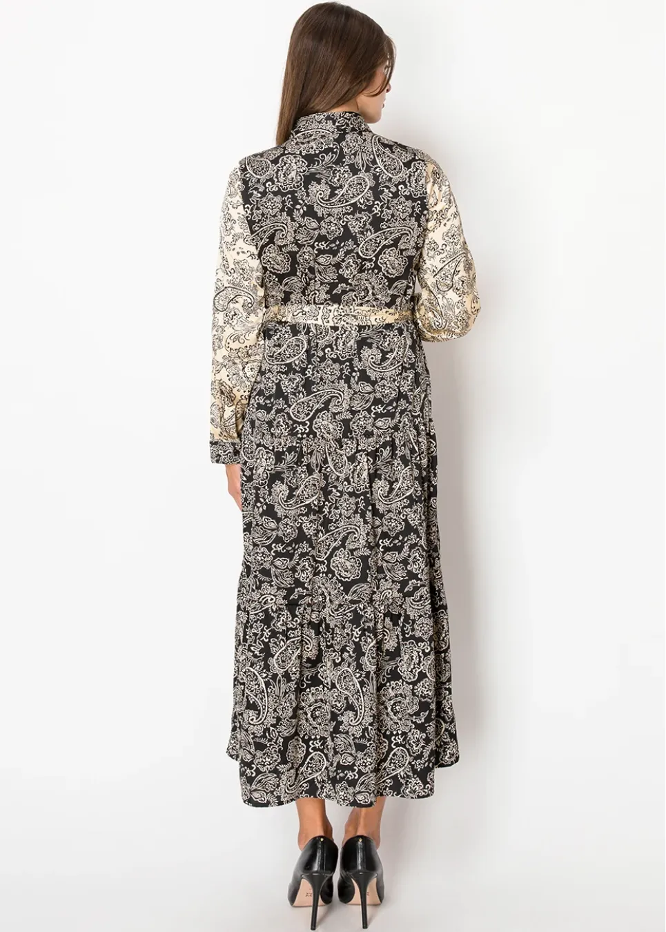 This dress showcases a stunning beige and black color palette with an intricate paisley pattern. The tie belt and tiered design add shape and movement, perfect for effortless modest fashion.