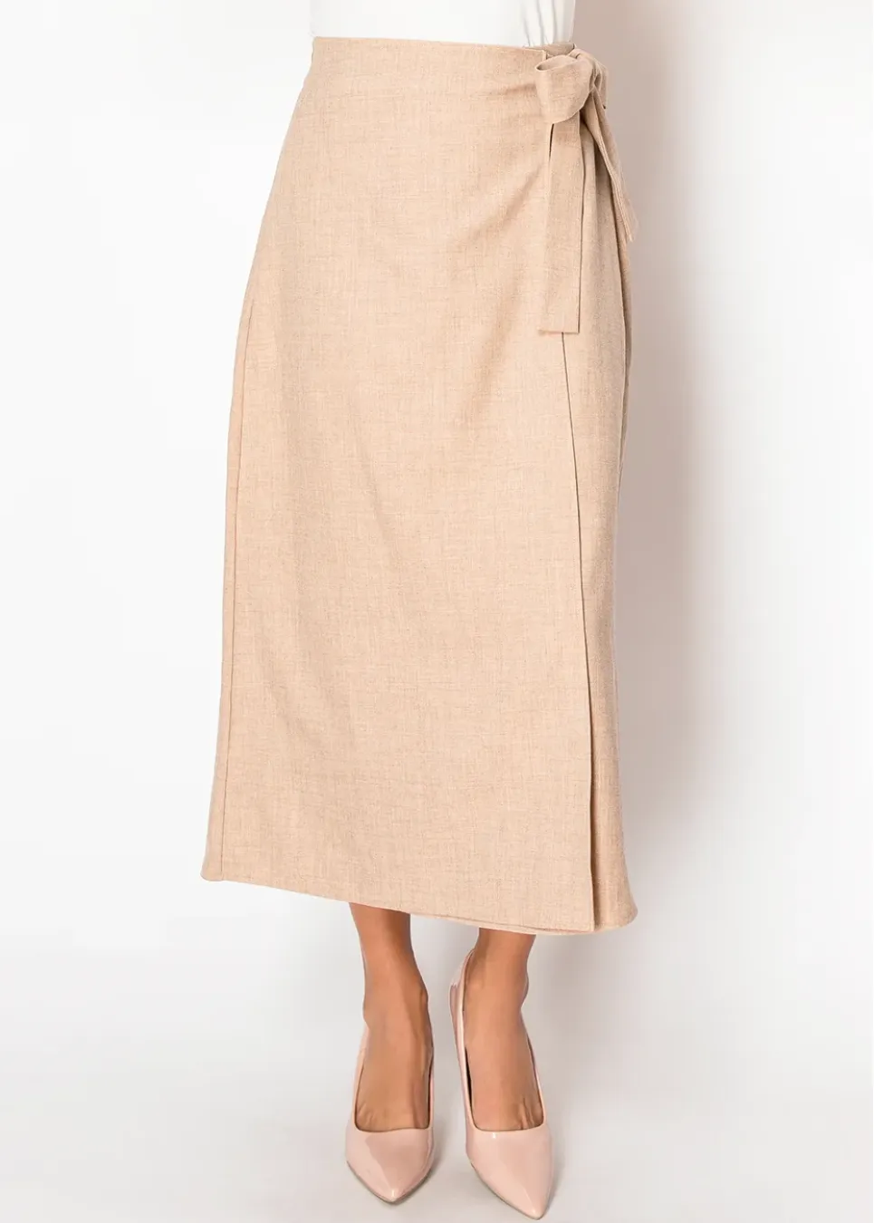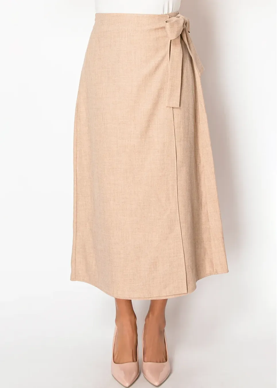 A perfect blend of simplicity and elegance, this wrap-style skirt features a soft beige tone and a flattering bow detail. The lightweight fabric feels comfortable all day long, making it an easy choice for both casual and dressy occasions.