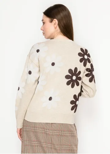 Beige Floral Knit Crewneck Sweater