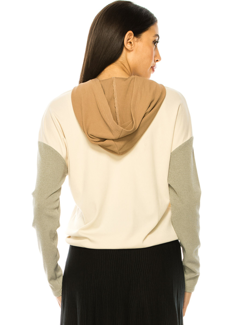 Discover the perfect blend of comfort and style with this versatile long sleeve t-shirt. The camel hood and beige body exude a relaxed vibe, while the grey sleeves bring a sporty flair. The drawstring bottom and loose fit make it ideal for any occasion, whether you're lounging at home or running errands.