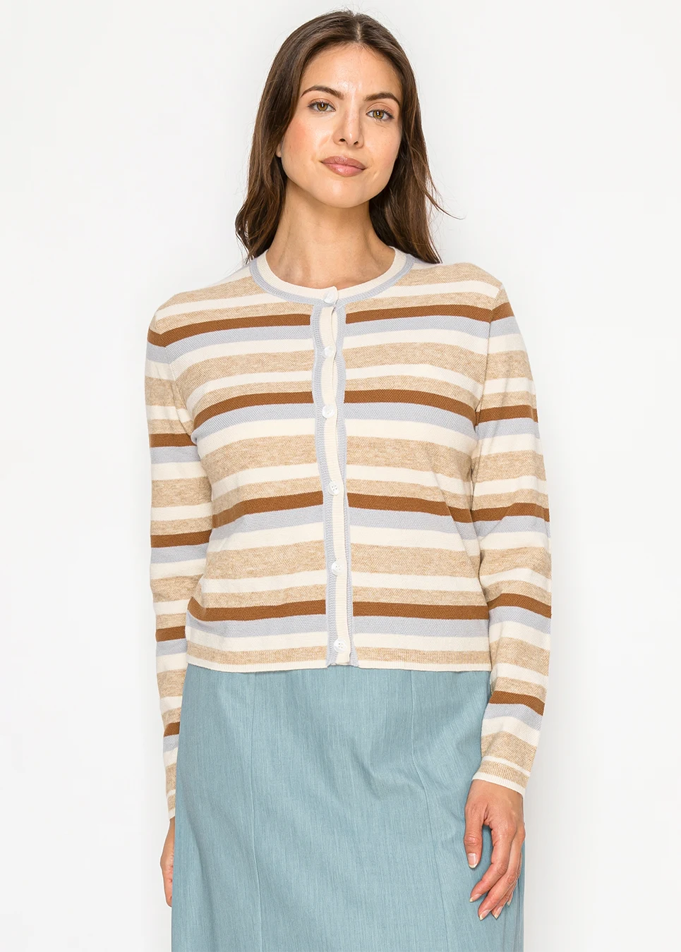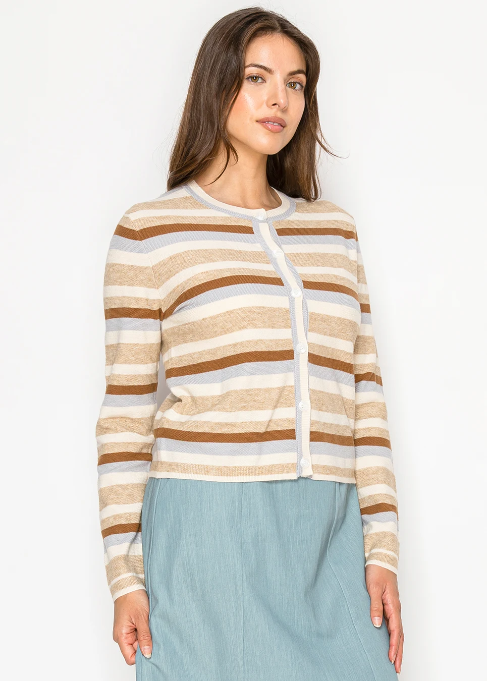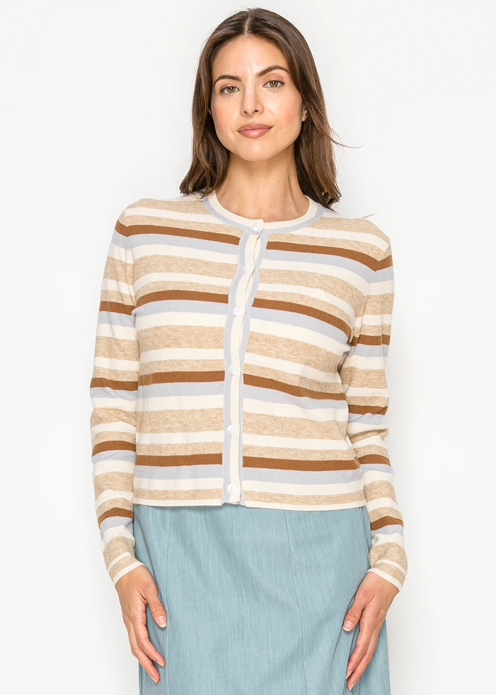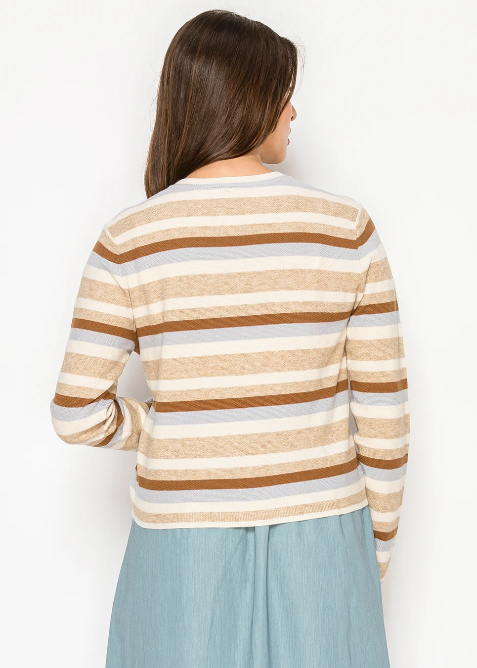 Soft sand, warm brown, and muted sky tones come together in a textured stripe that feels calm and grounded. It’s a thoughtful layer for quiet spring mornings.