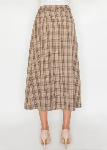 Beige Plaid Midi Skirt with Belt Detail