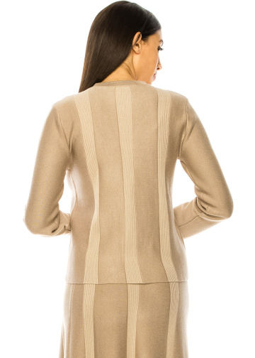 This beige sweater with light stripes of lurex adds a touch of elegance to its classic design. Its neutral color scheme makes it a versatile choice for any occasion. The comfortable fit and soft knit texture make it perfect for everyday wear. You can style it with almost anything for a chic and sophisticated look. Complete the outfit with the matching skirt for a coordinated ensemble.