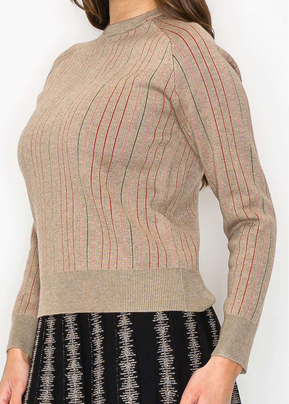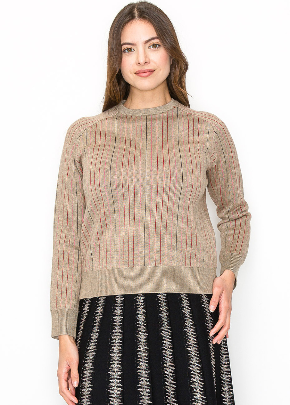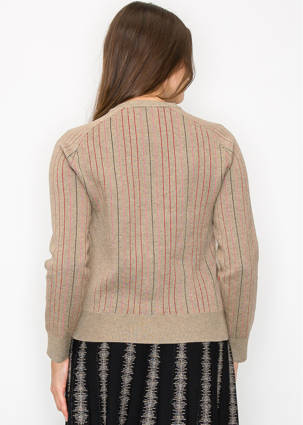 Lightweight and cozy, this beige knit sweater is accented with thin pink and red stripes for a subtle touch of color. The ribbed neckline and cuffs add structure to this simple yet stylish design, perfect for modest layering.