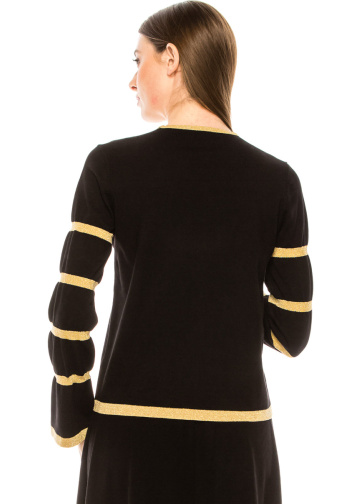 This sweater boasts a relaxed fit and elegant bell sleeves. The traditional style is updated with yellow stripes, adding a splash of color to the black background. Another benefit is that it's easy to mix and match it with various bottoms.