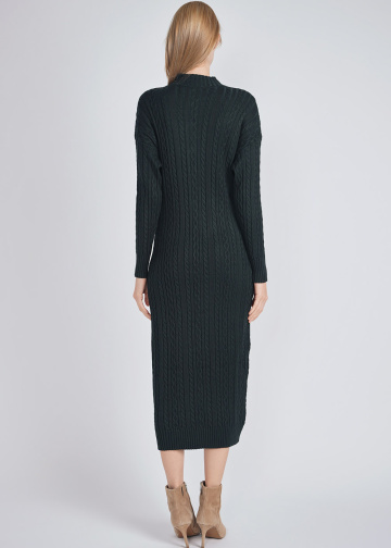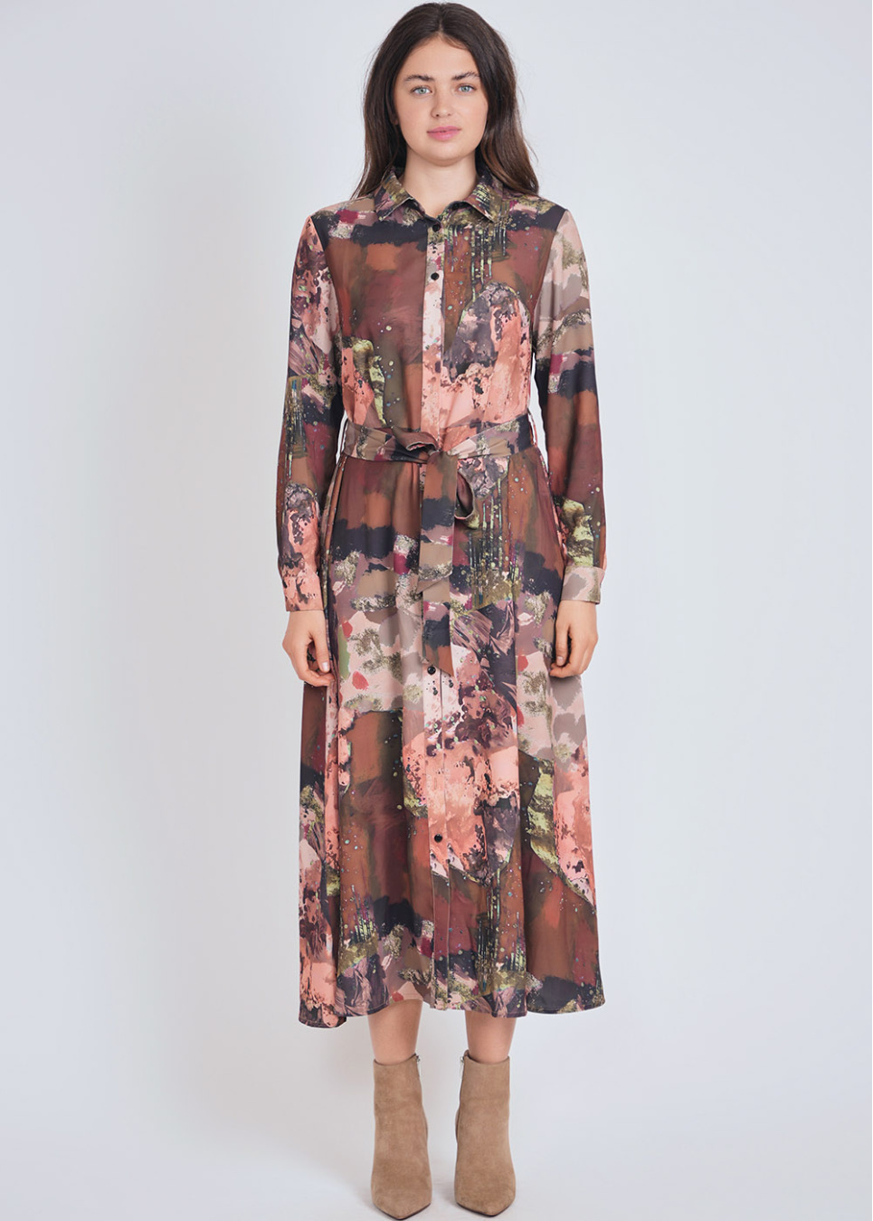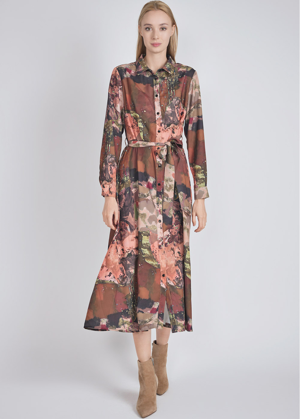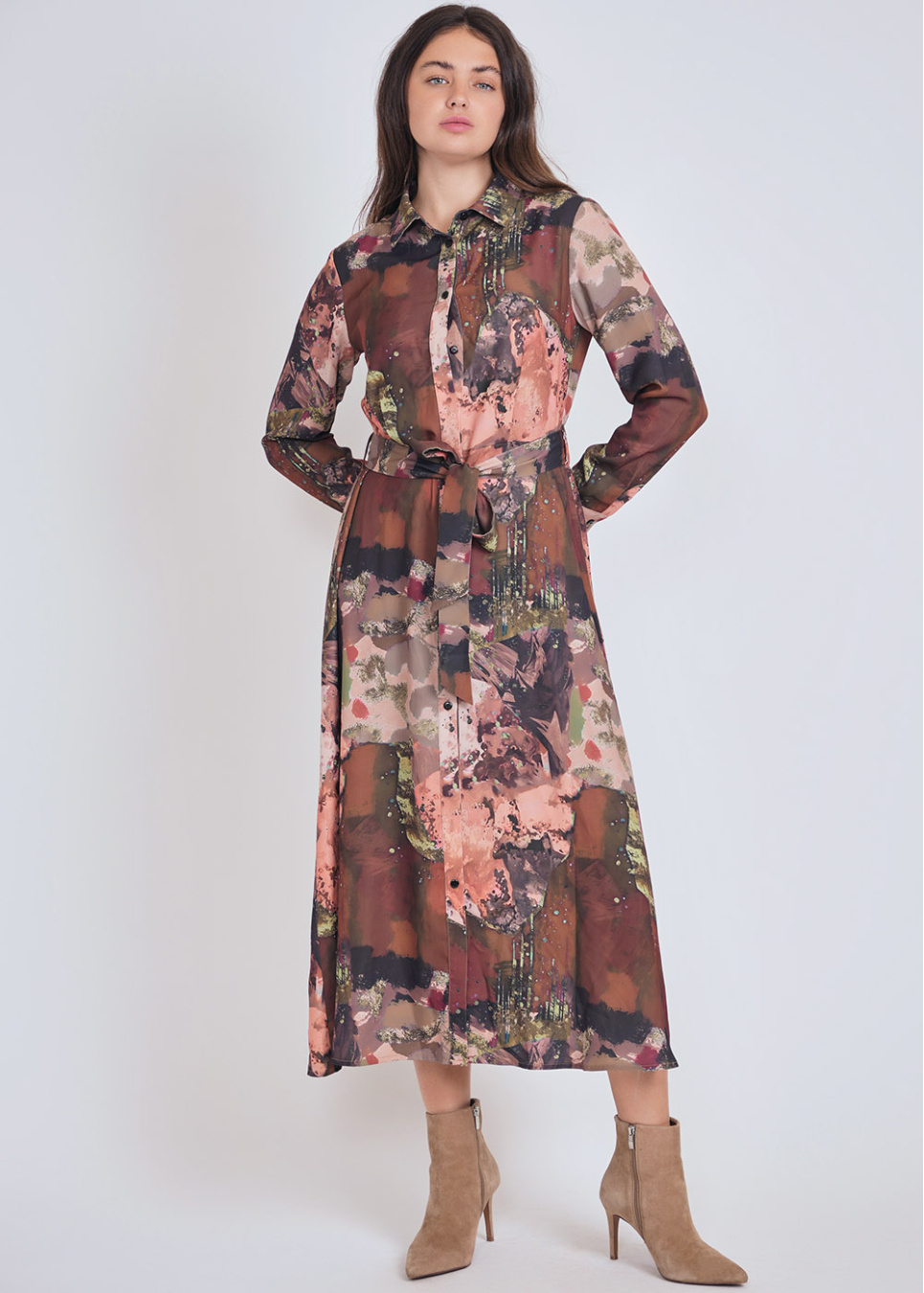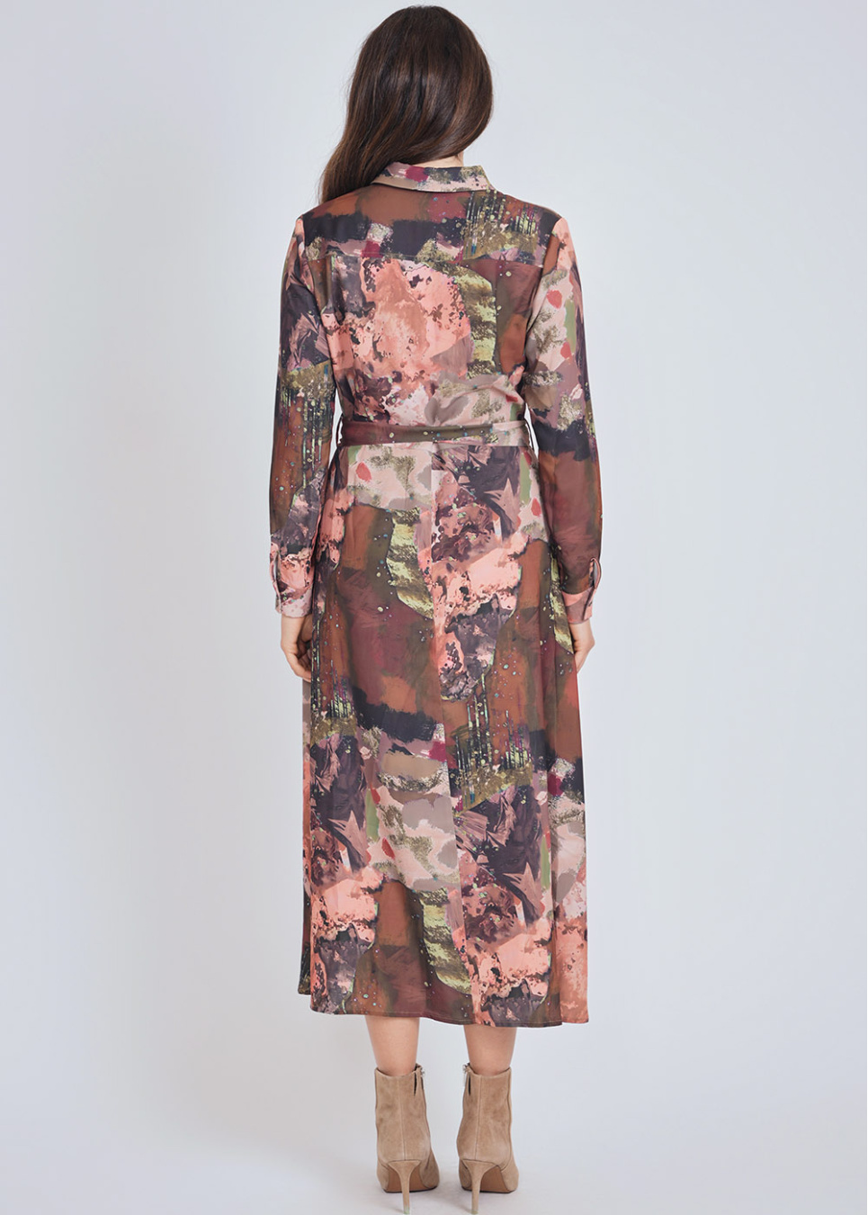 Belted Brown Dress with Abstract Print & Long Sleeves