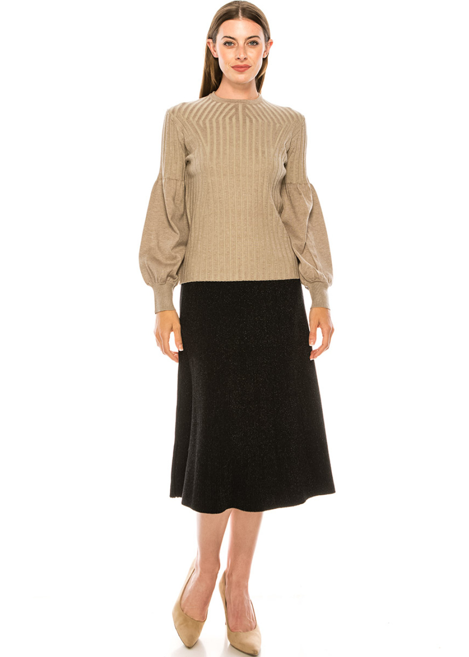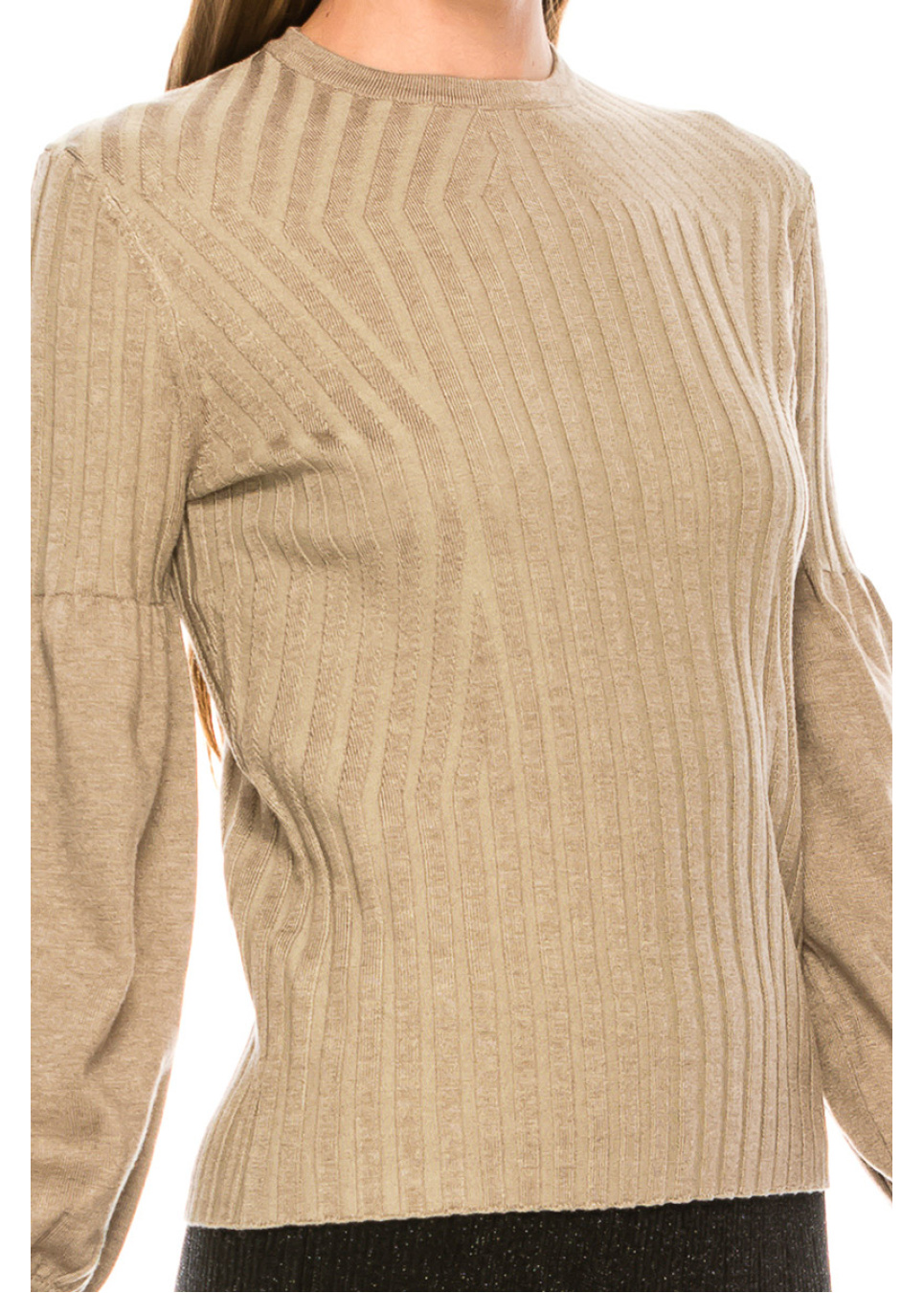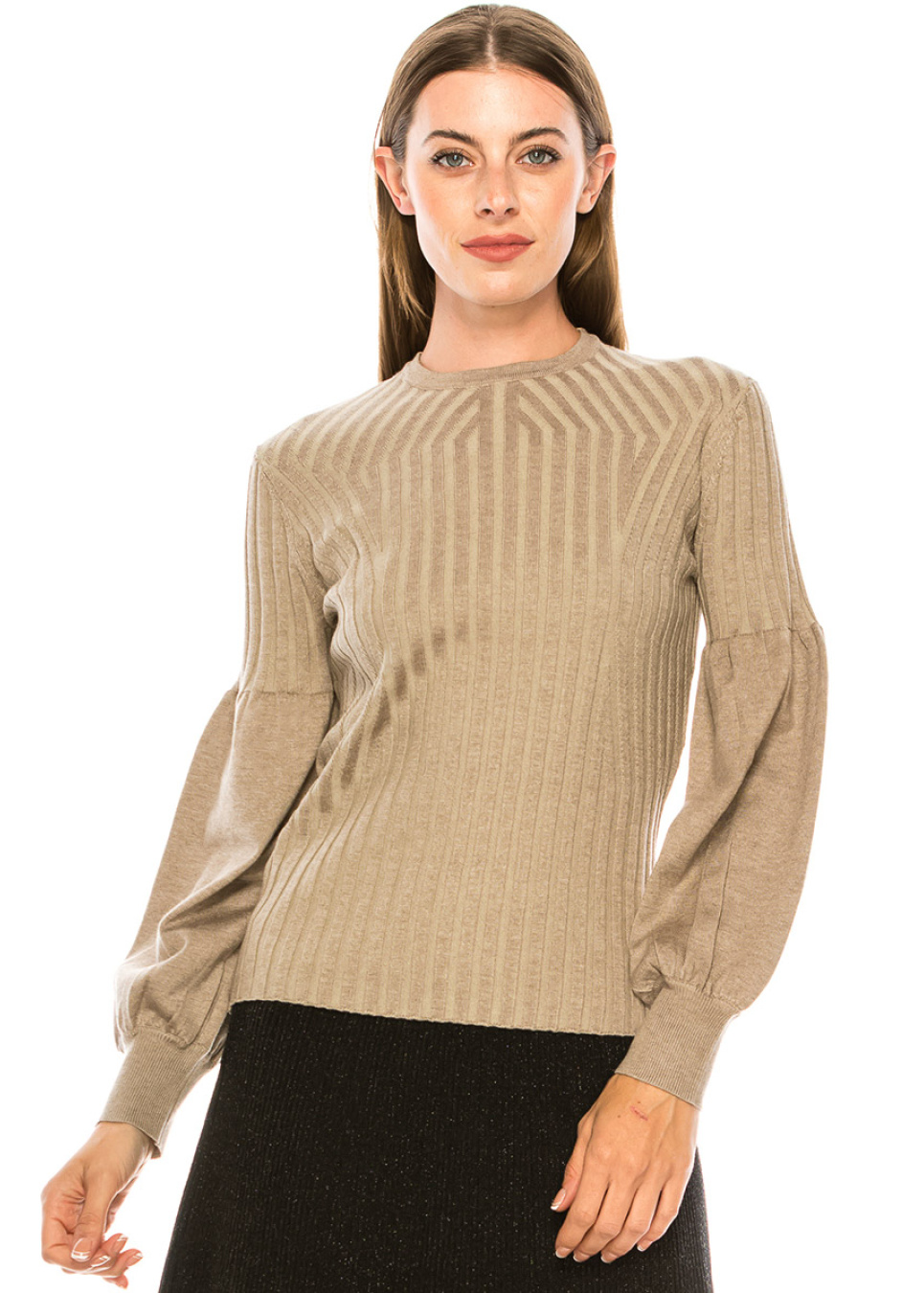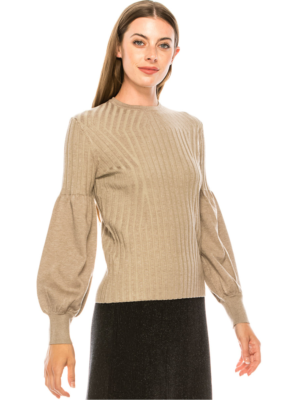 The sweater's basic hue, traditional design, and bishop sleeves give it a feminine look and charm. The ribbed texture adds comfort and ensures a snug fit.