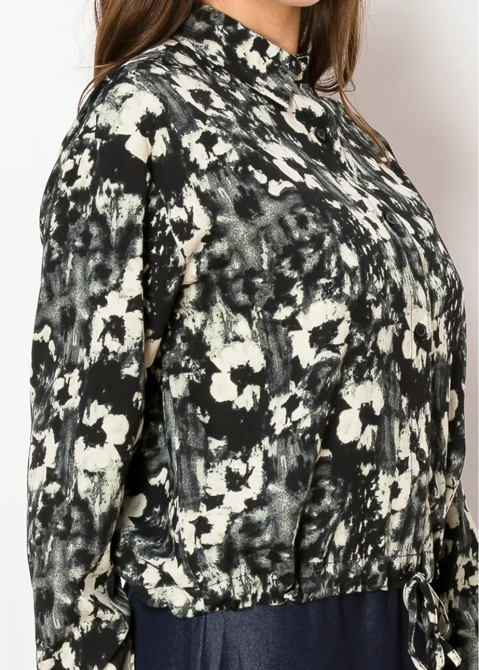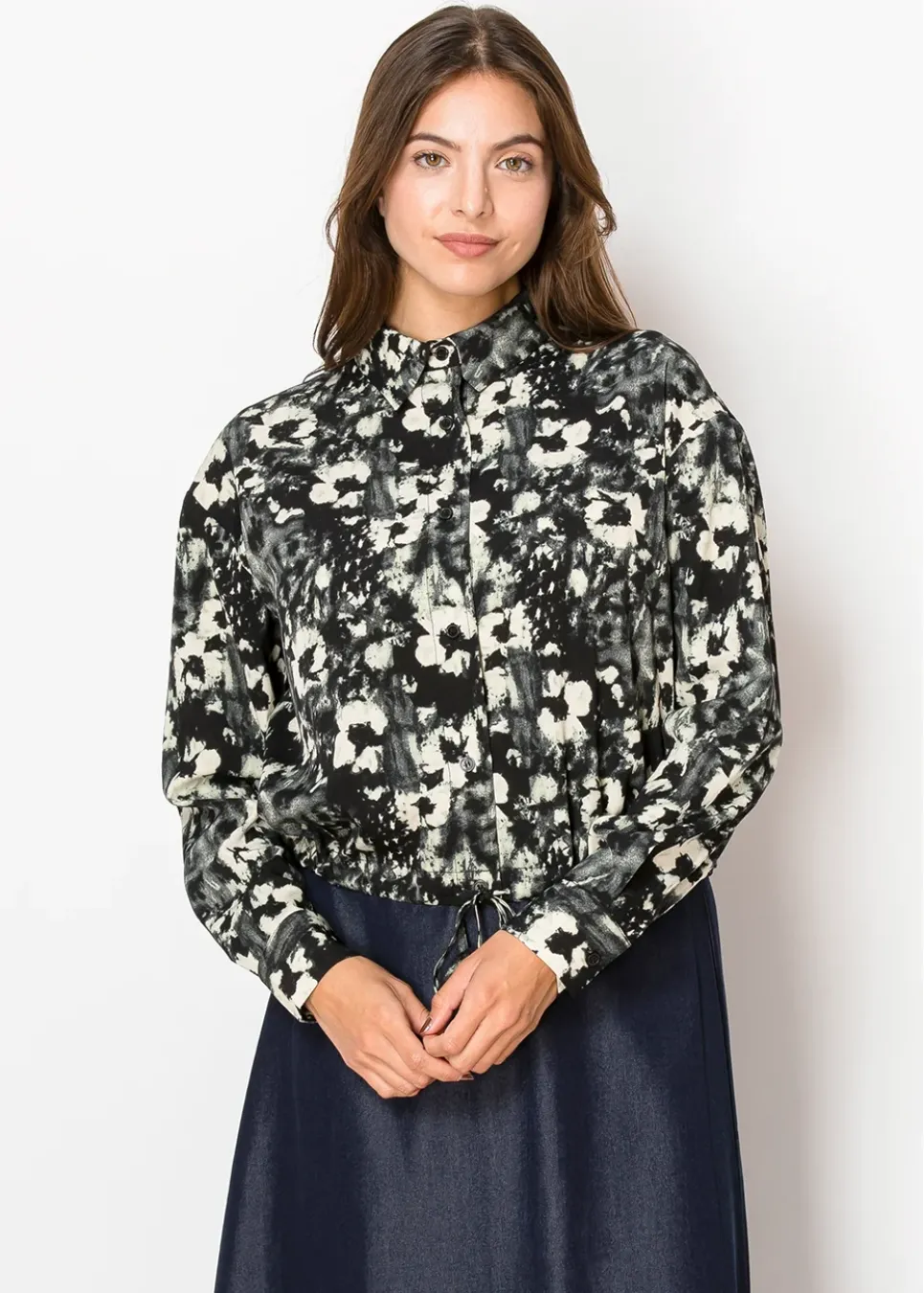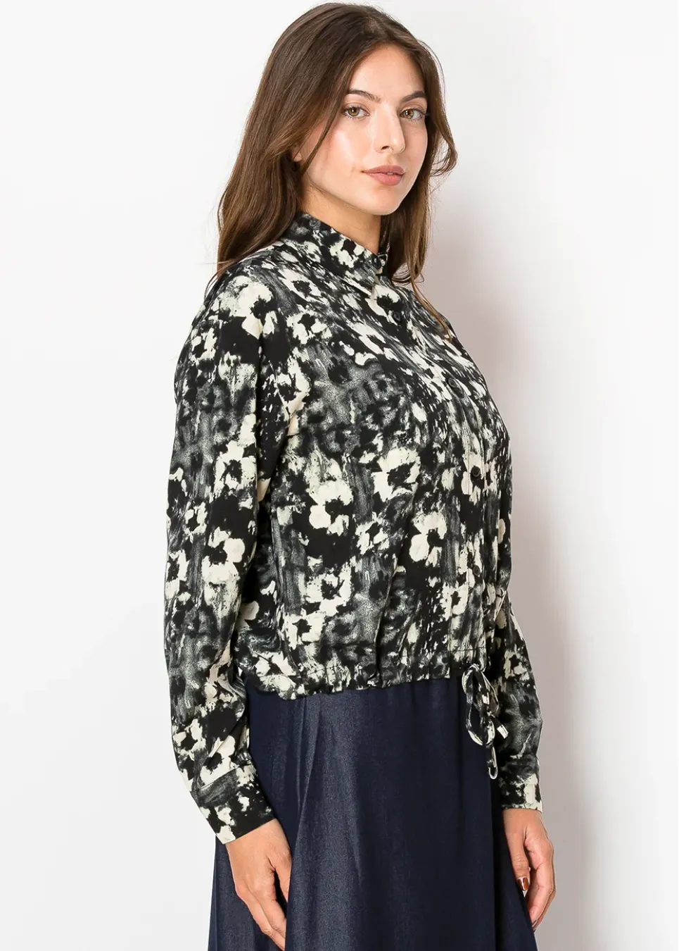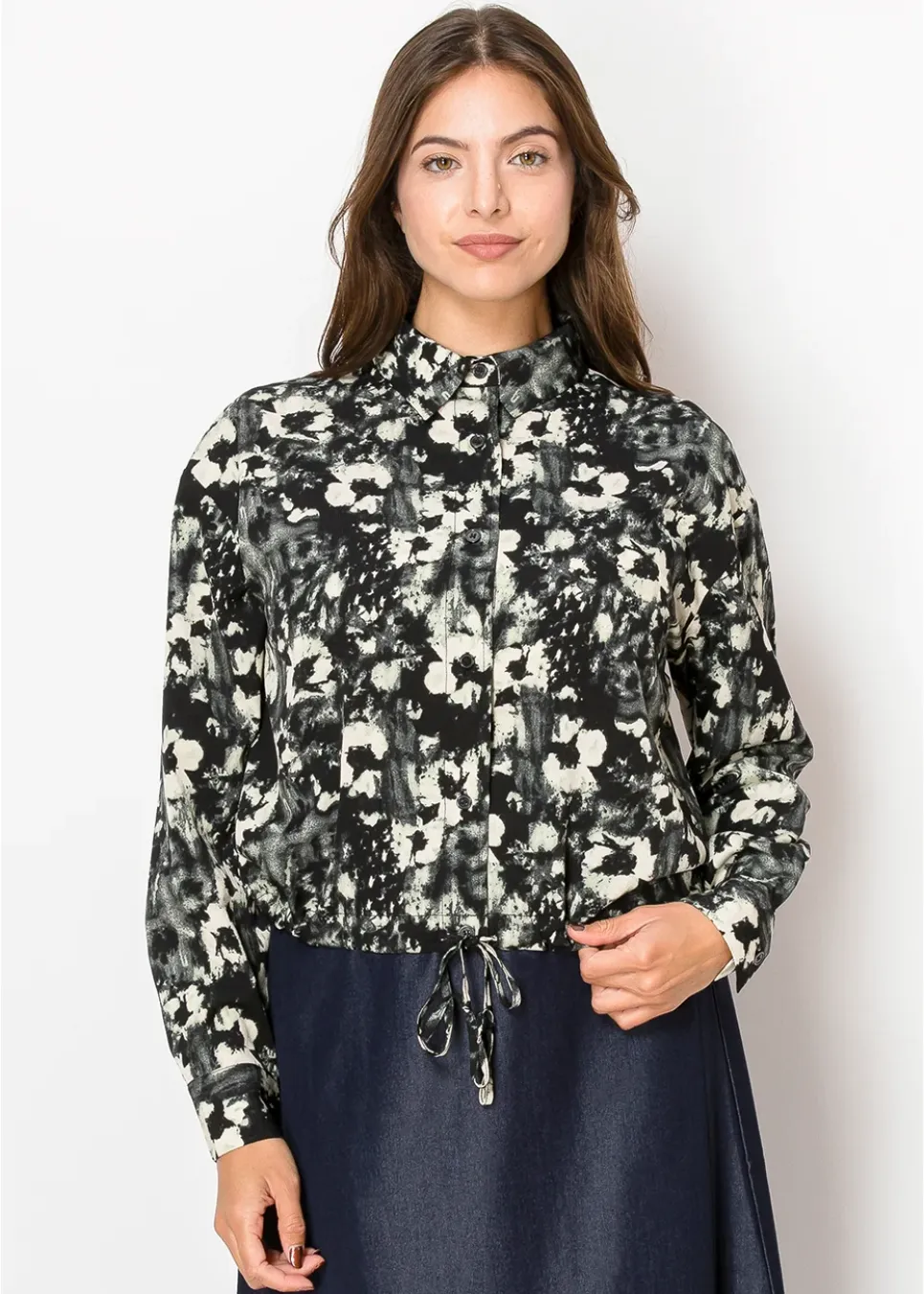 With its chic black base and ivory abstract design, this shirt stands out in the best way. The button-up style and drawstring hem provide a custom fit, making it easy to style for formal or casual occasions.