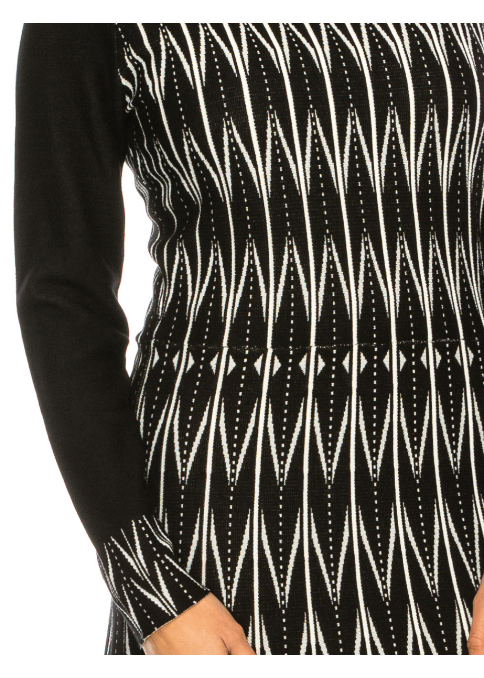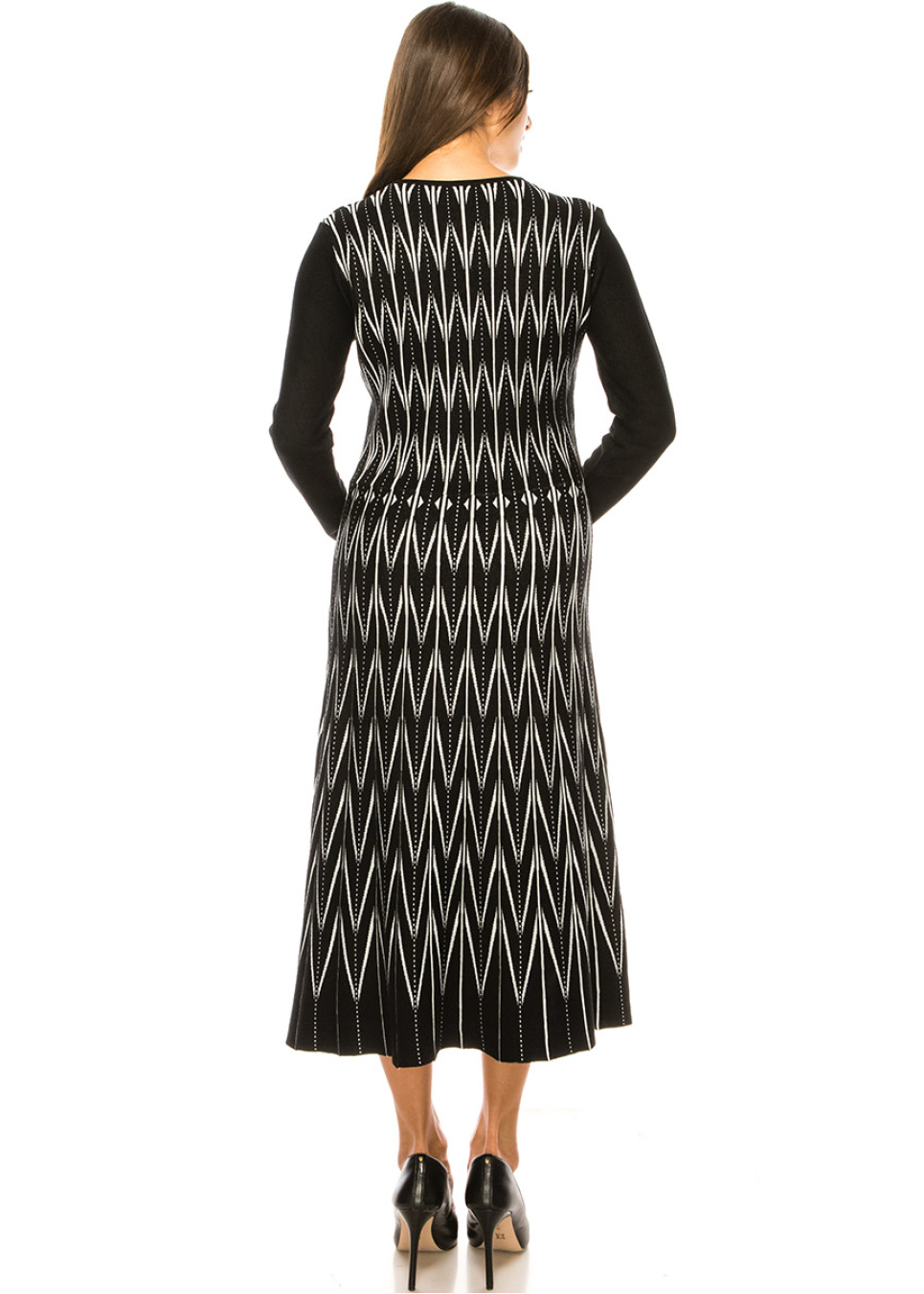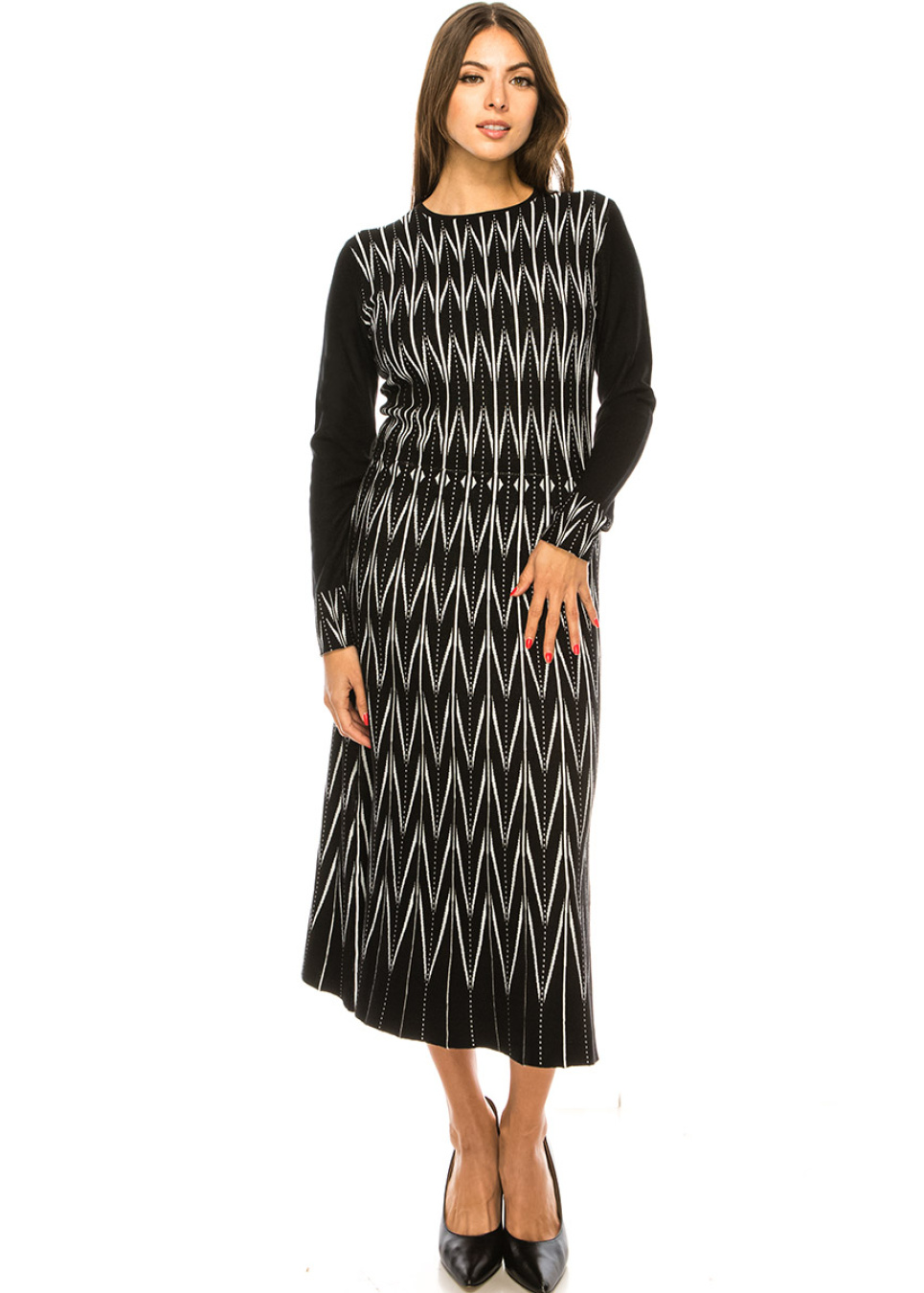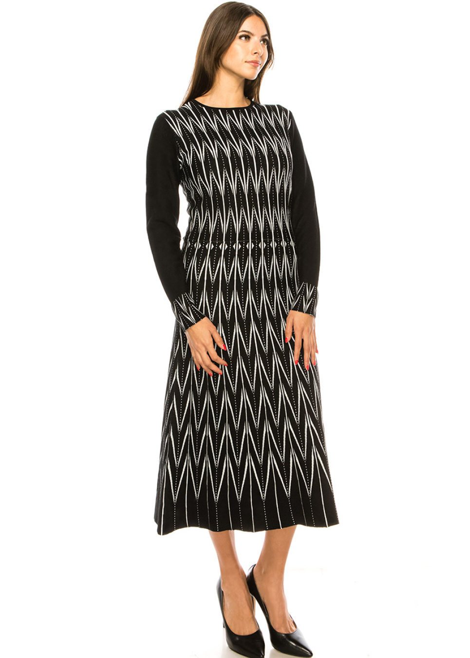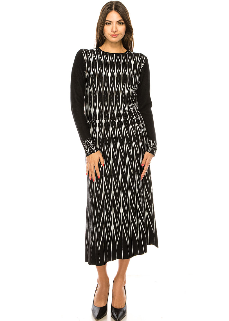 Step up your modest wardrobe game with this chic and sophisticated midi dress from YAL New York. The black color and round neck give it a timeless feel, while the white zig-zag patterns add a modern touch. The long sleeves and zig-zag cuffs are the perfect finishing touch to this stunning piece.