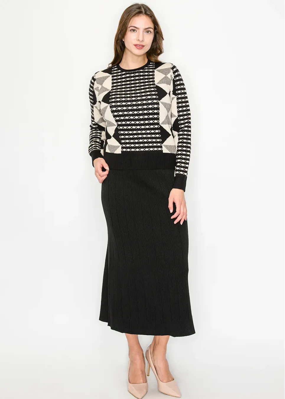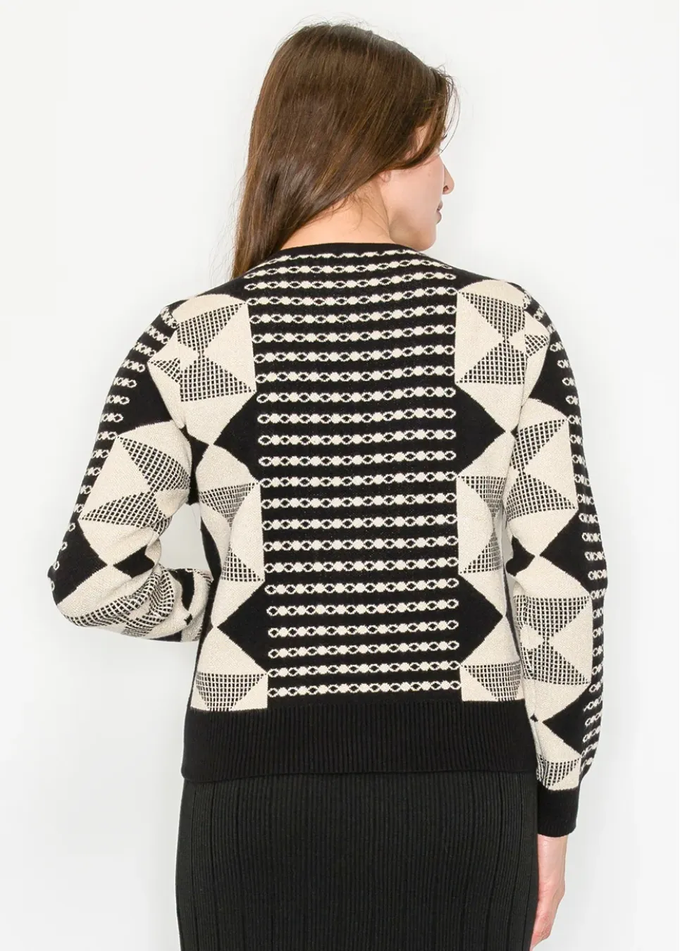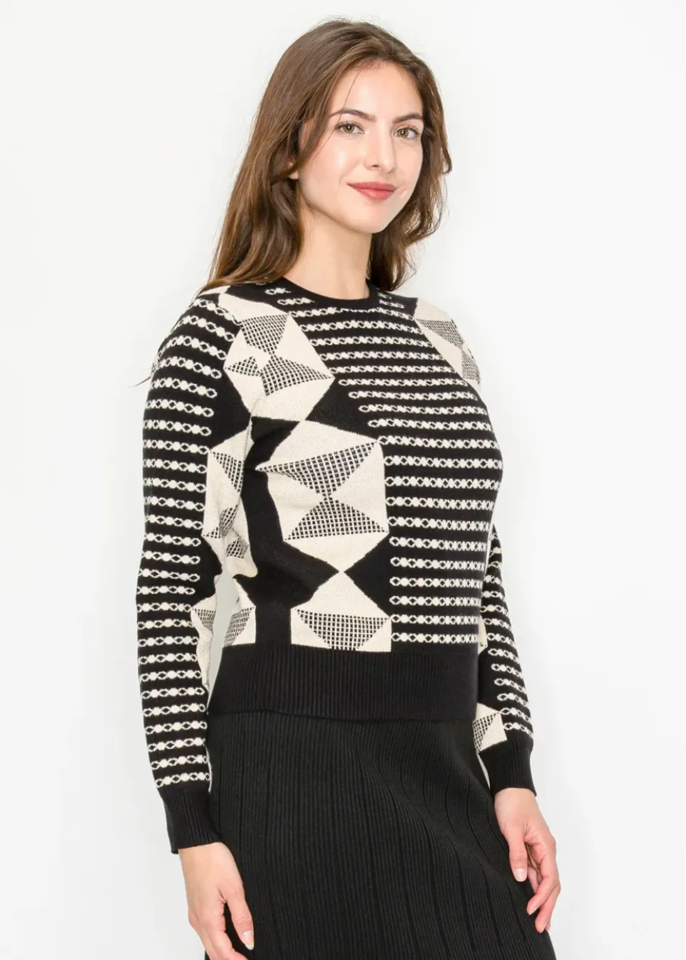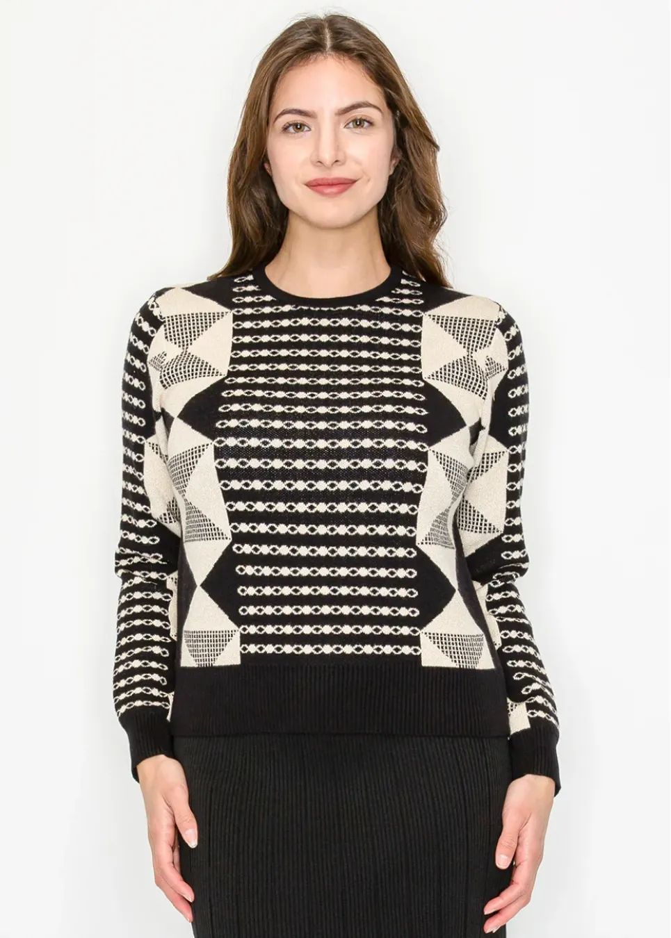 A bold mix of stripes and diamond shapes gives this soft knit sweater a striking, modern look. Designed for all-day comfort, it’s finished with a classic crew neck and ribbed trim for easy layering.