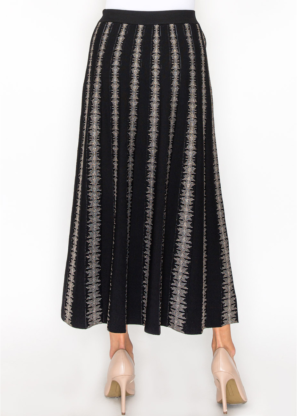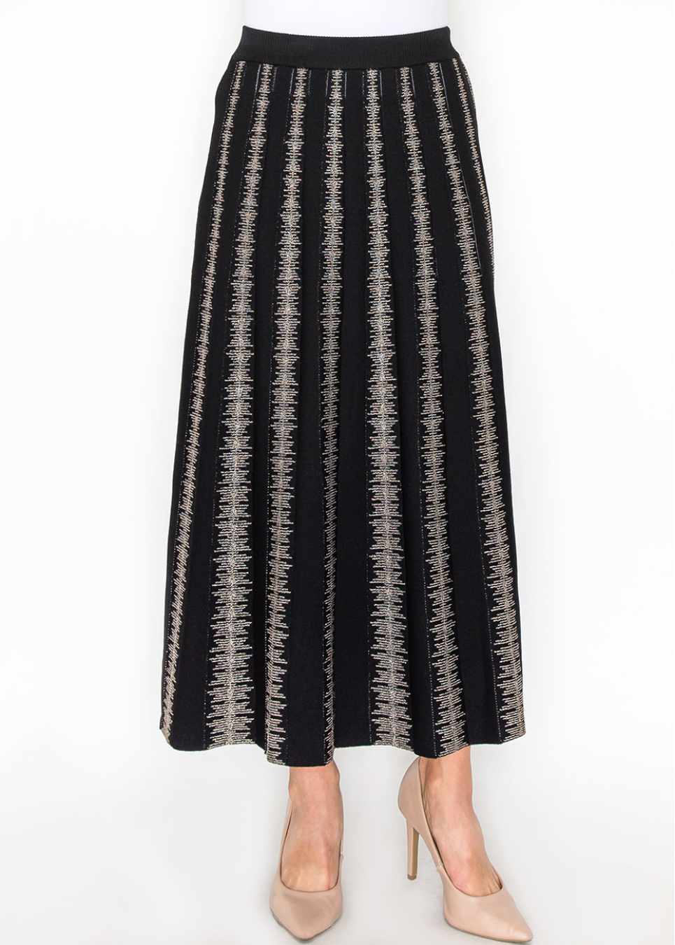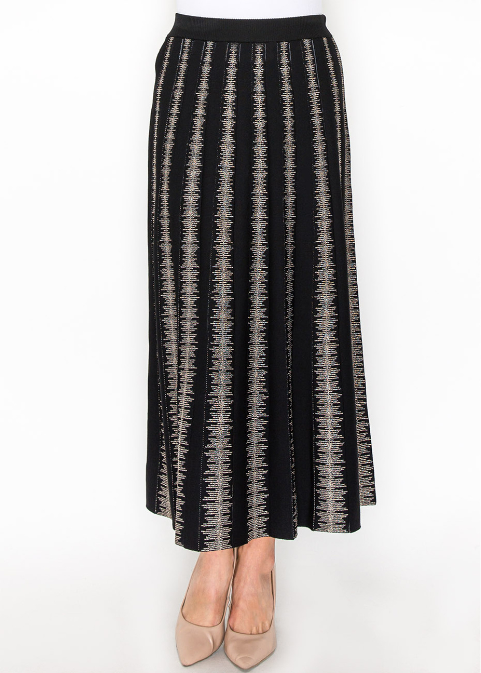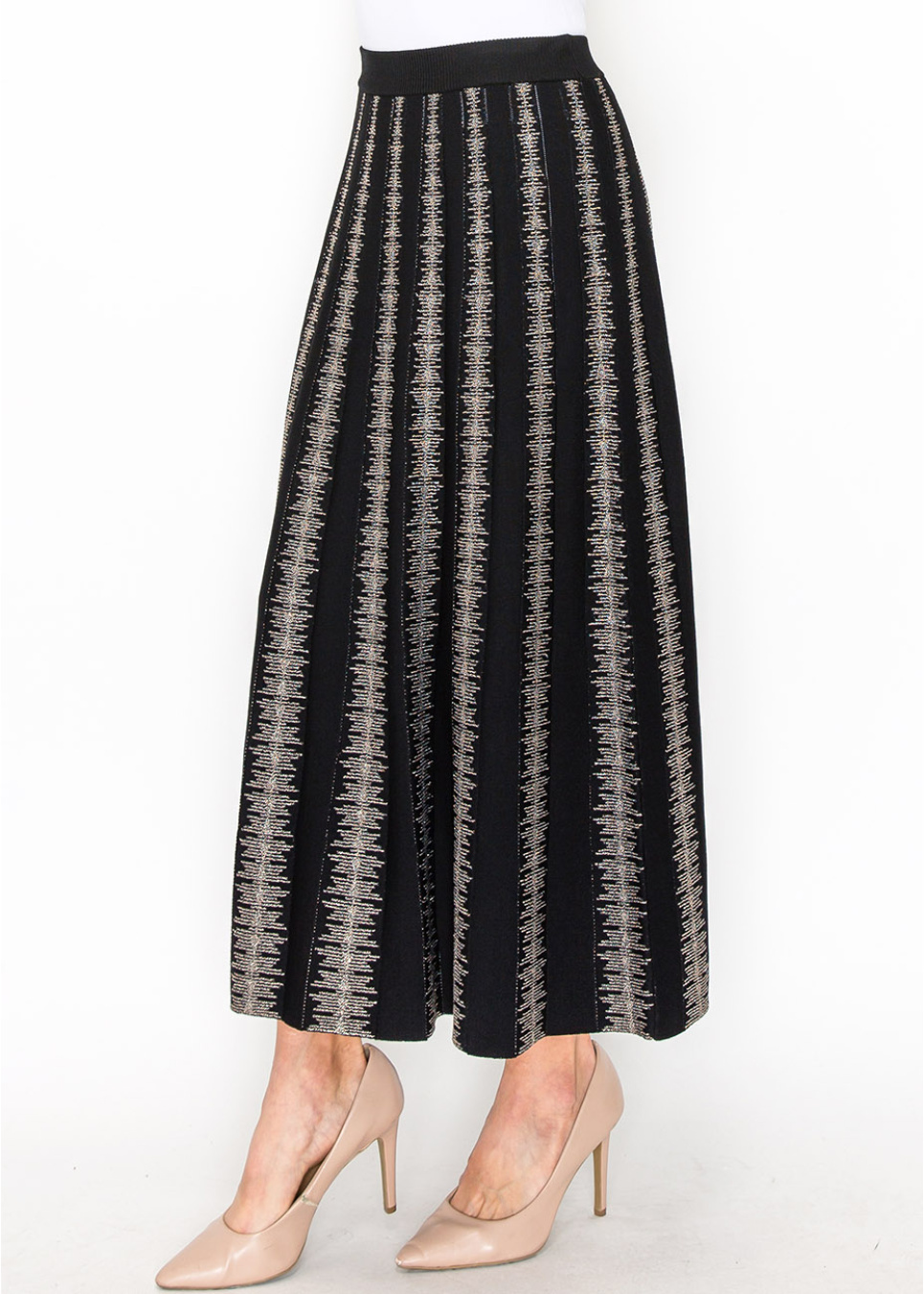 A stunning blend of classic black and shimmering gold, this skirt is perfect for those looking for a modest yet stylish piece. The vertical stripes elongate the figure, while the A-line cut provides a modest and elegant fit. The soft waistband adds to the overall comfort.