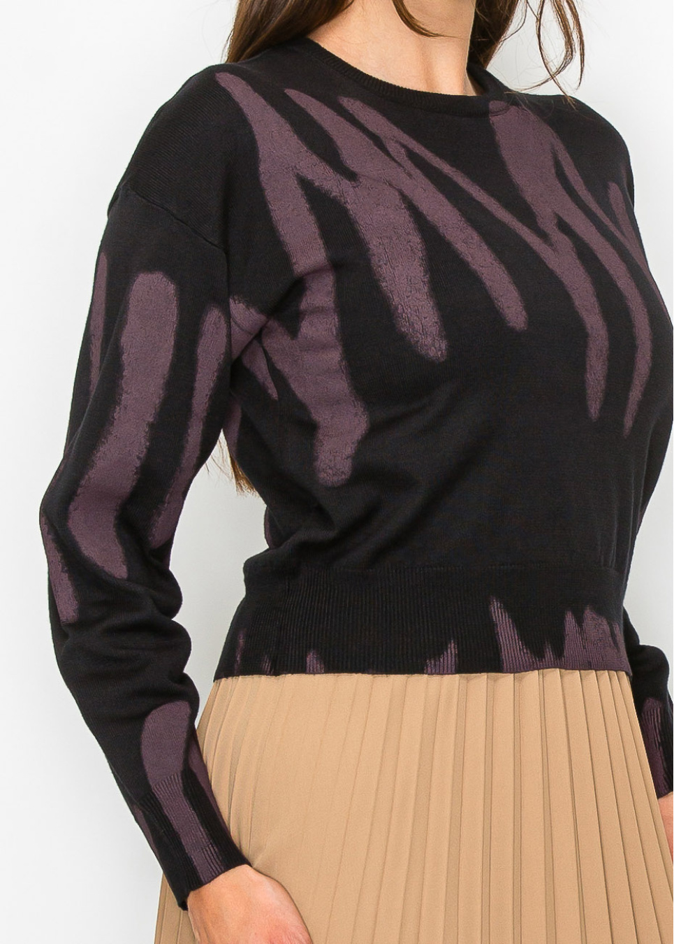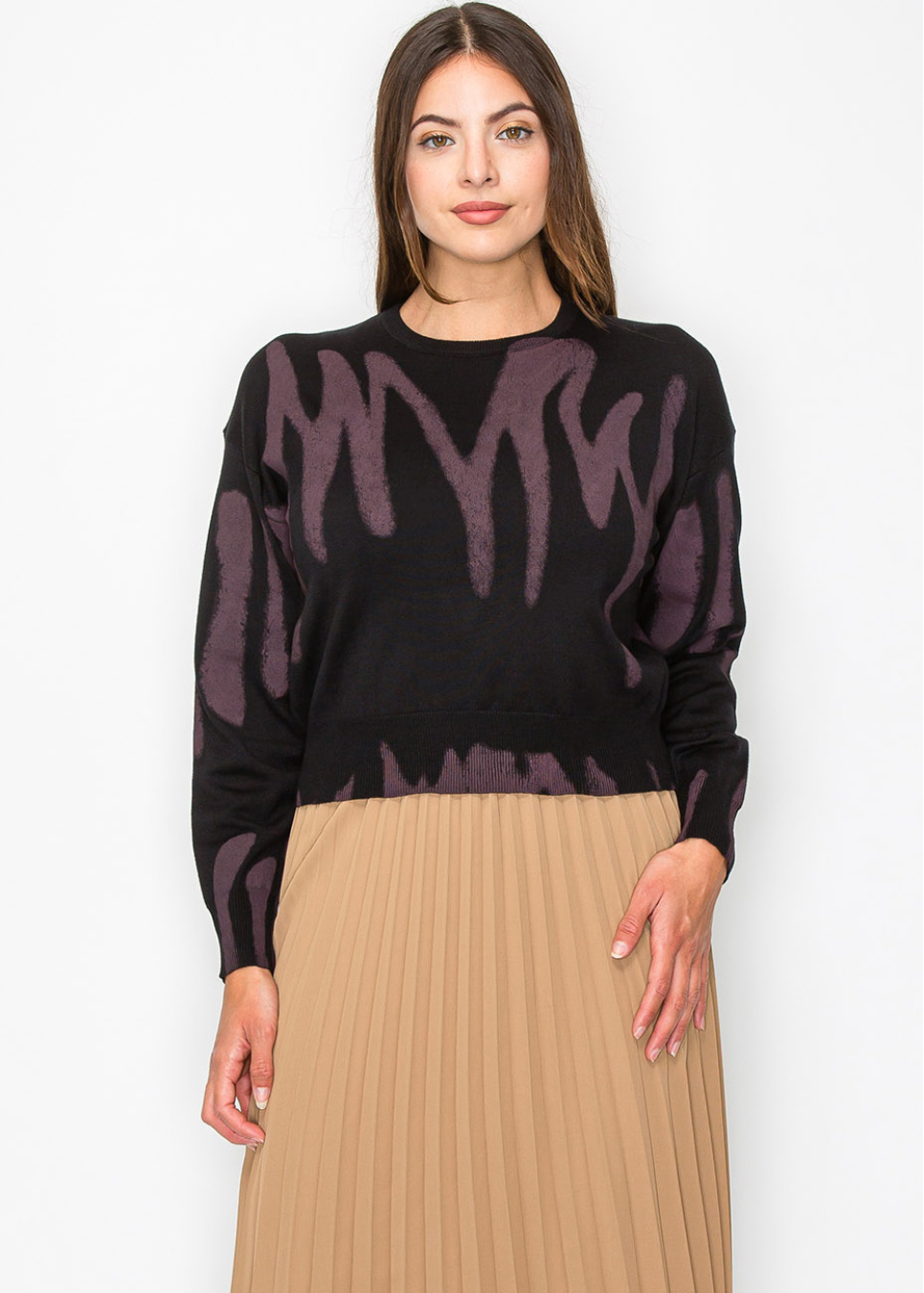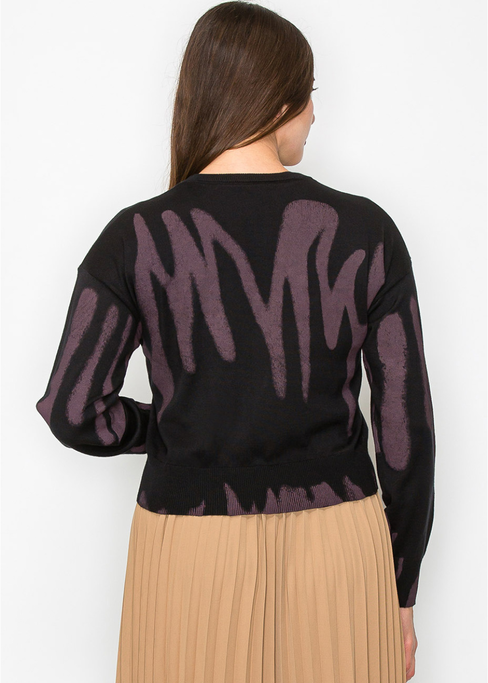 This black sweater with a mauve abstract pattern is a unique piece for your wardrobe. The dropped shoulder design gives it a relaxed feel, making it easy to pair with a modest skirt for a comfortable and stylish outfit.