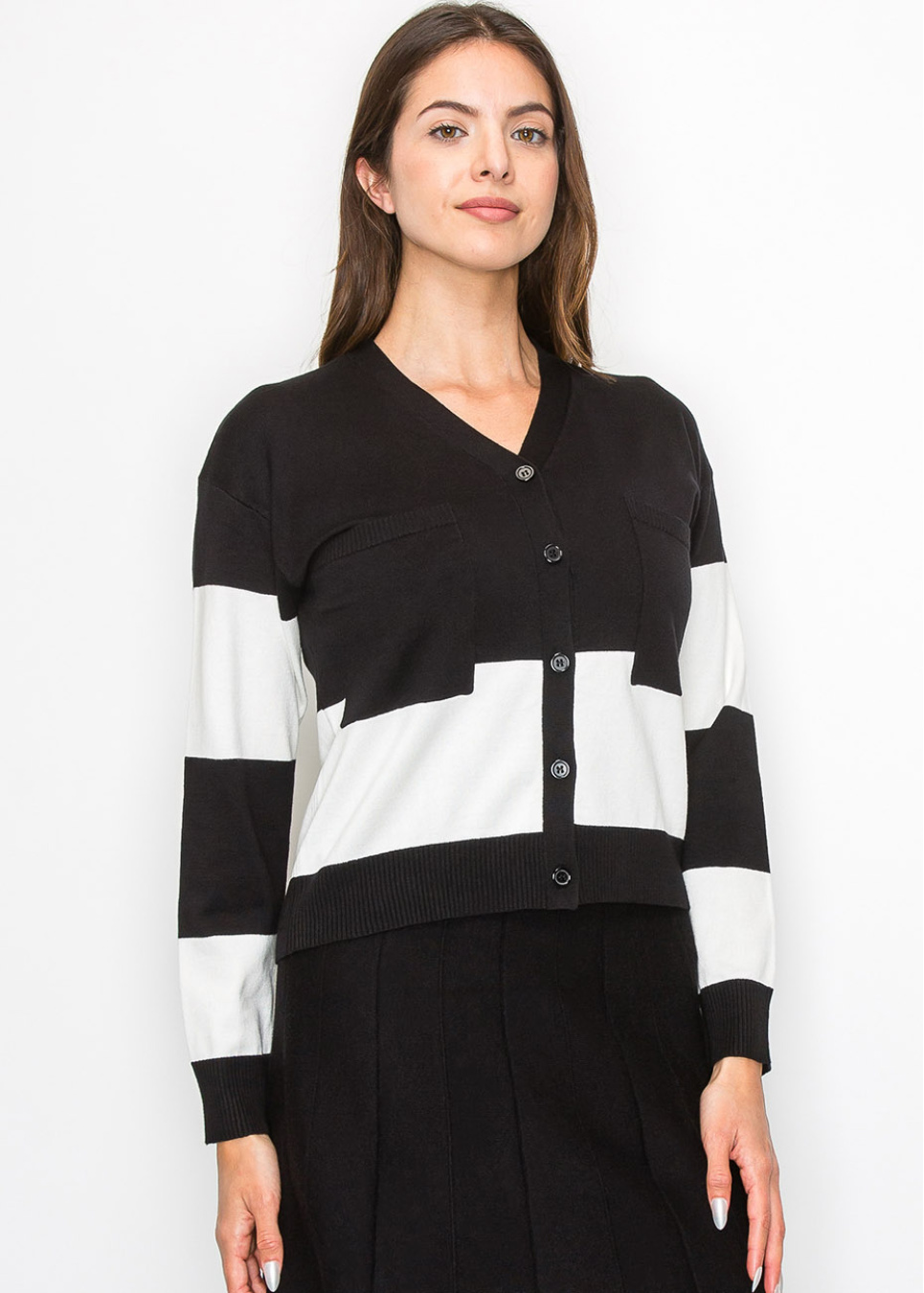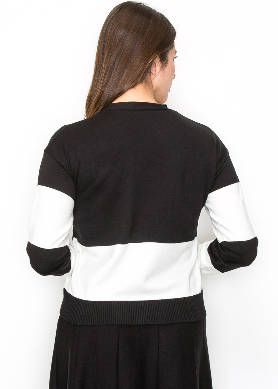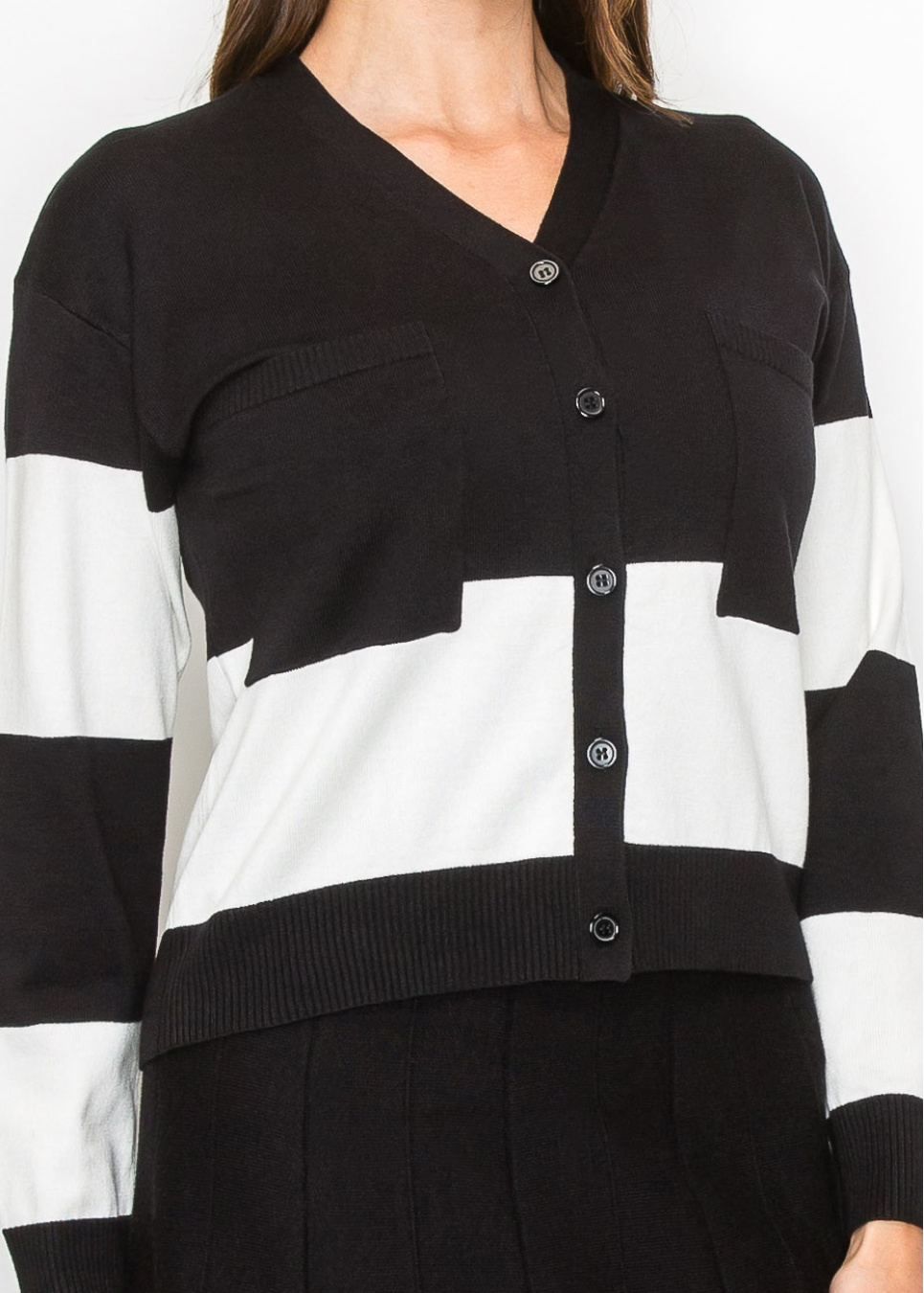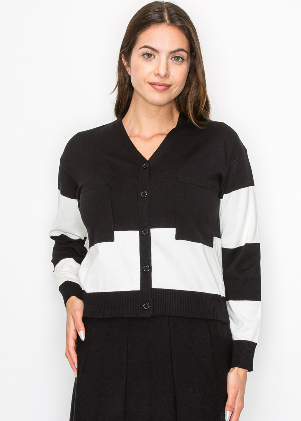 Simple yet striking, this cardigan’s black and white contrast makes it an easy go-to for any day. The button-down front and ribbed hem create a clean, polished look, while the long sleeves provide full coverage for a modest style.