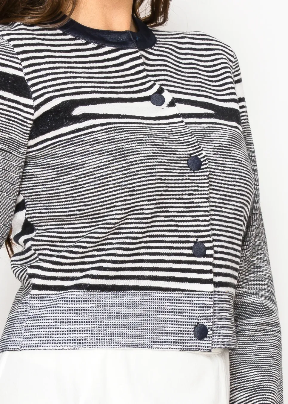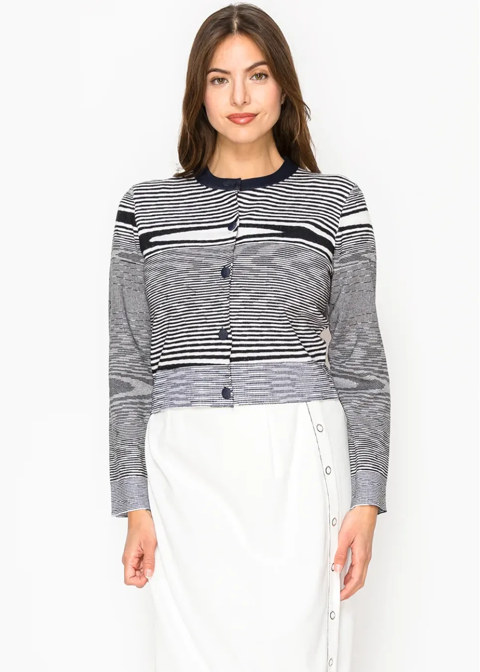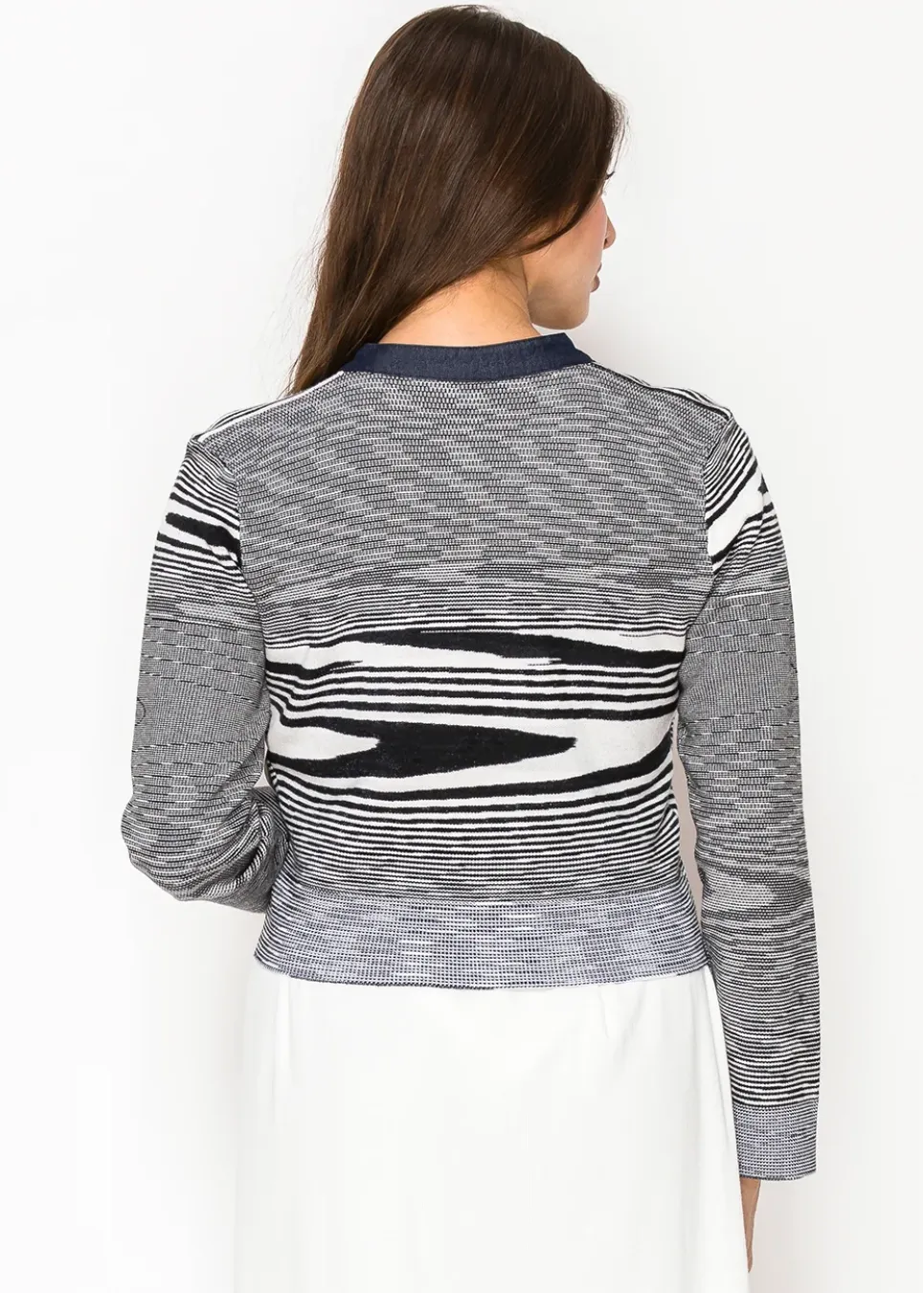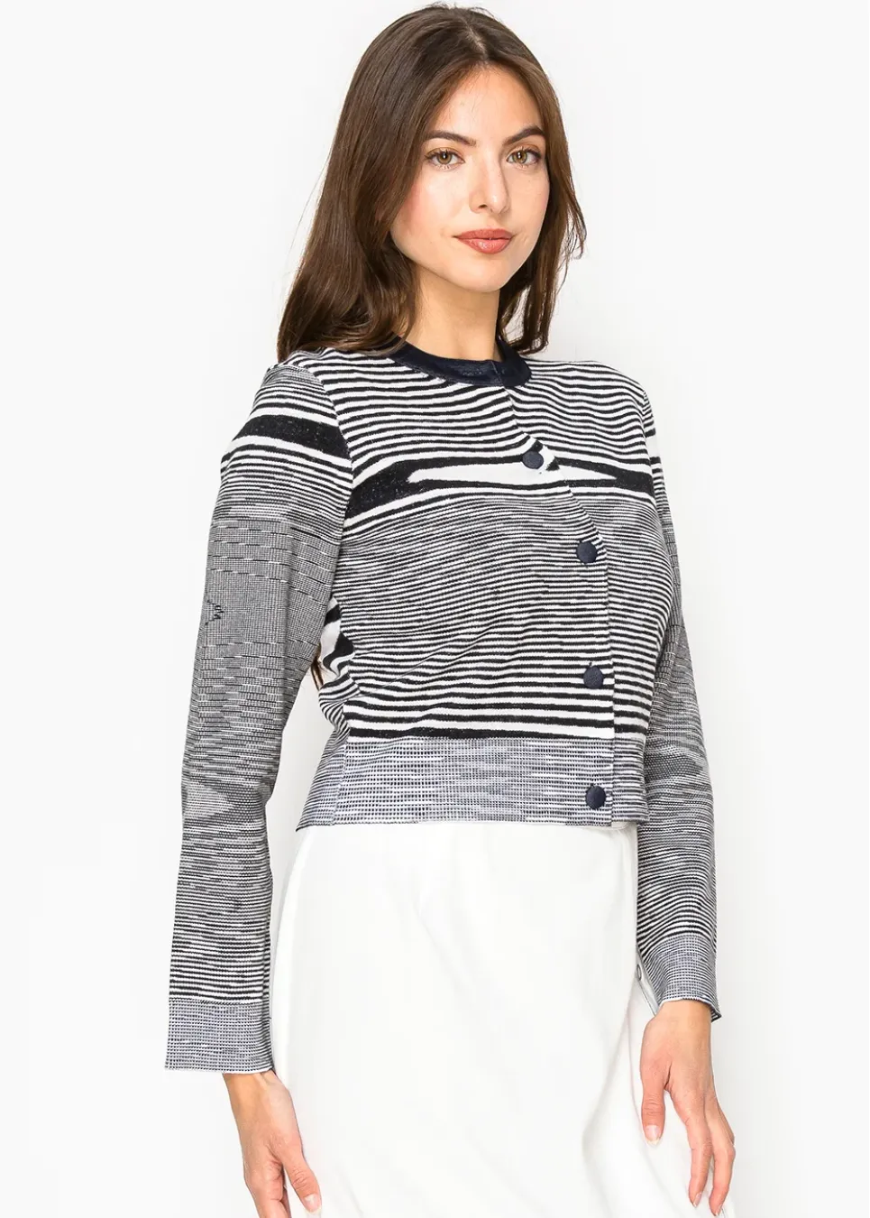 Inspired by flowing water, this cardigan’s dynamic ripple design adds movement and sophistication to your wardrobe. The fitted silhouette and button closure make it a versatile piece for any occasion.