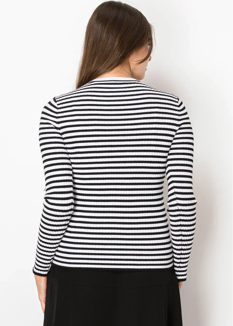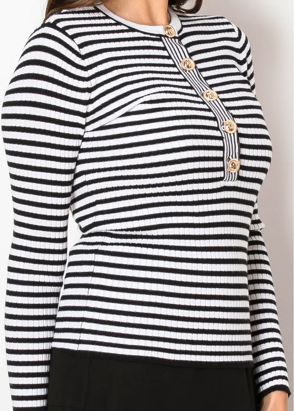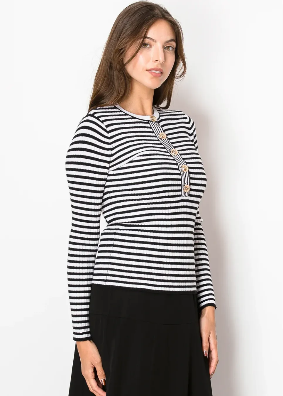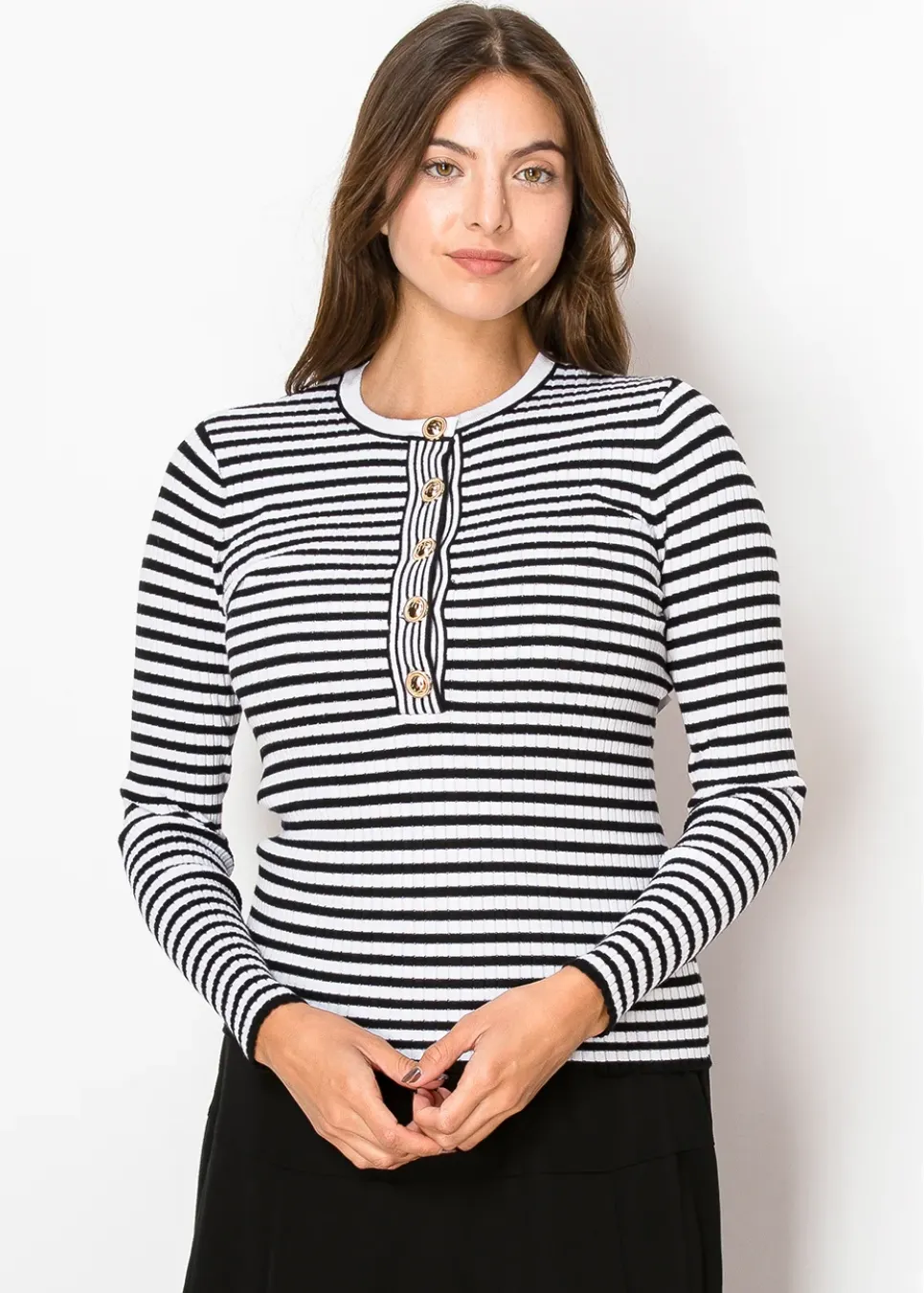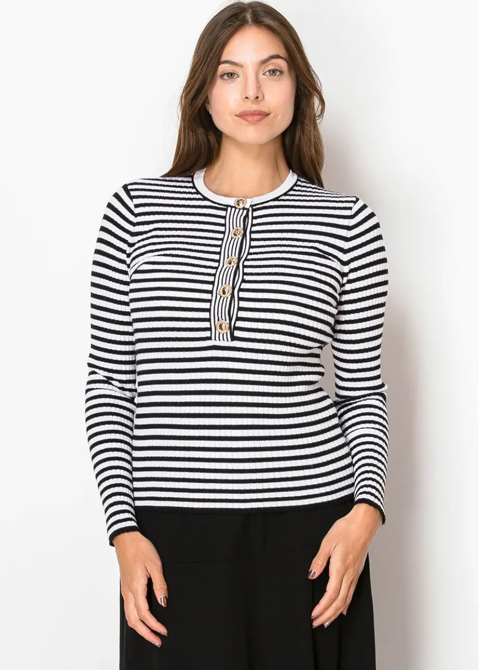 A little preppy, a little timeless—this striped sweater is effortlessly chic. The black and white contrast is bold but easy to wear, and the decorative button placket adds a unique detail.